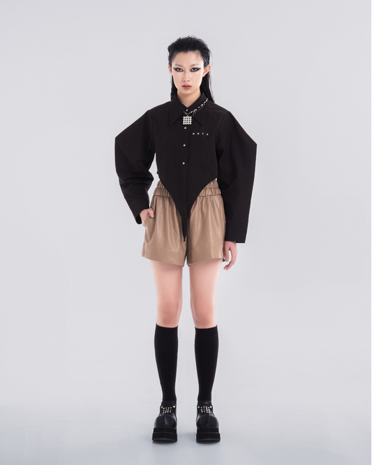 CNY SHANI CHINESE COLLAR METAL CLASP HOLLOW TOP - BROWN