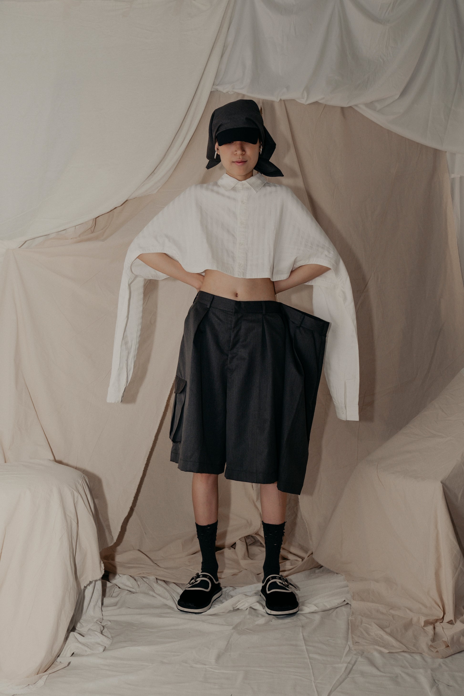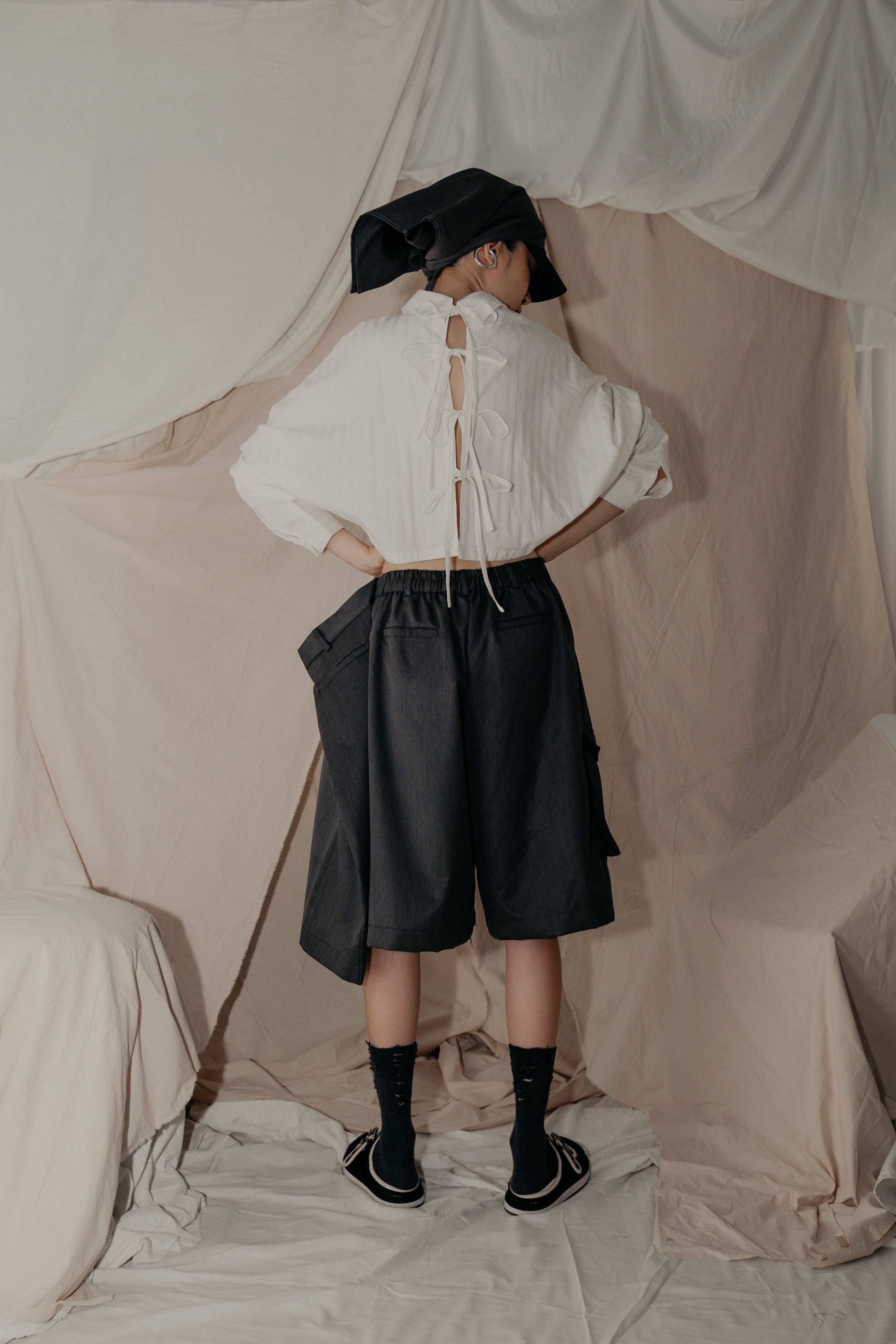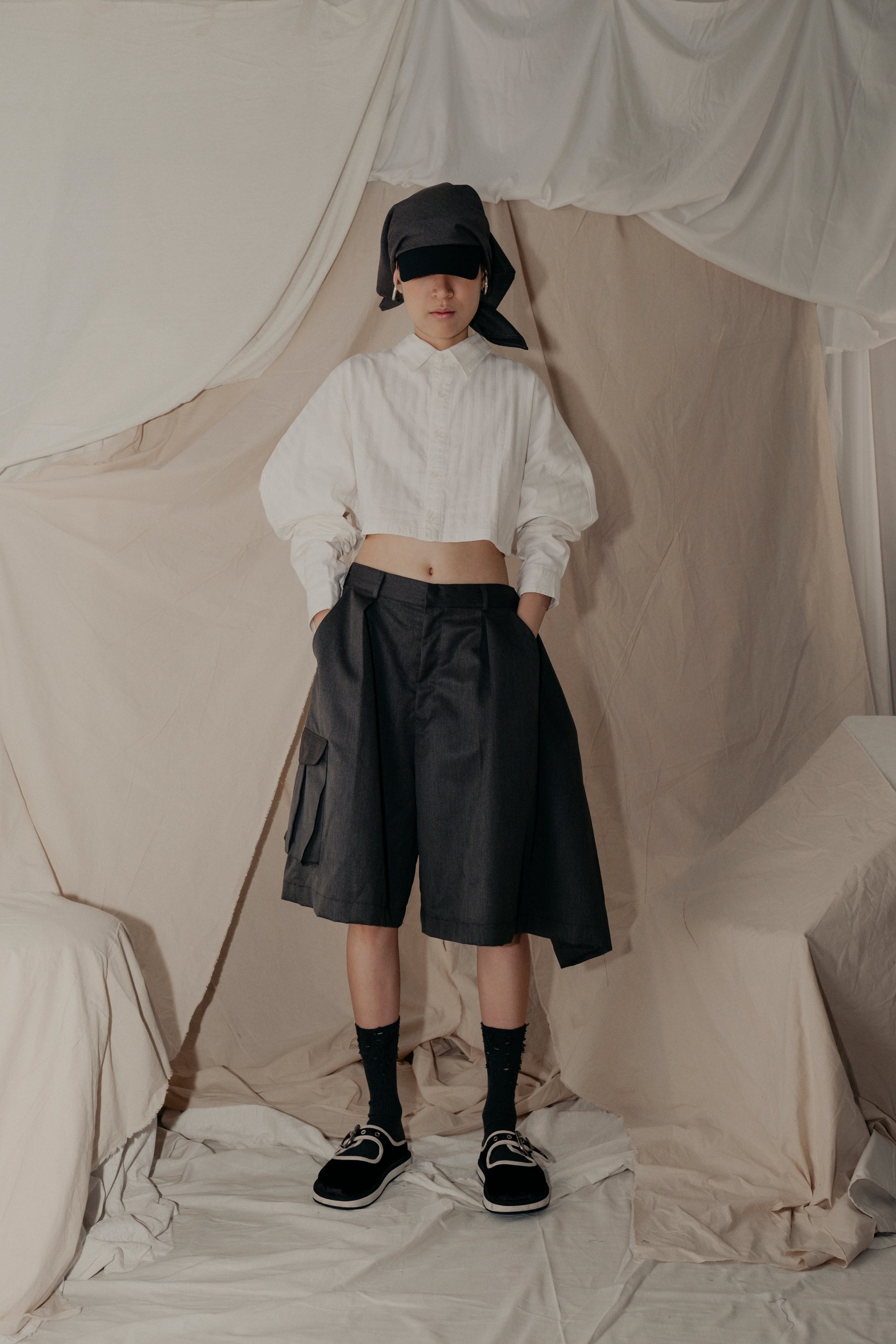 The 3 Kaki Kongfu Pants Shorts feature a unique design with three cutting parts, three front pockets, three back welt pockets, and a box pleat flap pocket on the right side. These shorts are perfect for casual or semi-casual wear, offering versatile styling options for any occasion.