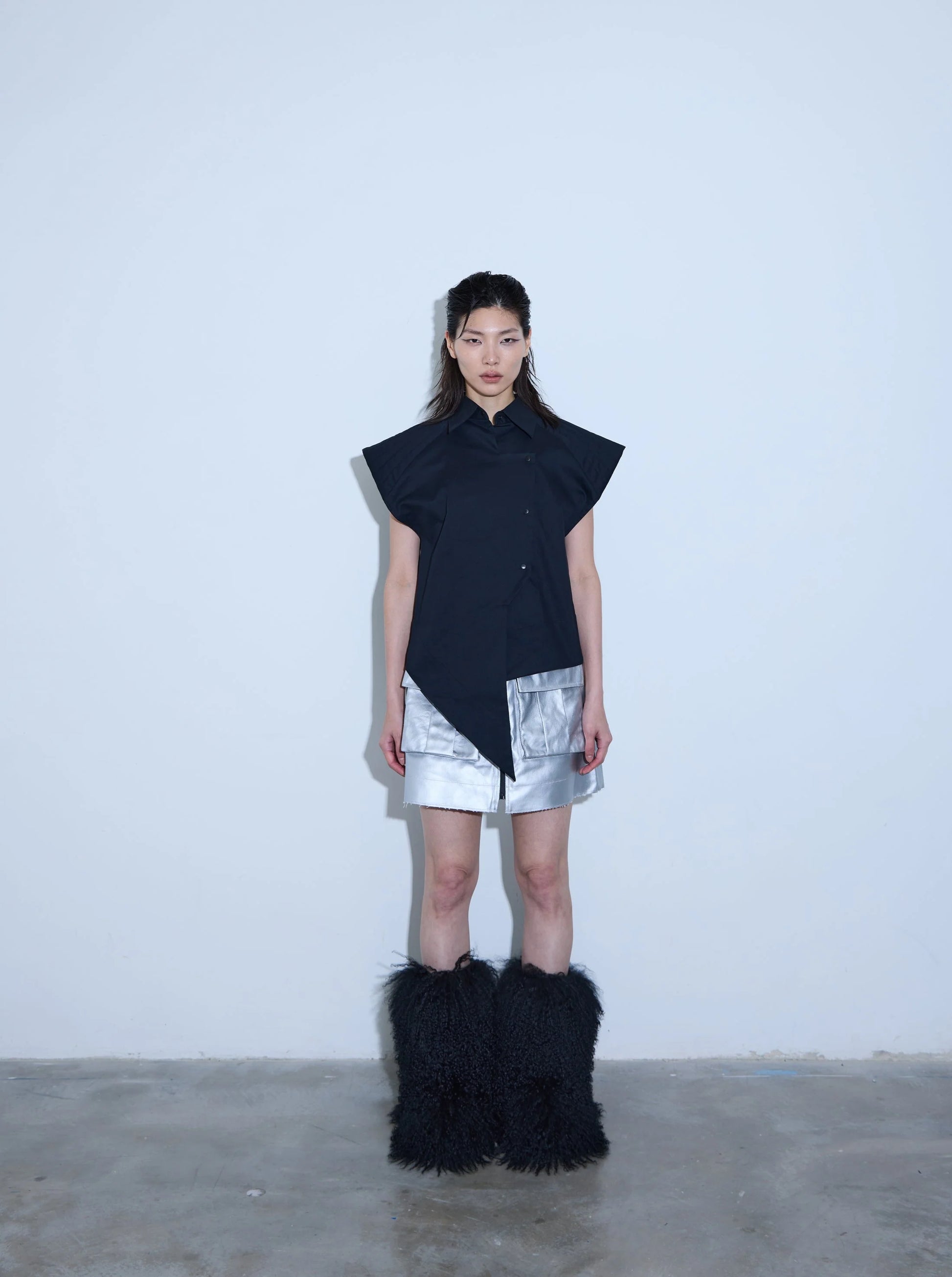 The A-JANE Xennic Pointed Shirt boasts a uniquely designed quilted shoulder top, asymmetrical hem, and a slit at the back for optimal air flow. Additionally, snap buttons provide convenient openings for wearing ease.