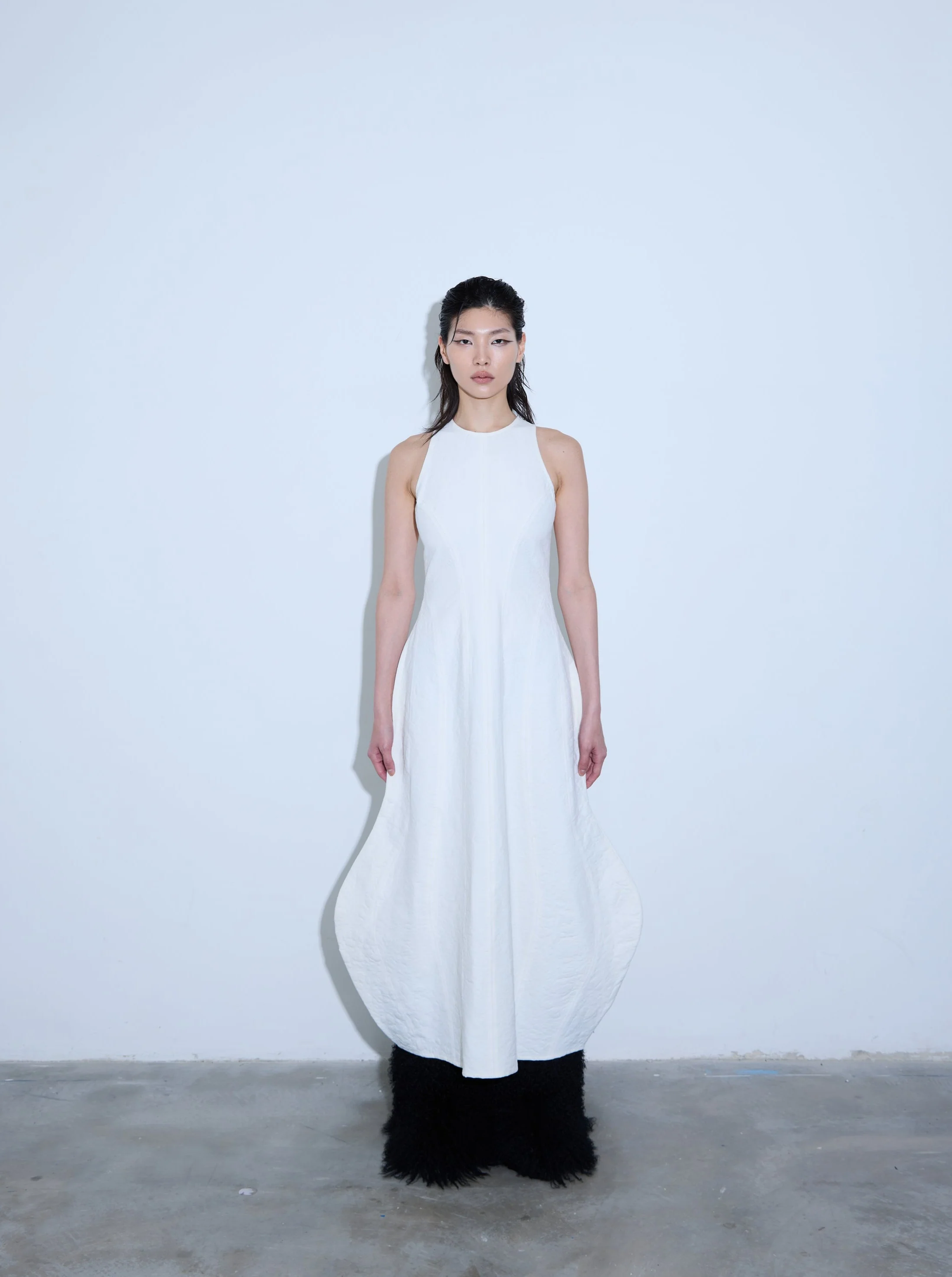 The Xenn Sculptural Dress. Inspired by the abstract visuals of a soundwaves, it features a wavy silhouette, round neckline and invisible on the back, made in textured cotton.