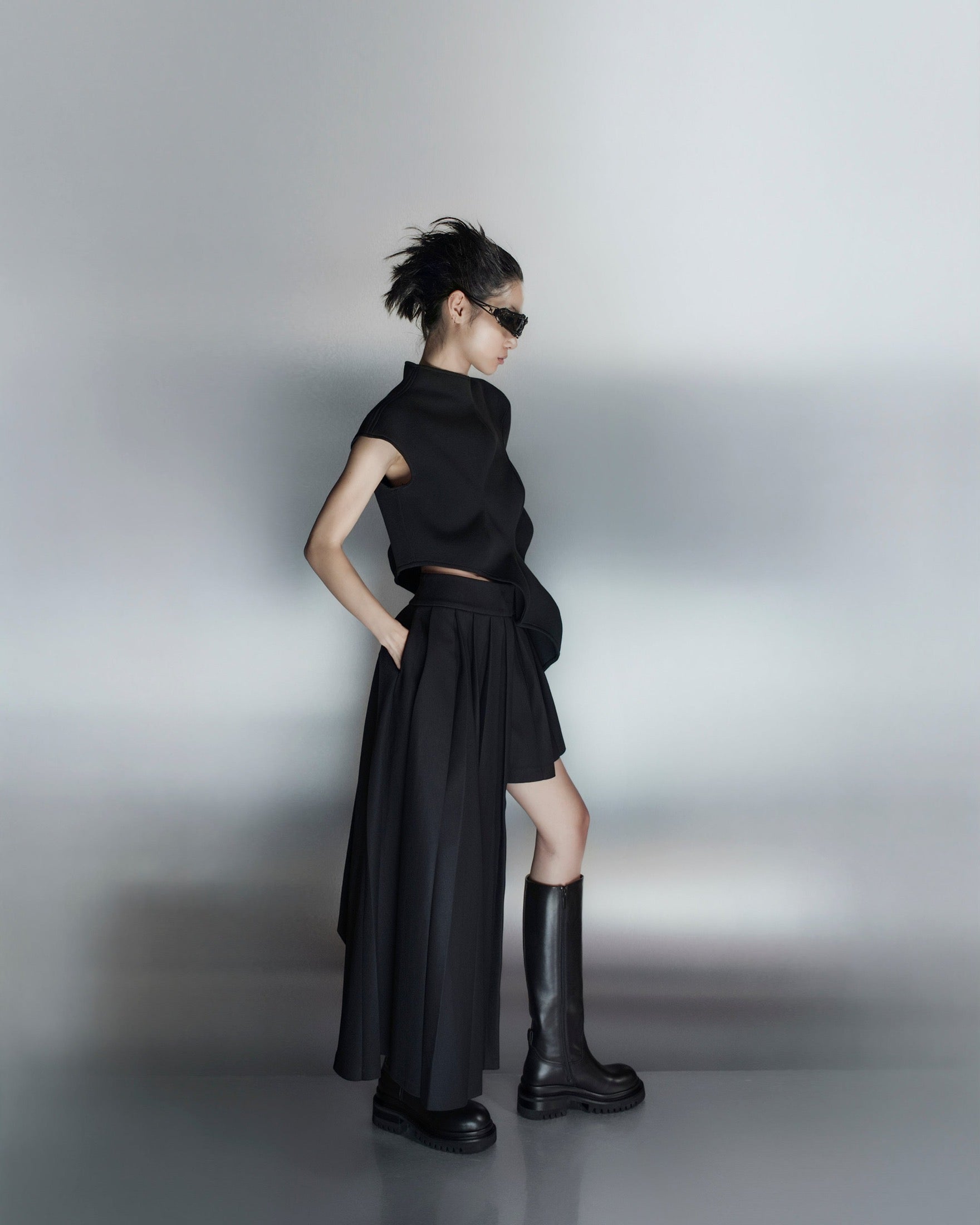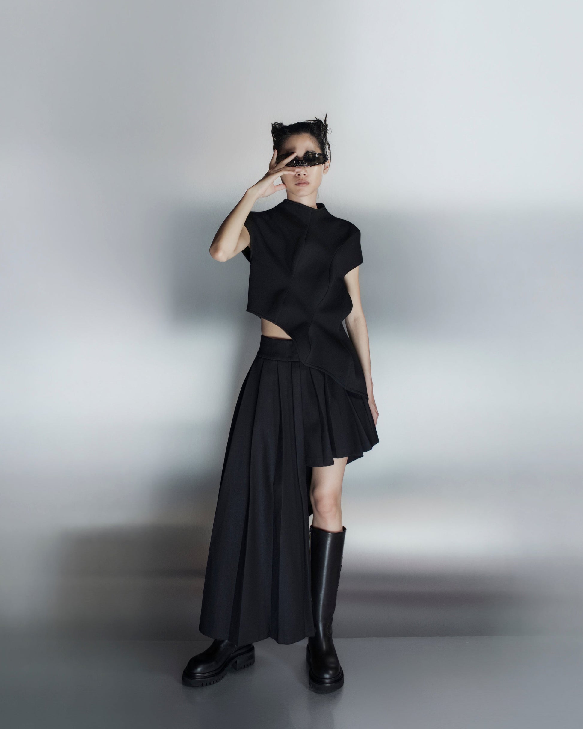Expertly designed and crafted, the A-JANE SS25 Plasma 3D Asymmetrical Sleeveless Top features a unique silhouette with an irregular curve, inspired by sound waves in Neue Musik. Made with neoprene material, this top offers a stylish and asymmetrical look in 360 degrees.