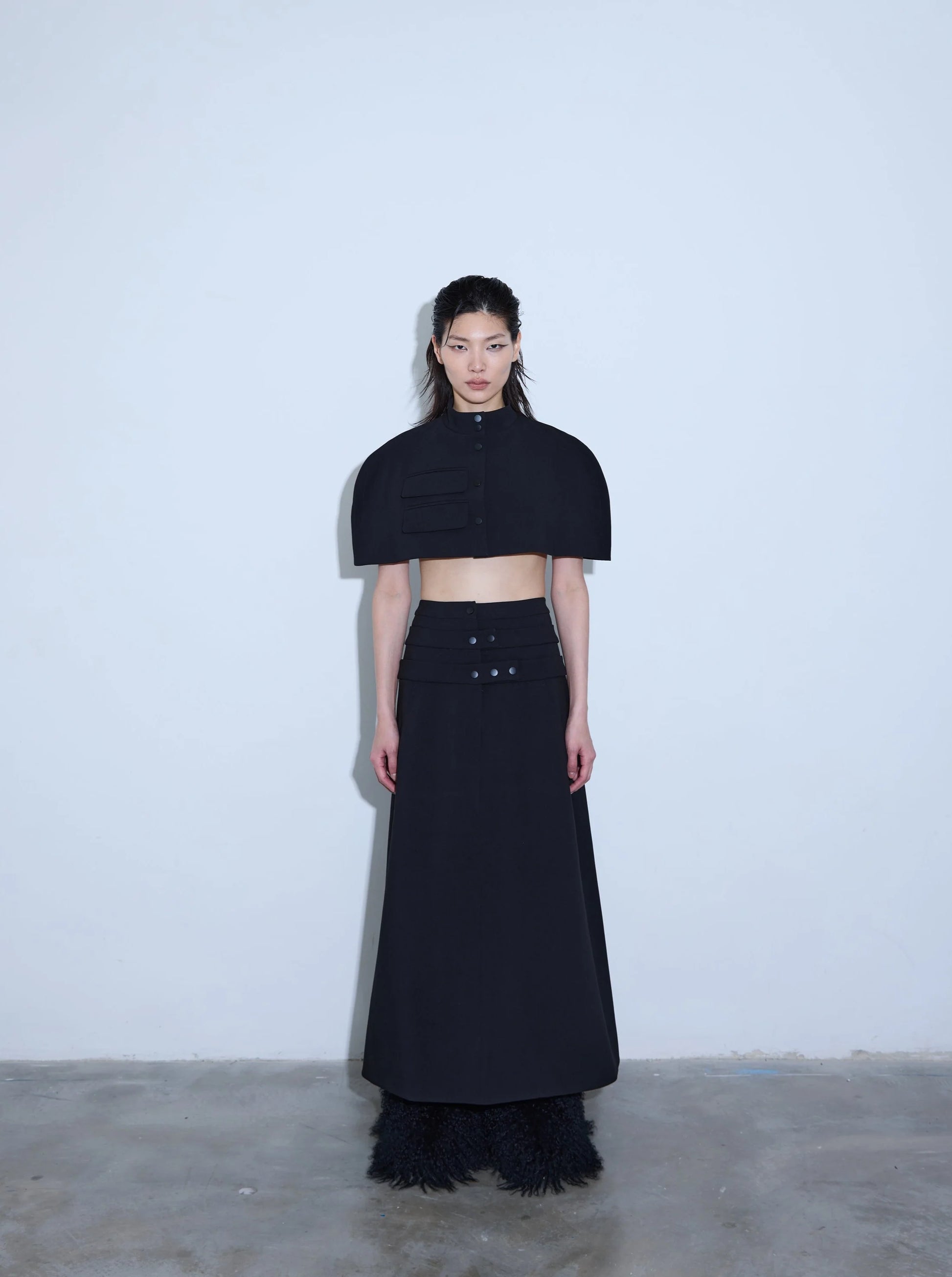 Drawing inspiration from the accordion instrument's intricate design, we present the Akkordi Triple Waistband Long Skirt, boasting a three-tiered waistband, sides pockets and 2 welt pockets.