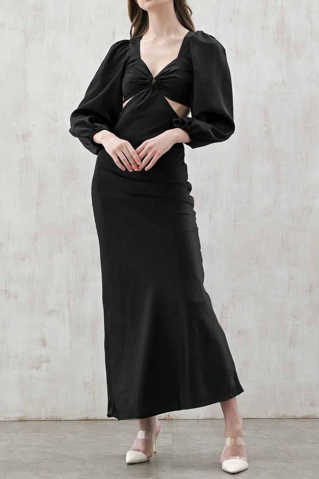 Alma dress in black will transport you from sunshine days into cooler months with ease. Cut from a satin blend, this Maxi fits and flatters with a cinched waist and statement cut outs, full length sleeves and soft hemline.