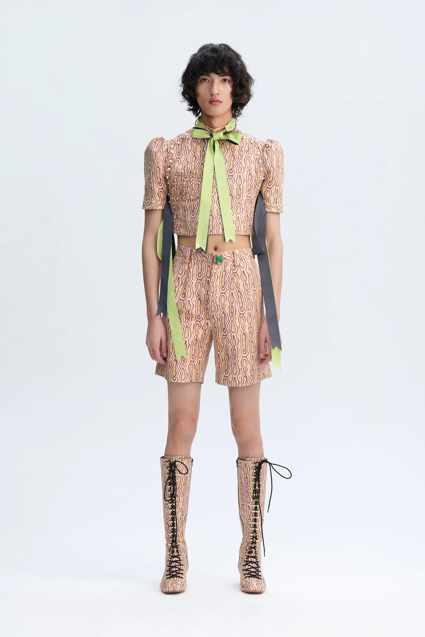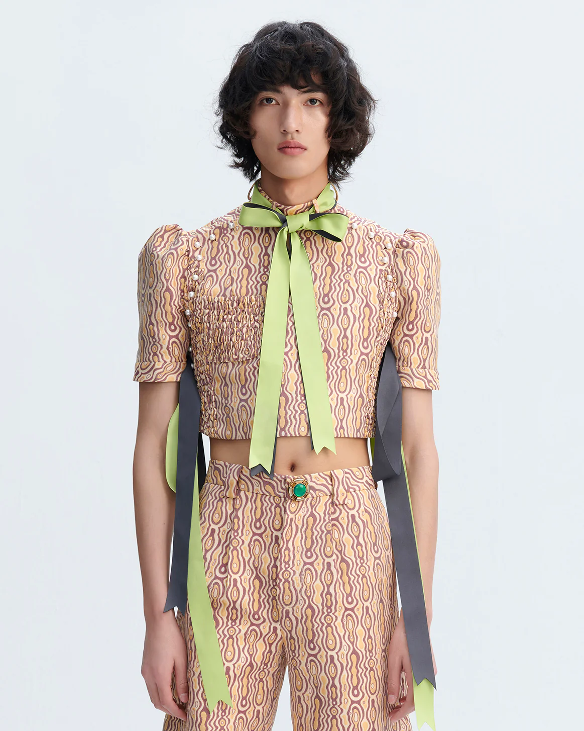 - Loops around neckline band for ribbon/necktie styling