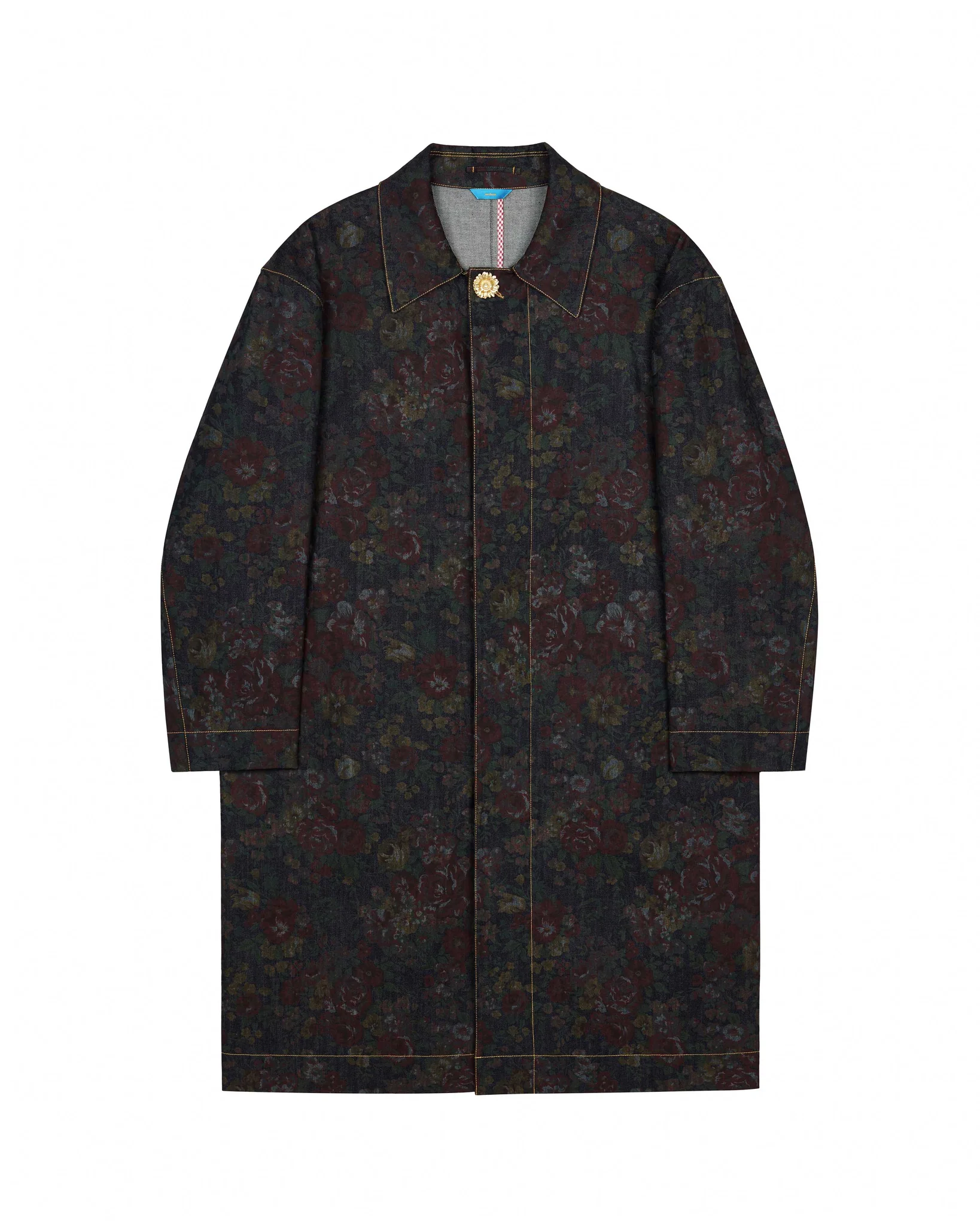 This printed denim fabric is finished with a layer of matte coating that resembles the texture of an oil painting.