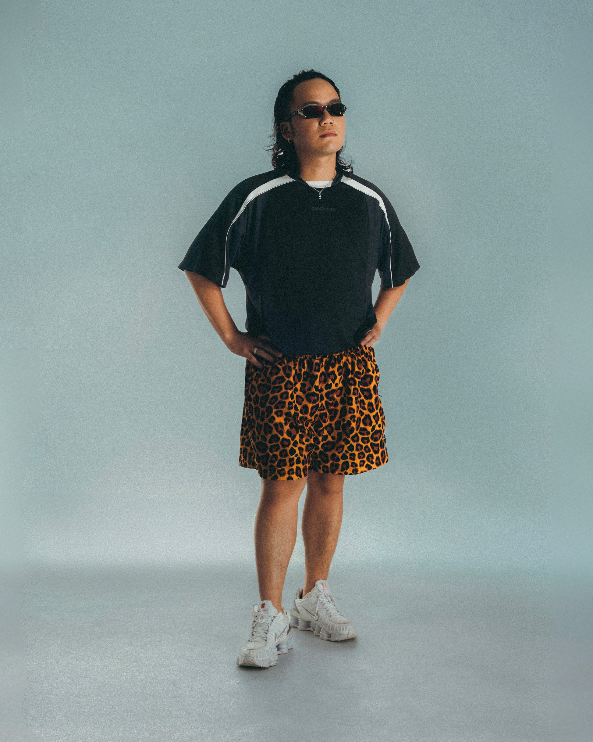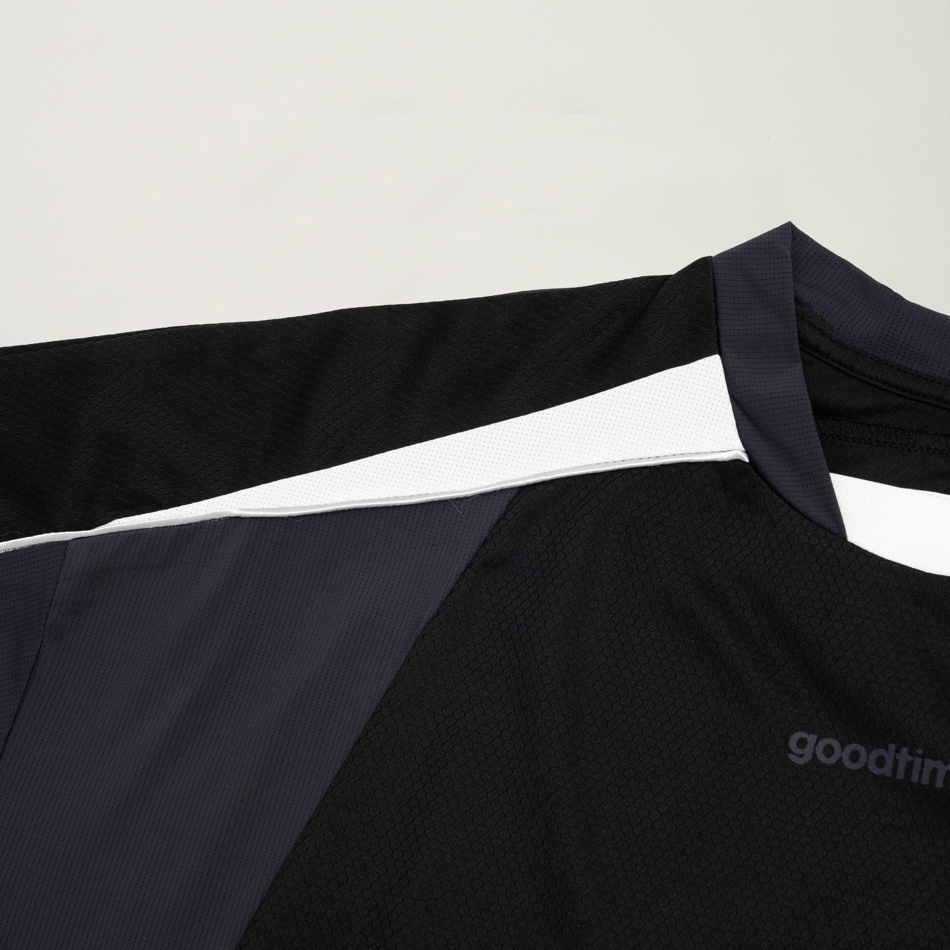- GOODTIMES badge at hem