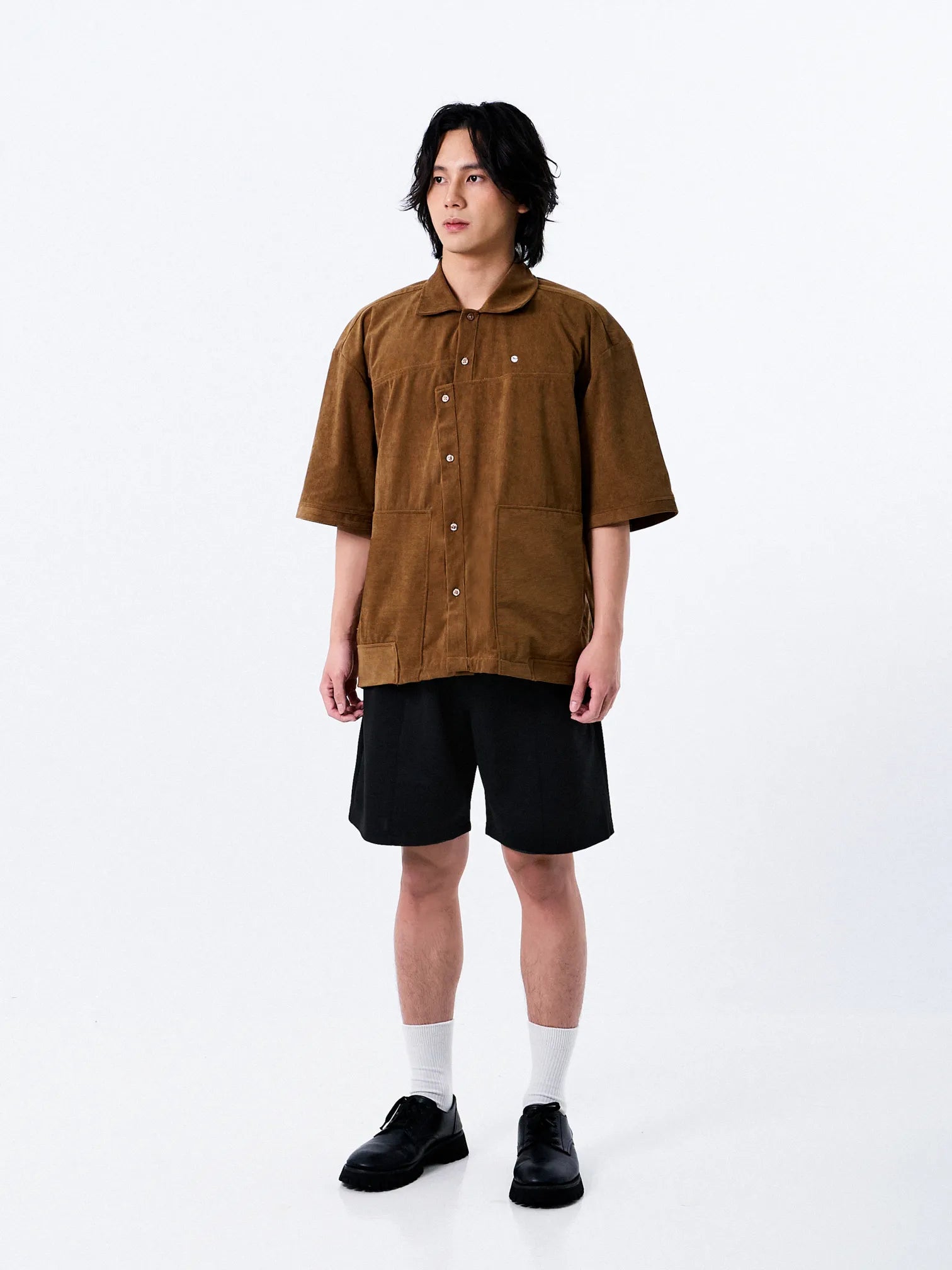 This corduroy shirt in rich brown features an asymmetrical design, giving it a bold, unconventional twist. The textured corduroy fabric adds a vintage touch, making it both stylish and unique for everyday wear or standout outfits.