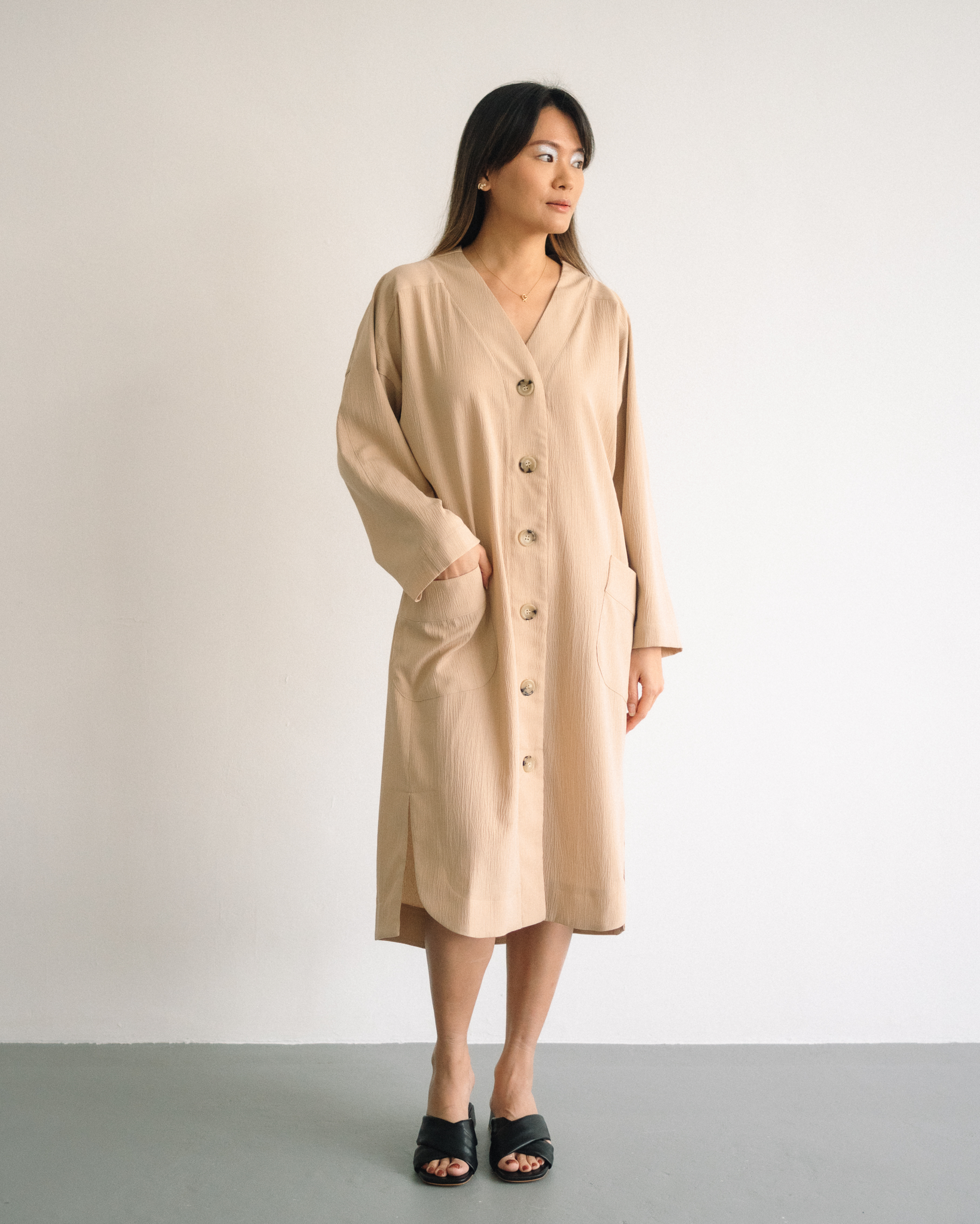 With a V-cut front and back, the midi dress features long sleeves and deep front pockets. This style layers effortlessly under blazers and light overcoats, and can also be paired with wide-cut pants. The textured midi dress does it all - play, work, dinner.