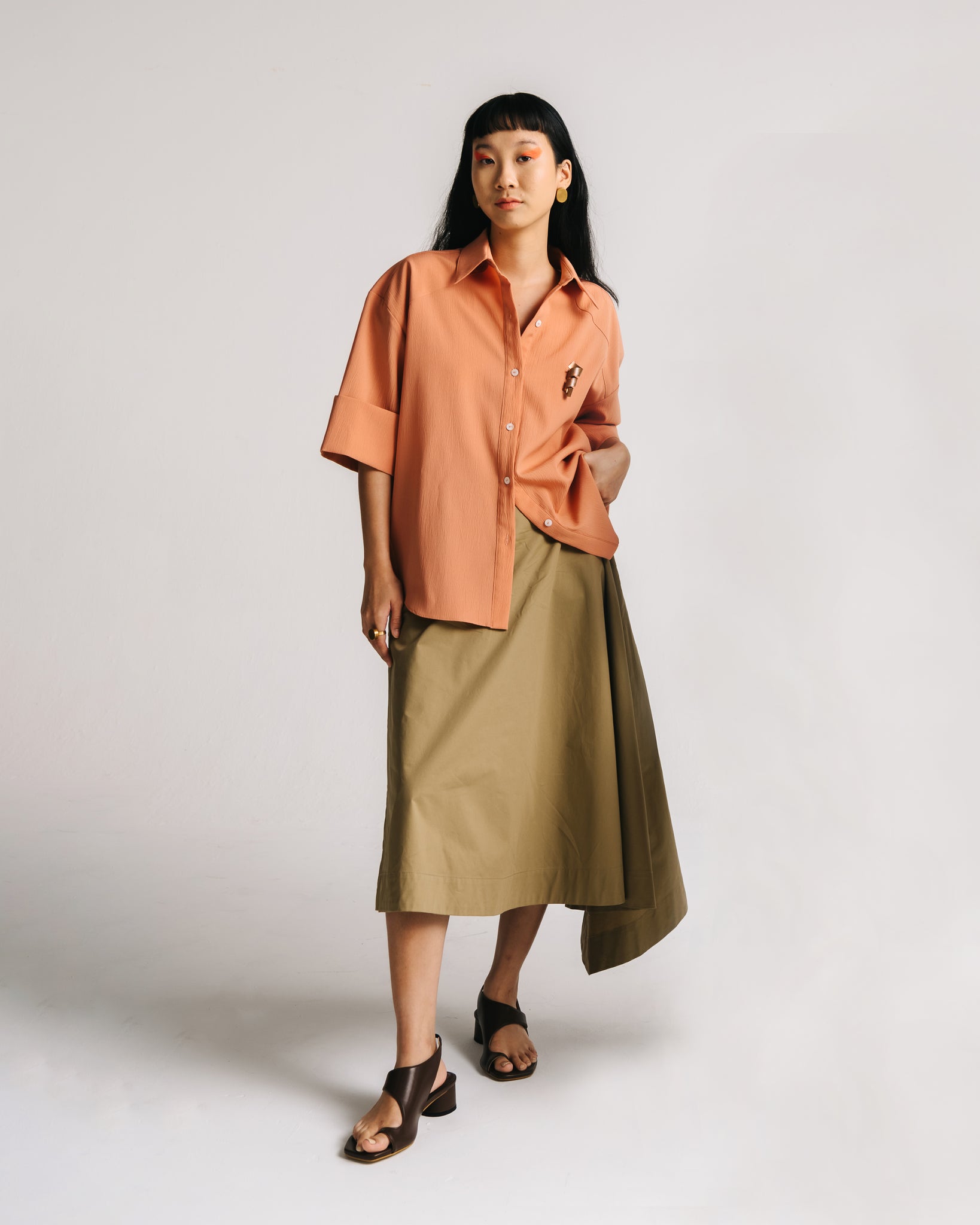Our references to a minimalist ethos offers a familiar silhouette of volume, designed with folded cuffs and a front placket. We're styling it with a skirt or pants for a look that is equal parts modern and classics.