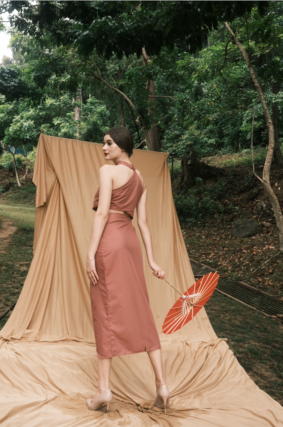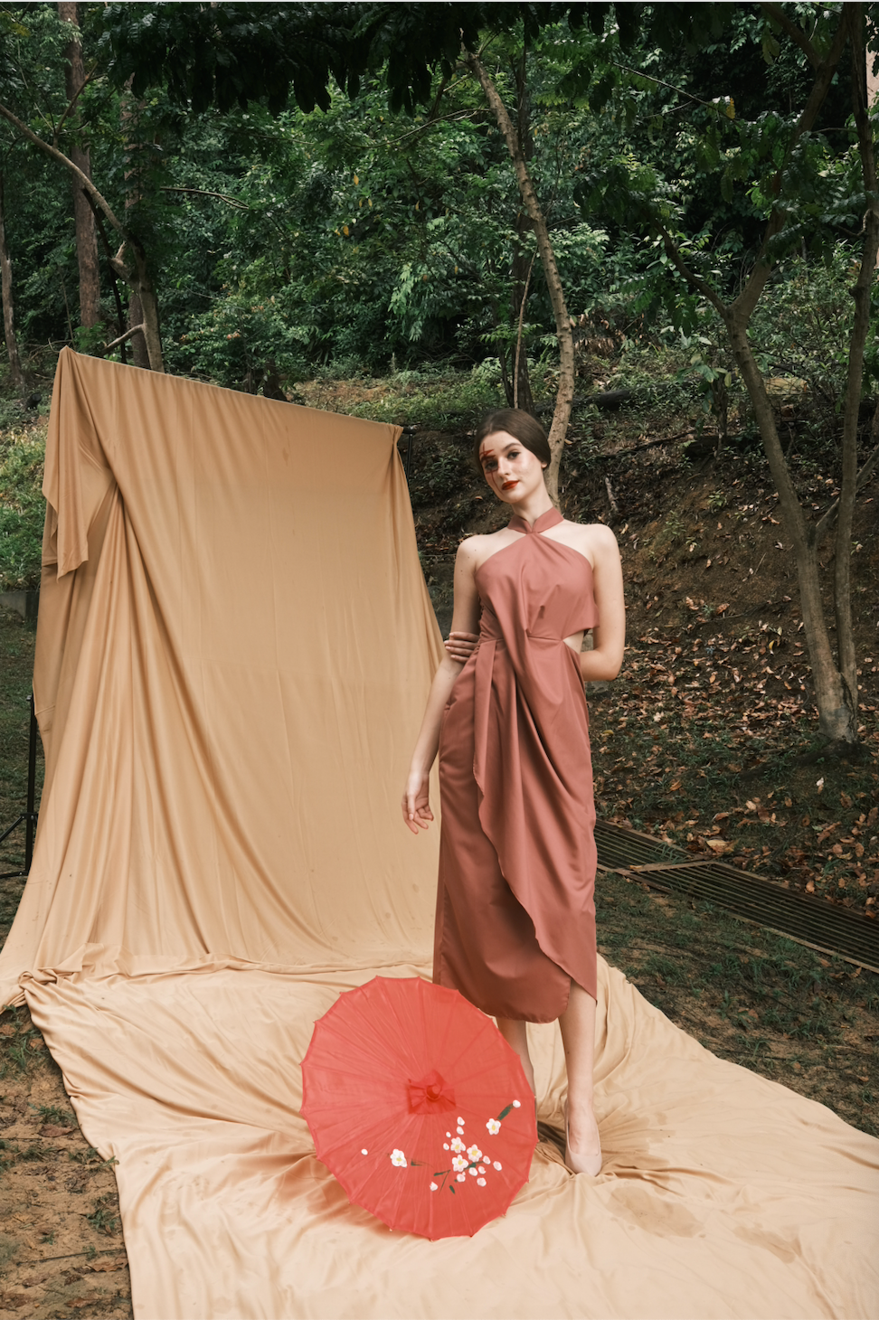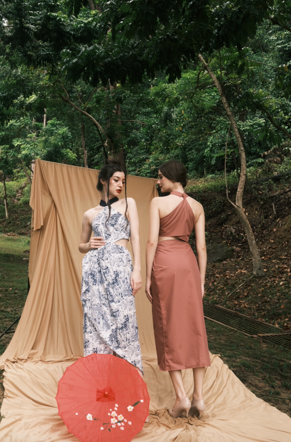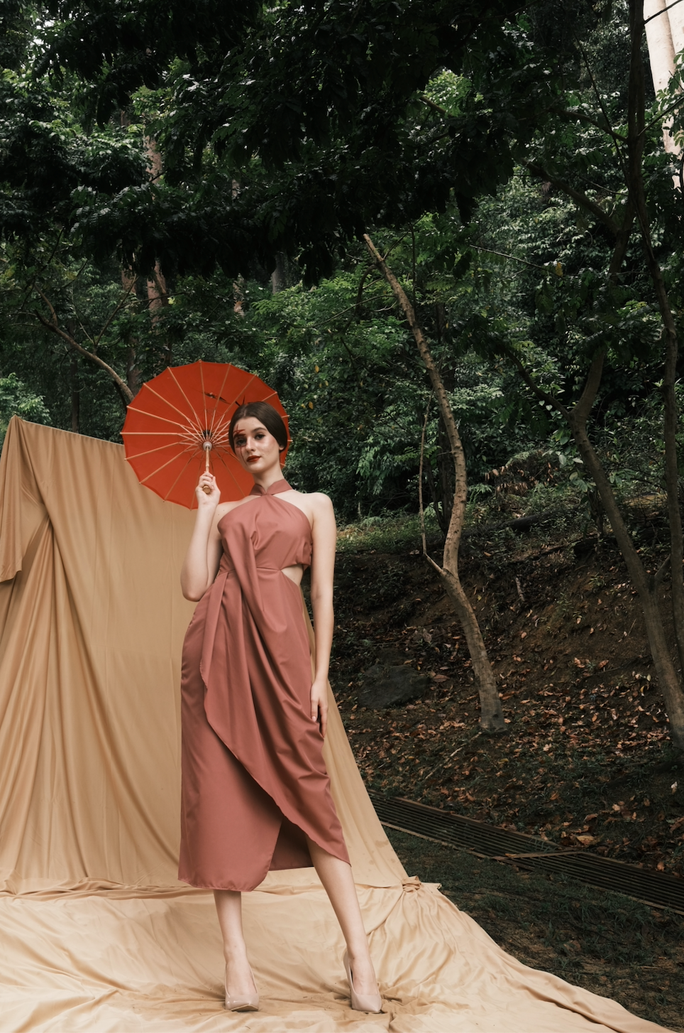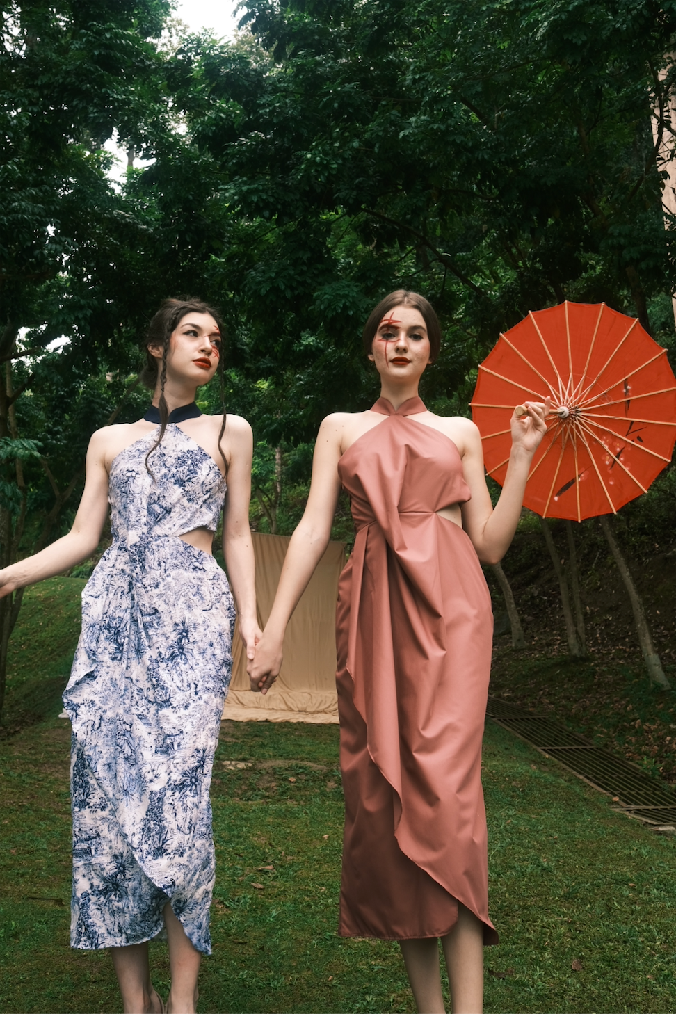 they are designed especially for the Luneré capsule collection, featuring Paisleywithlove's signature cross-body drapes that wrap around the figure with a touch of oriental collar. It is designed with a cut-out waist to highlight women's feminine silhouette, complementing the side-bearing split for easy movement.