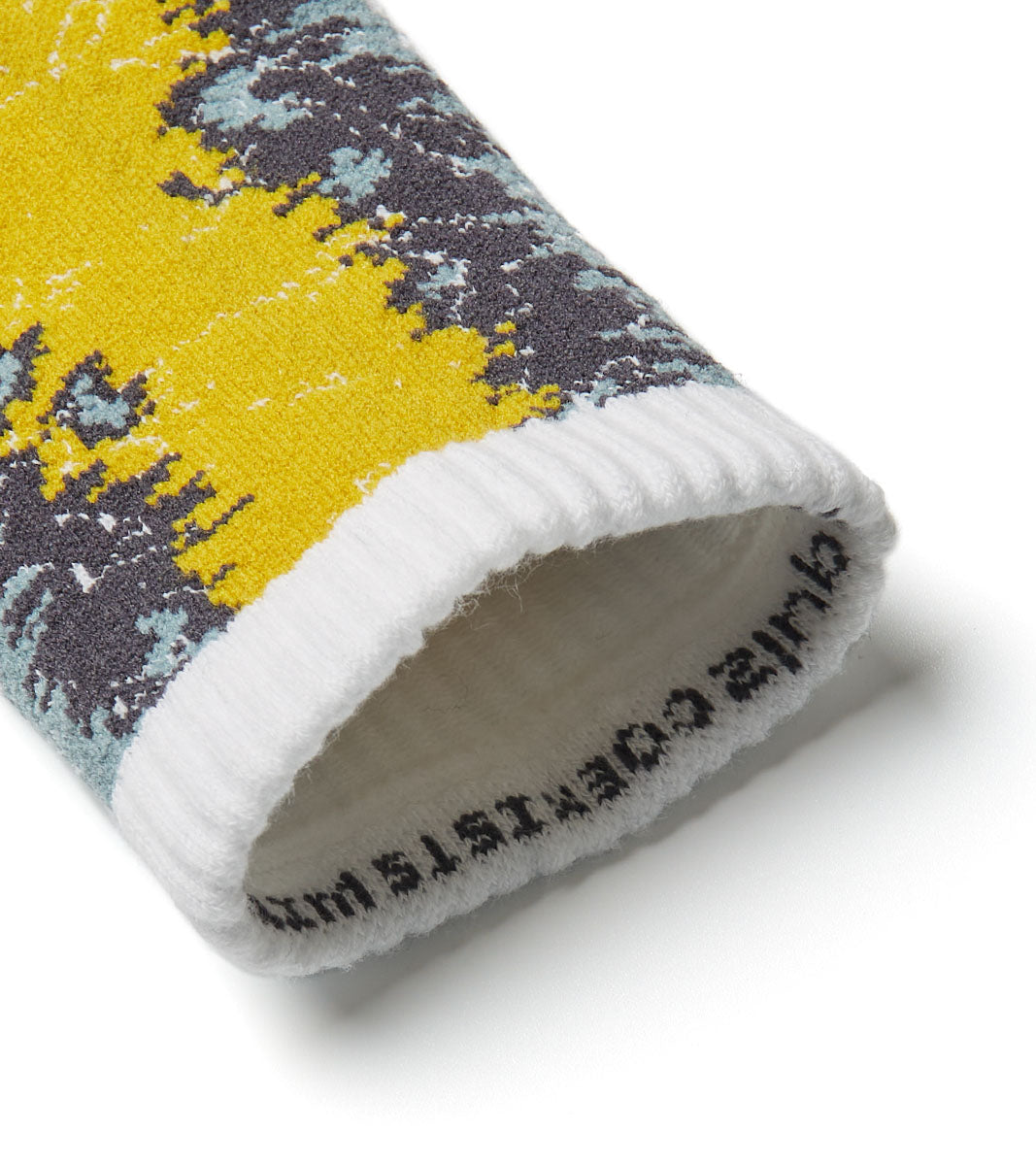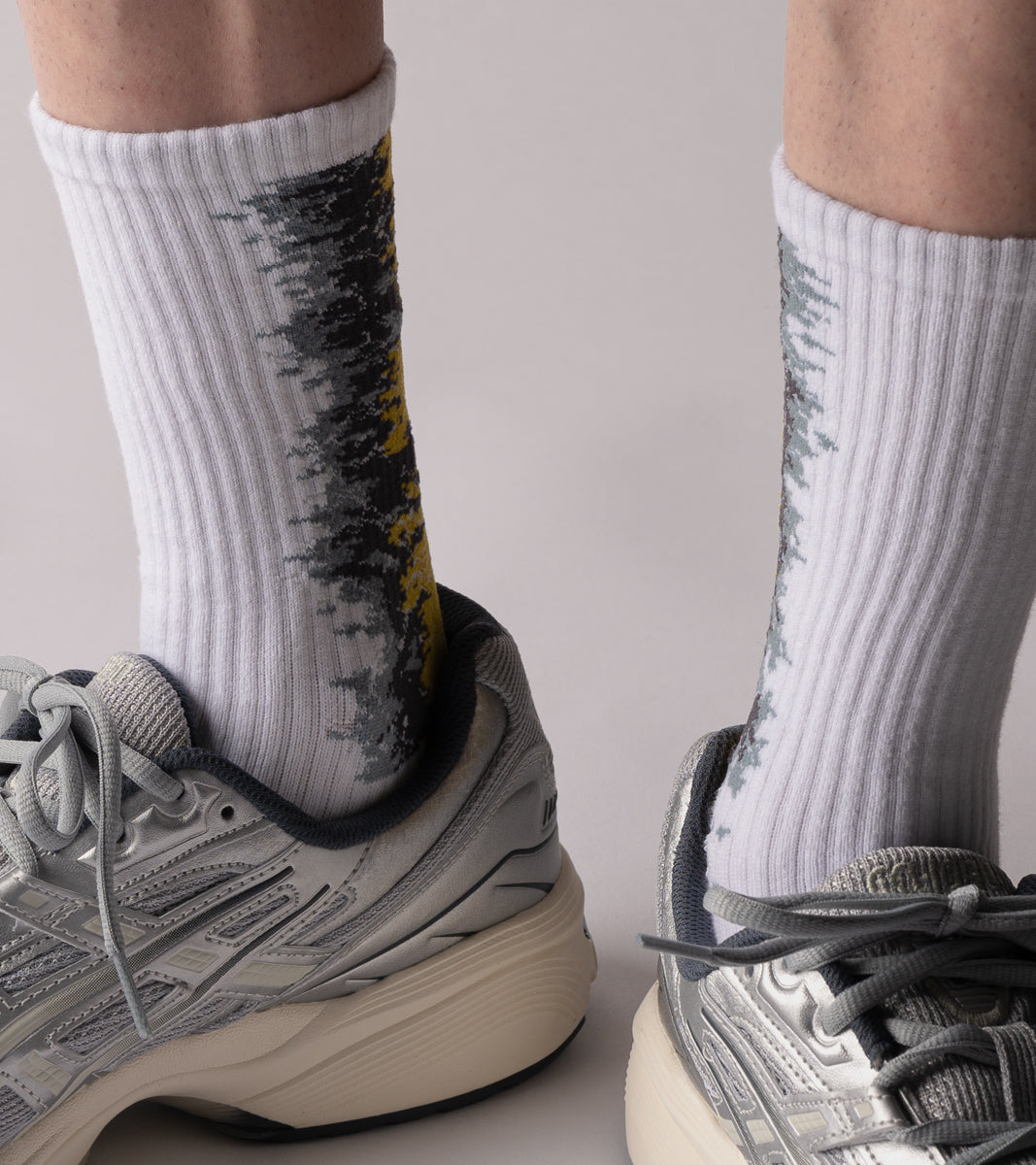 The LANDING series continues the gradient design and introduces three different geographical images: wheat fields, coastlines, and sandbars. These patterns blend together, intertwining colors, while hidden slogans are incorporated inside the sock cuff. The wearers, like the floating sand, flow with the air in environments of varying temperatures and diverse ecosystems, exploring every corner of the world.