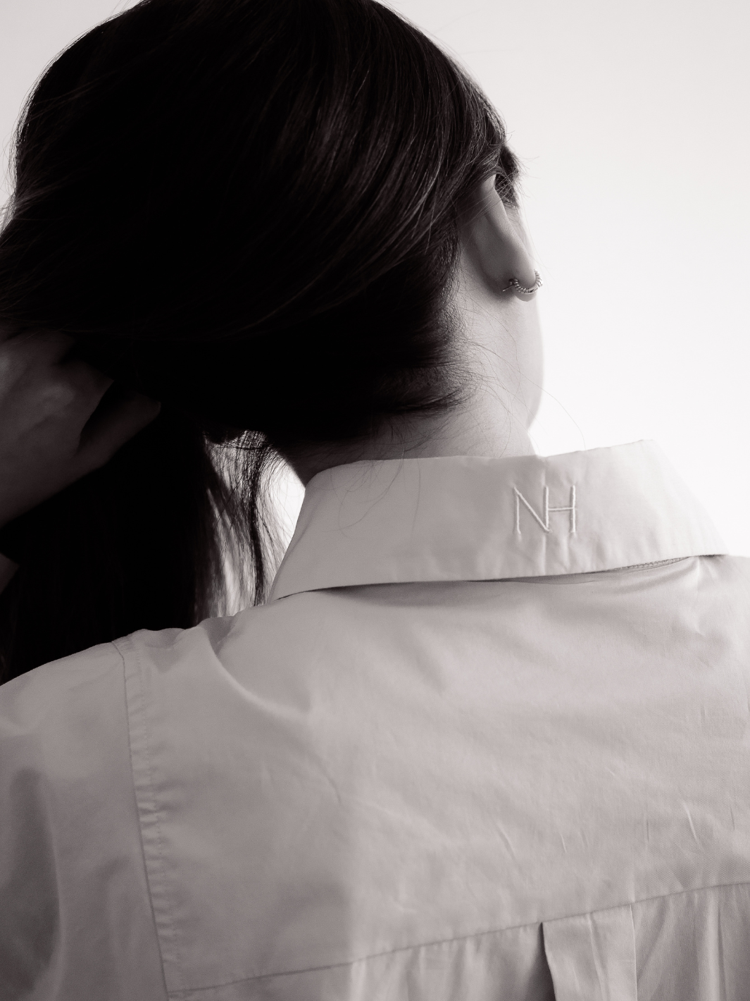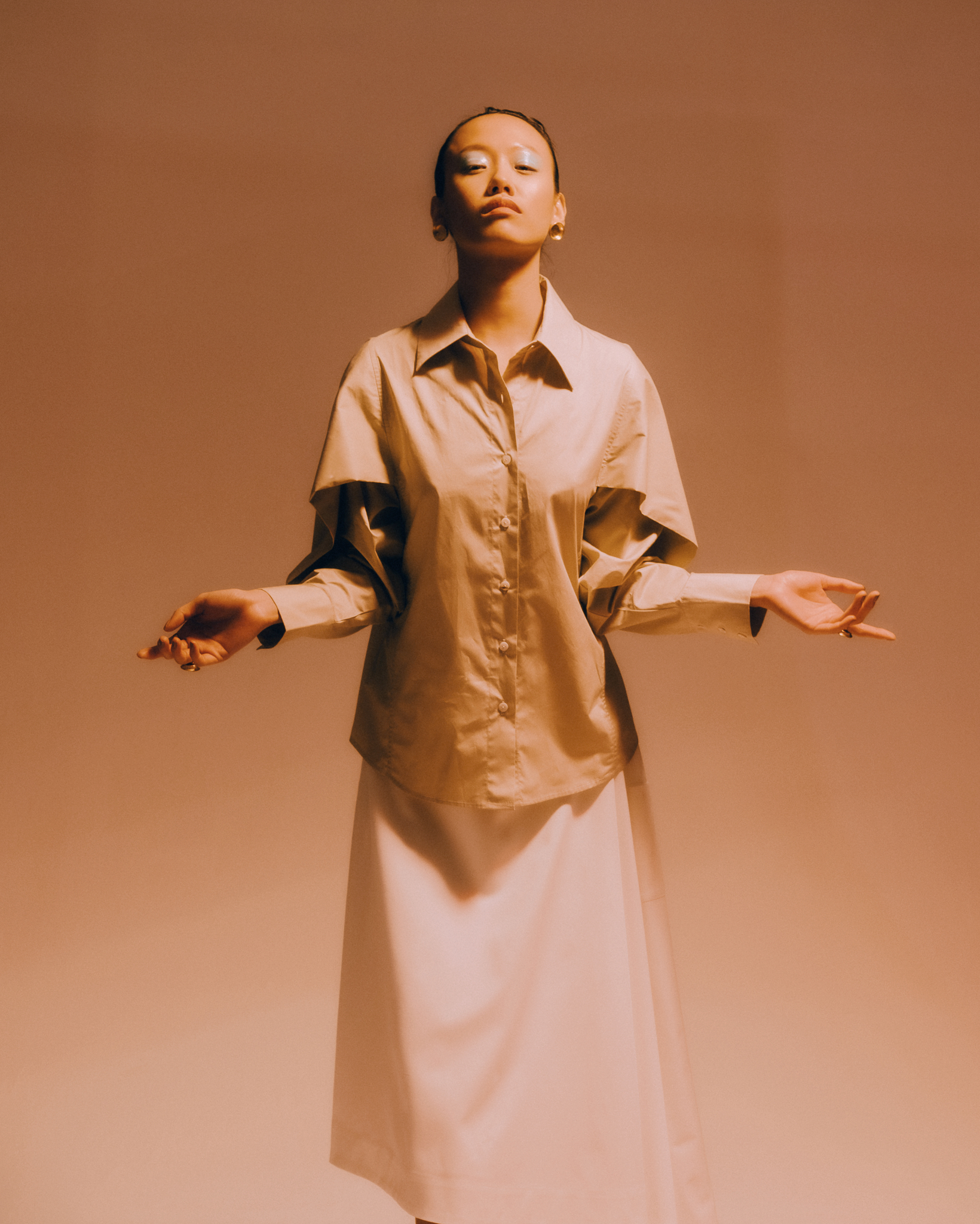 Combining masculine and feminine codes, the caped-panel collared shirt is softened with a cape-like panel through the shoulders.