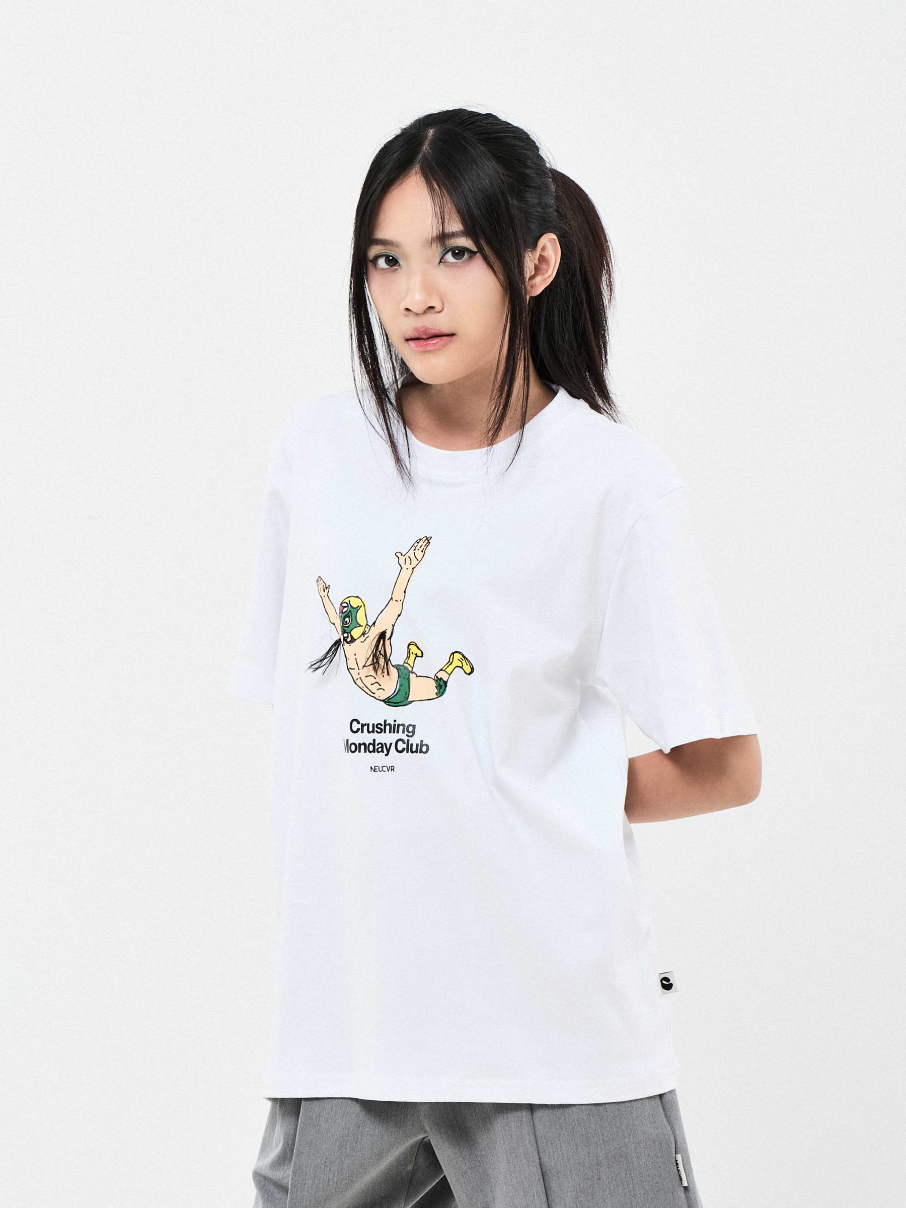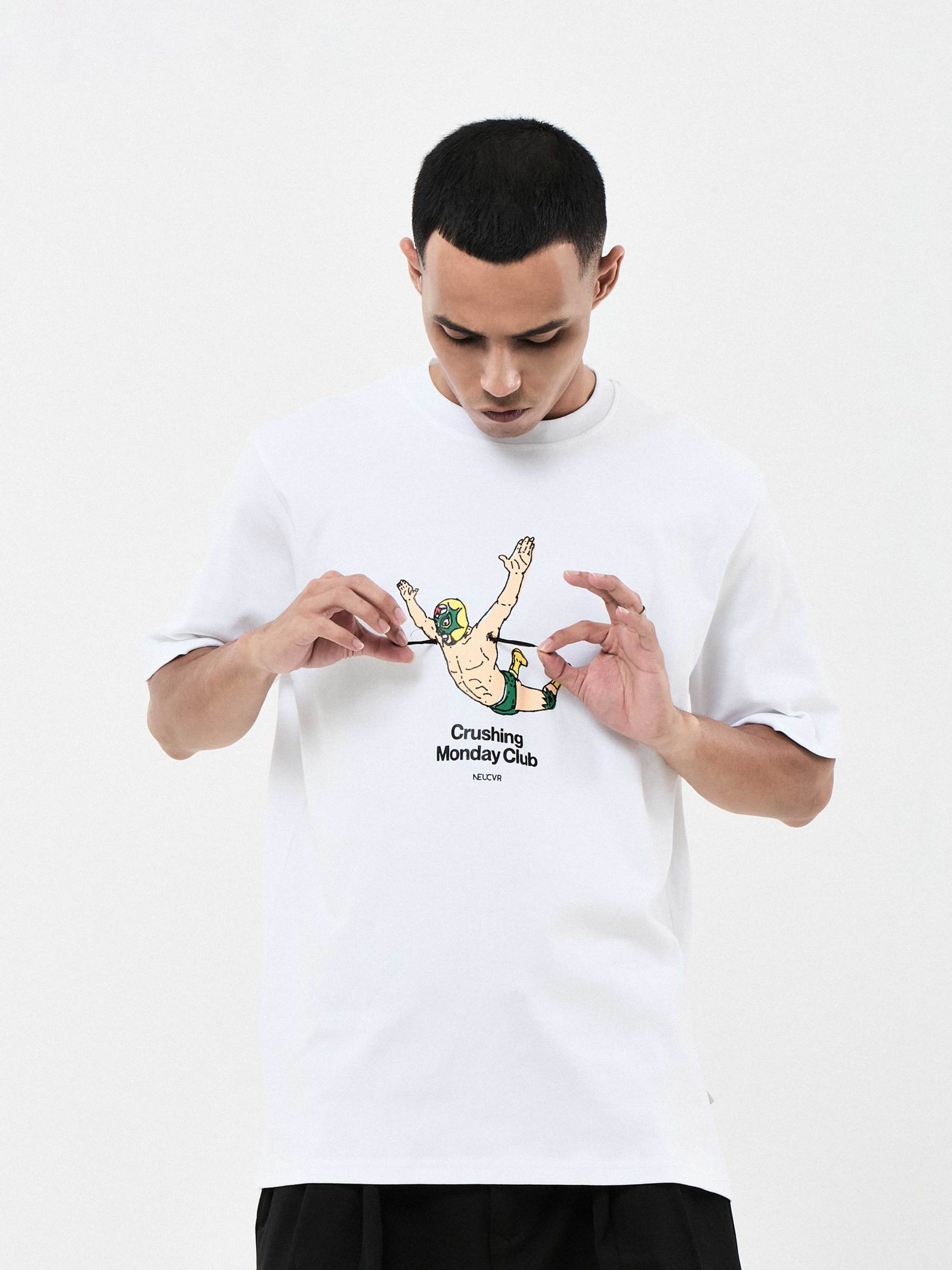The Crushing Monday Club Tee brings humor to life with a Superman-inspired hero falling from the sky and hilarious armpit hair crafted using thick threads. A bold and quirky design perfect for tackling Mondays with a smile.