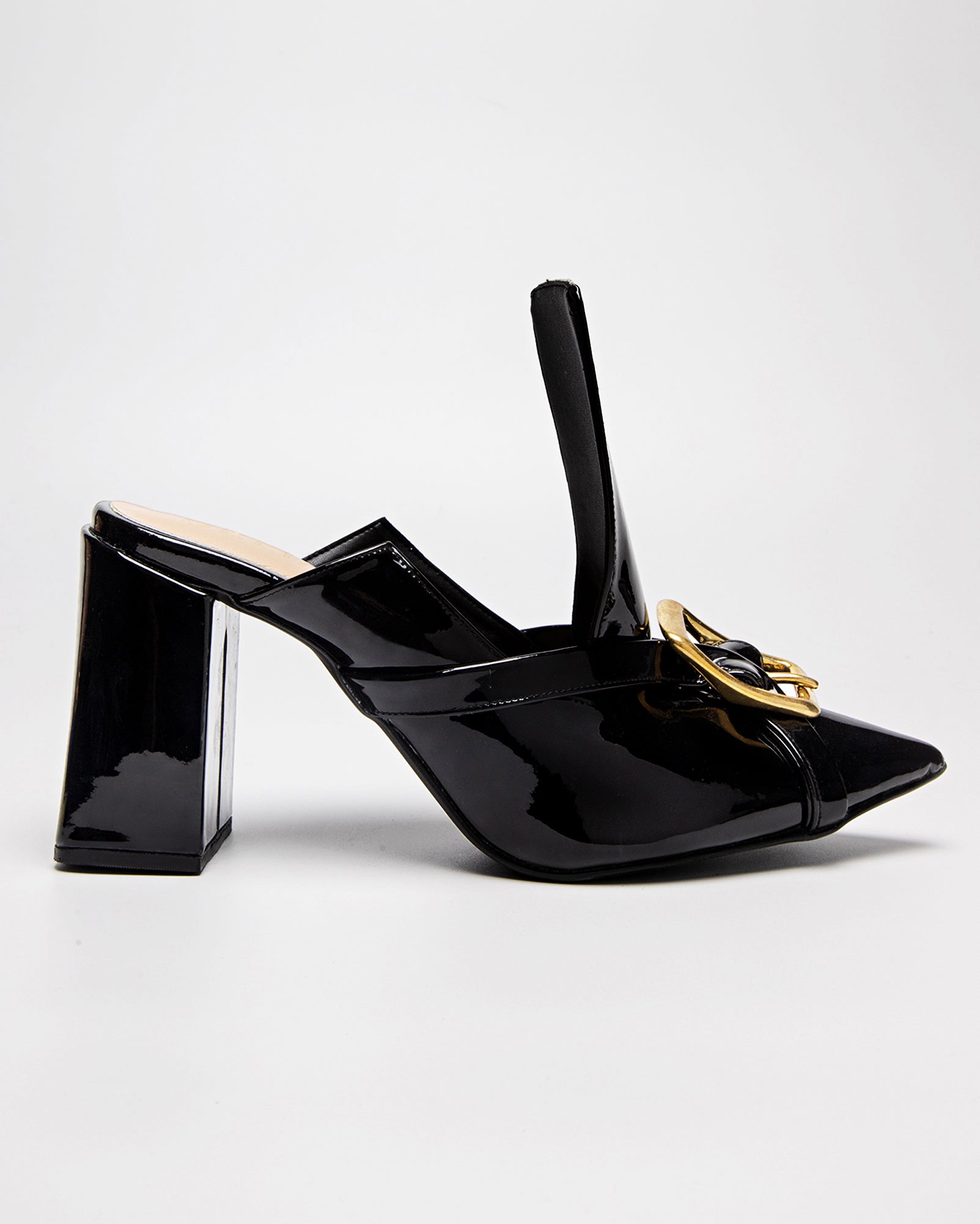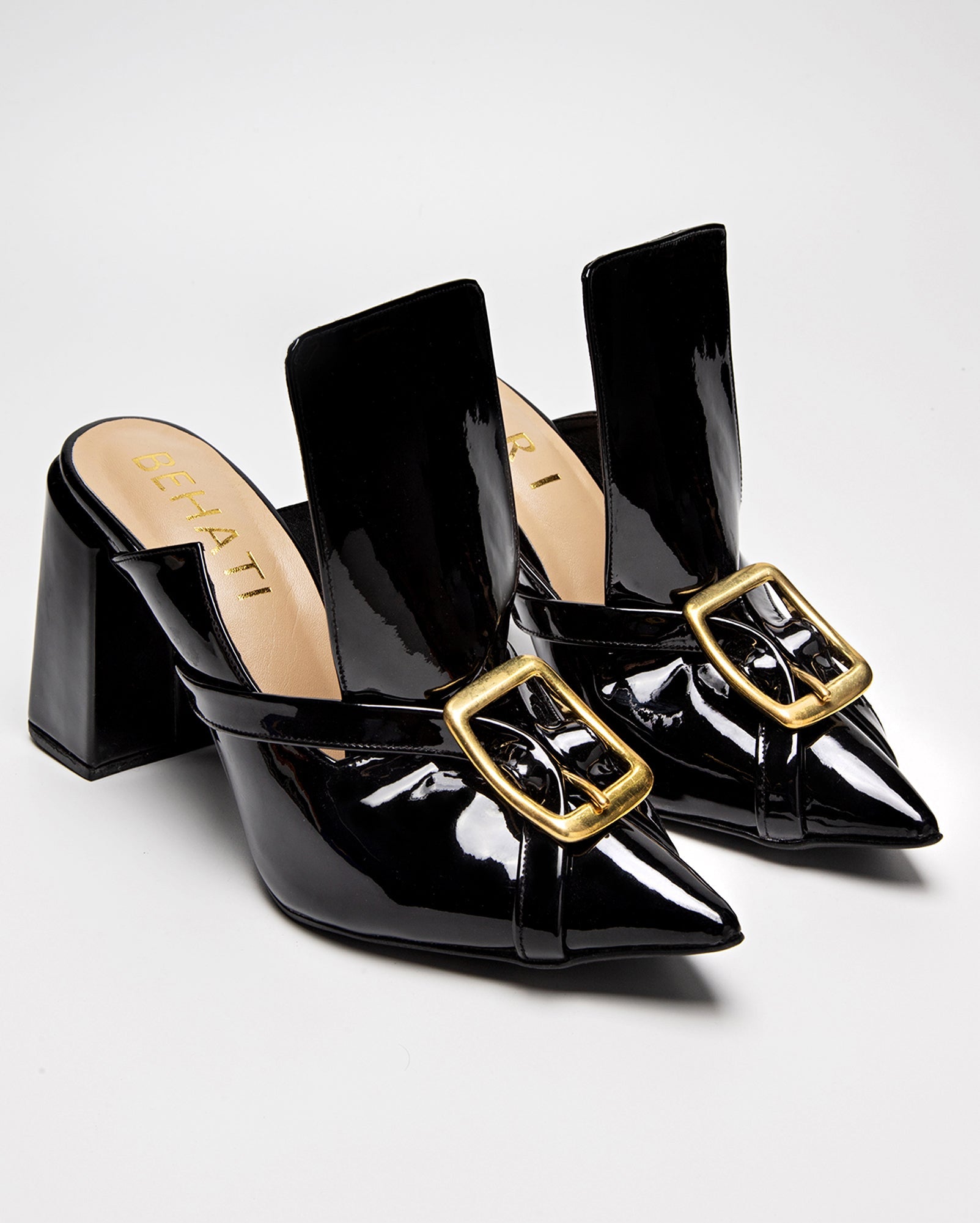Loafer block heel with oversized brass buckle inspired by the traditional Capal of Malay culture.