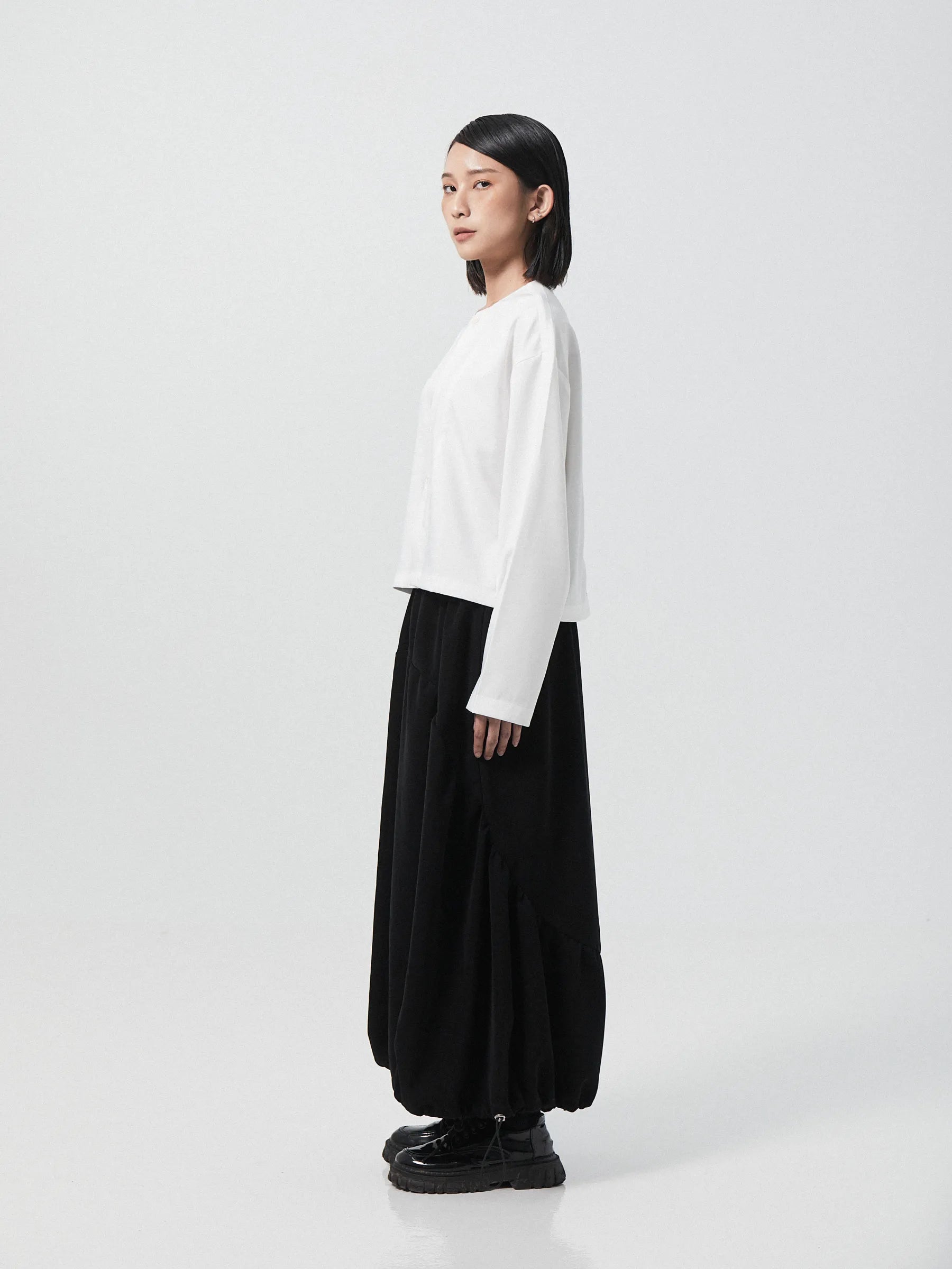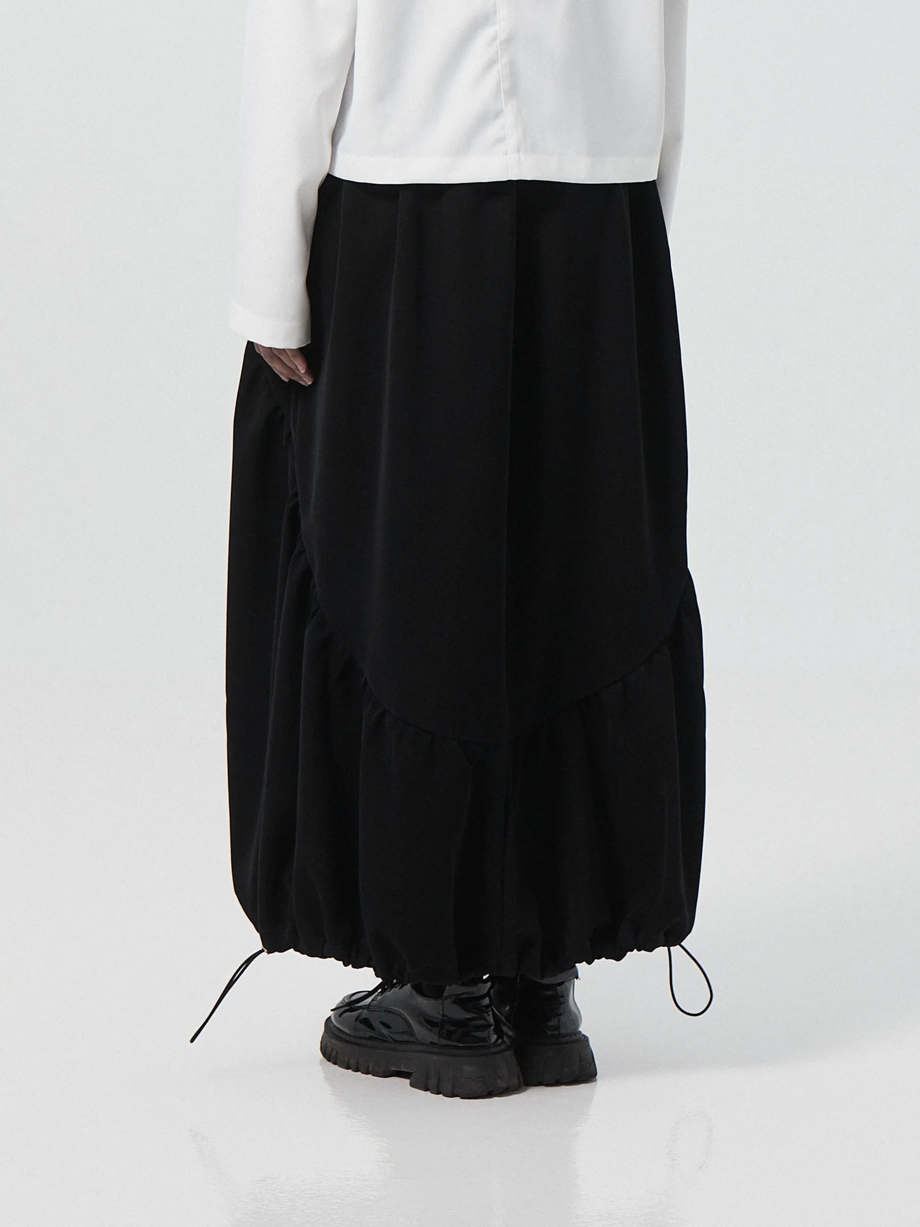 This skirt boasts a distinctive balloon-like silhouette that gracefully flows with your movements. Designed for versatility, it features a drawstring bottom, allowing you to customize the silhouette to suit your mood. The elastic waist ensures a comfortable fit while allowing for easy adjustability, it also provides two side pockets for practicality.
