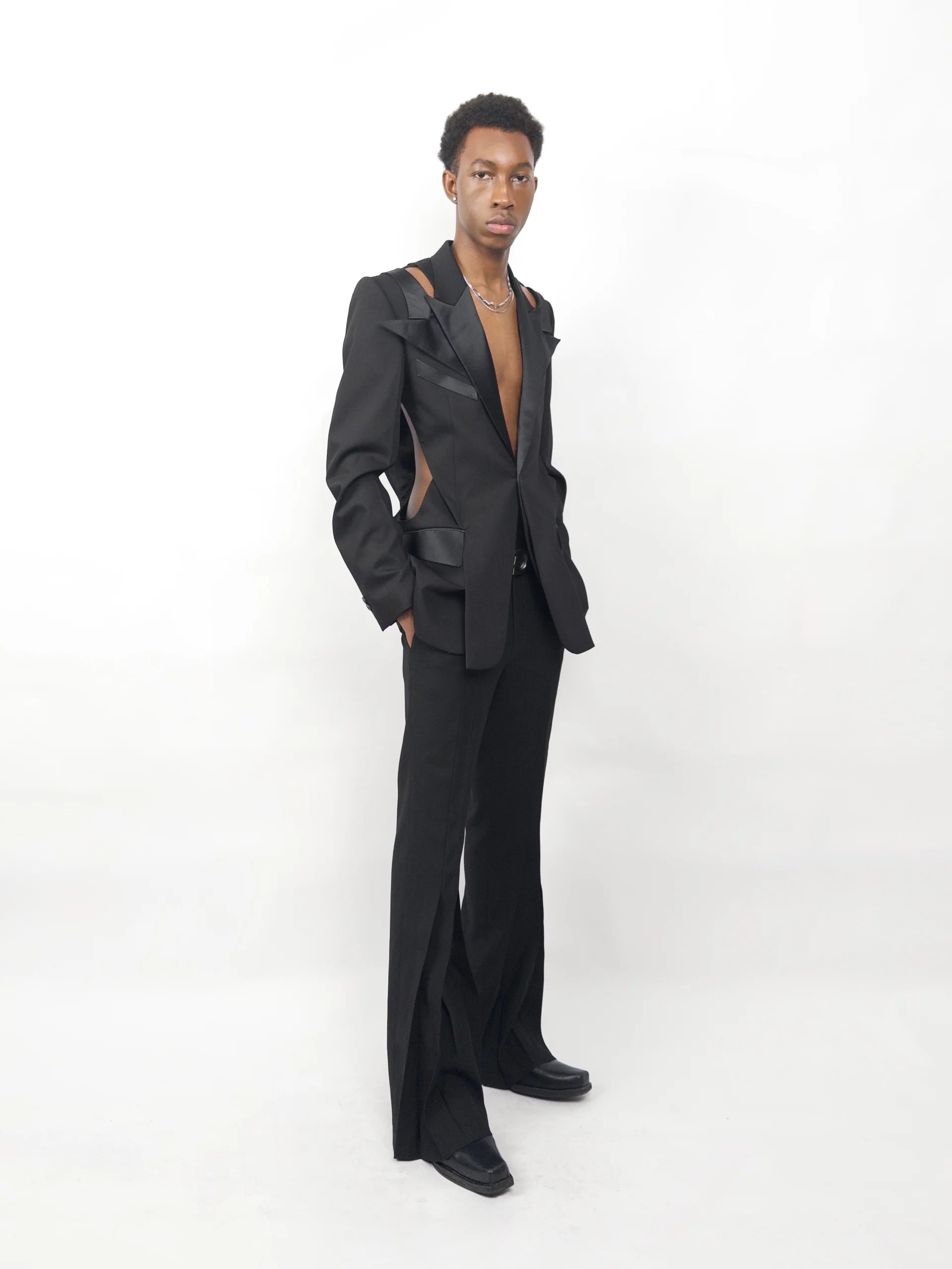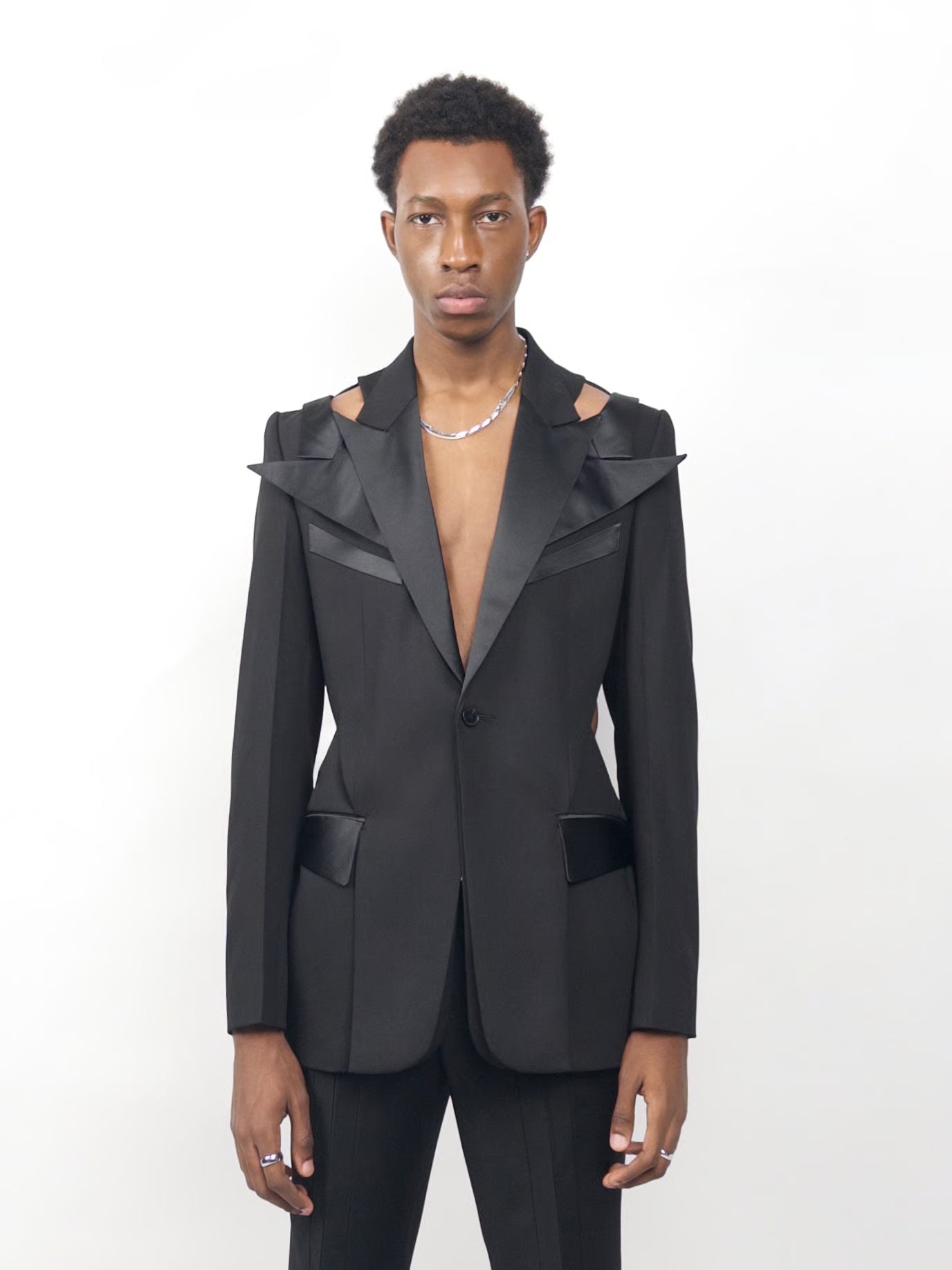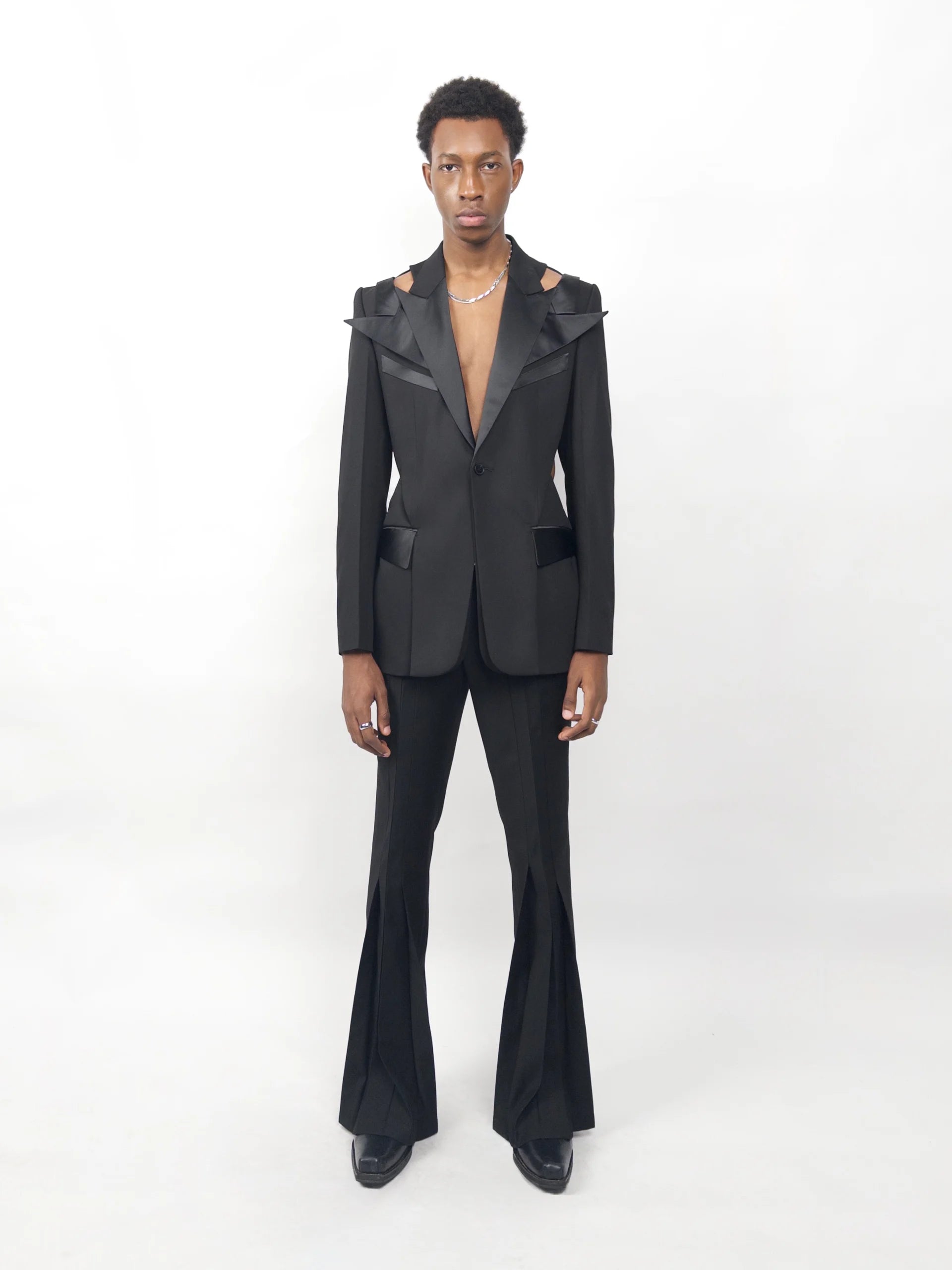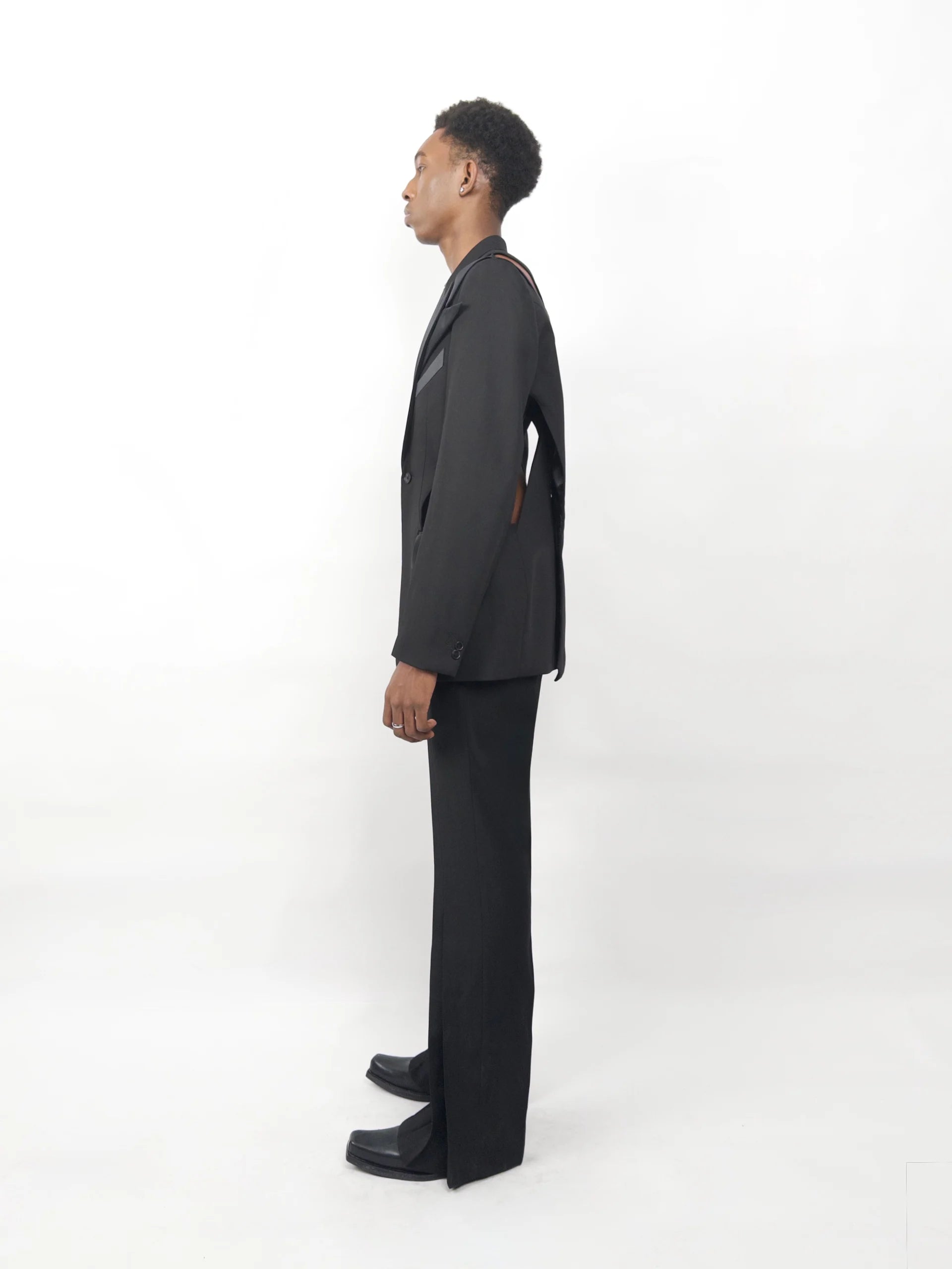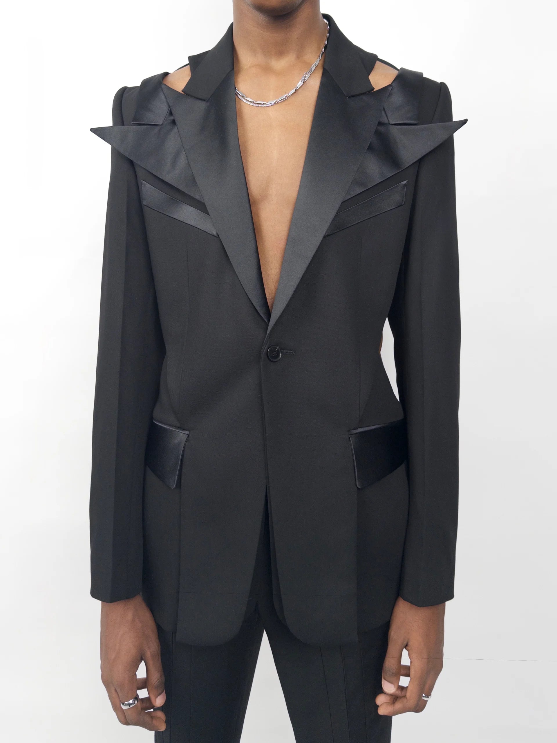 Regular fit black merino mix wool from antinori borgia, made in Italy & satin lapels handmade by Dickson Lim with in-house artisans.