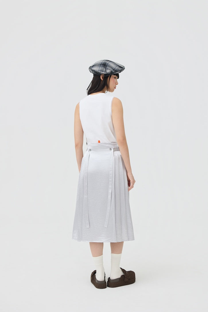Signalling the combination of silver and dignified composure, the "Ginrin" Skirt is structured and pleated style offered in tartan and silver — both symbolic of balance between heritage and shine. The tartan version features the usage of the face and reverse side of the fabric too, giving it its dynamic contrast. Comes with adjustable button details on the waist. Designed as one of our holiday hero pieces, it reflects 3EIGHTH’s quiet celebration of duality.