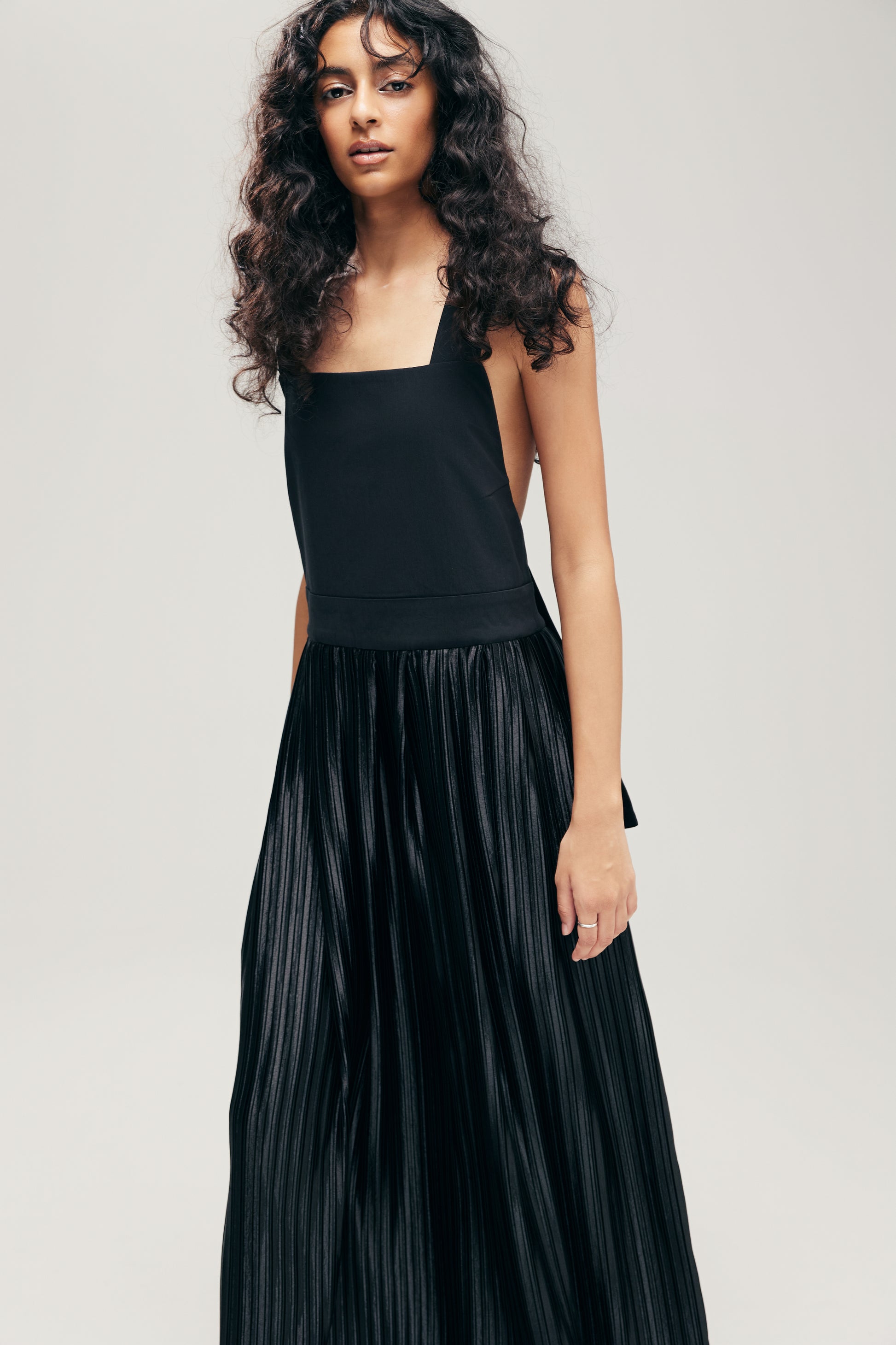 With the metallic pleats representing the layers of our inner universe, the Hannei Overall Dress is named after "reflection" in Japanese. The Dress features an adjustable strap detail that may be styled across or straight down. Built in with functional pockets on the front.