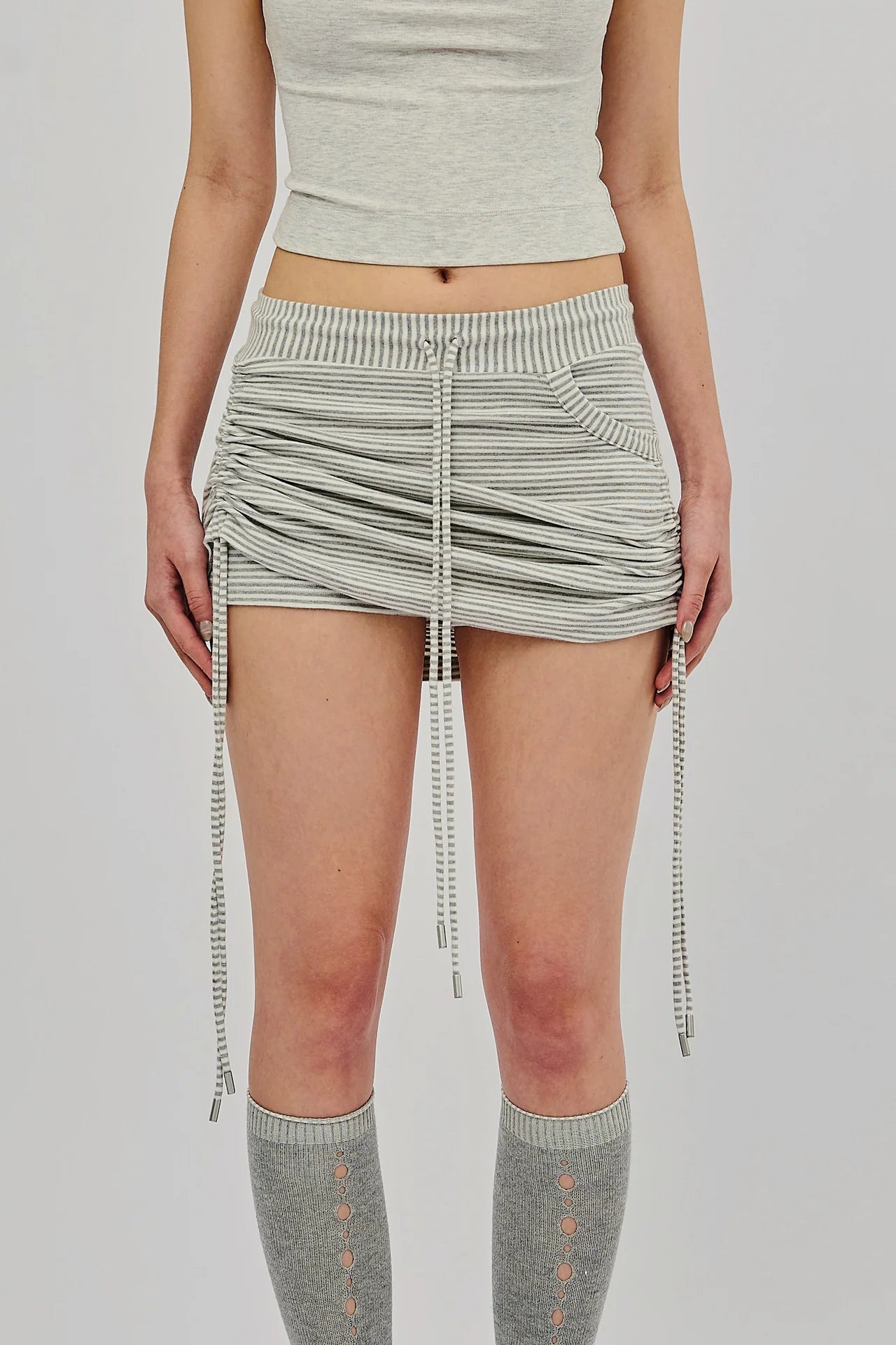 Drawstring down the sides of the hips allow for adjustable and asymmetric skirt length