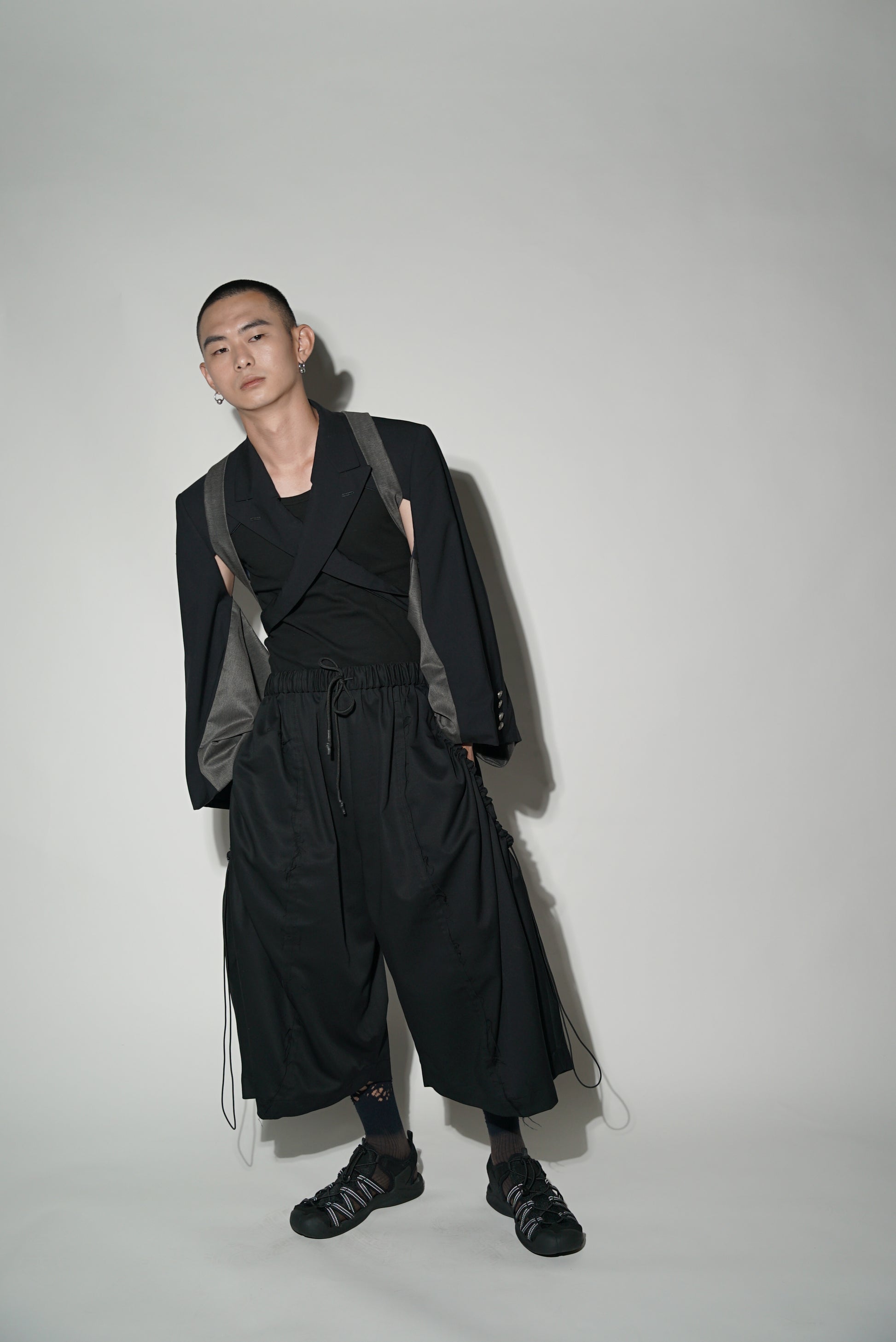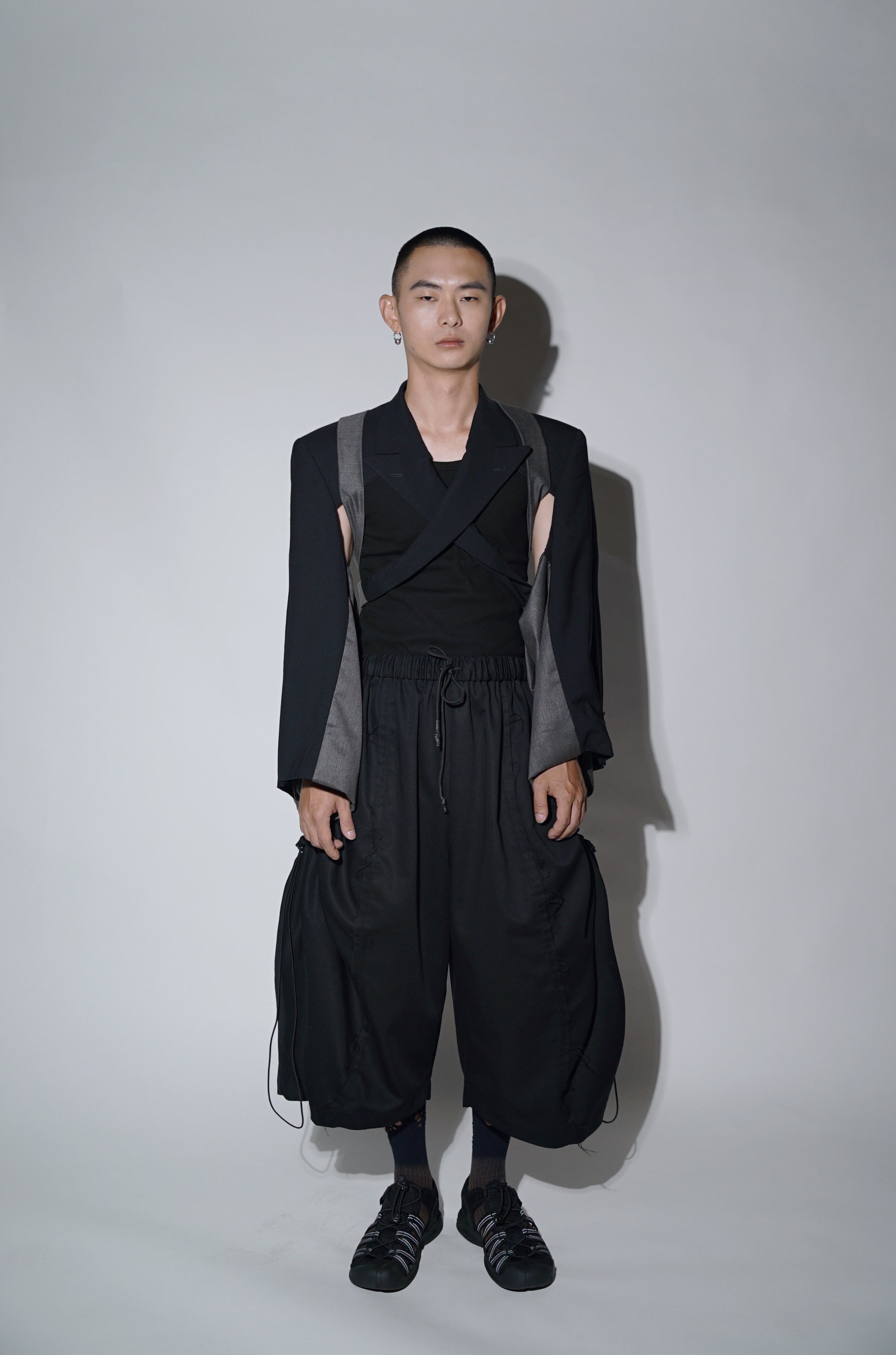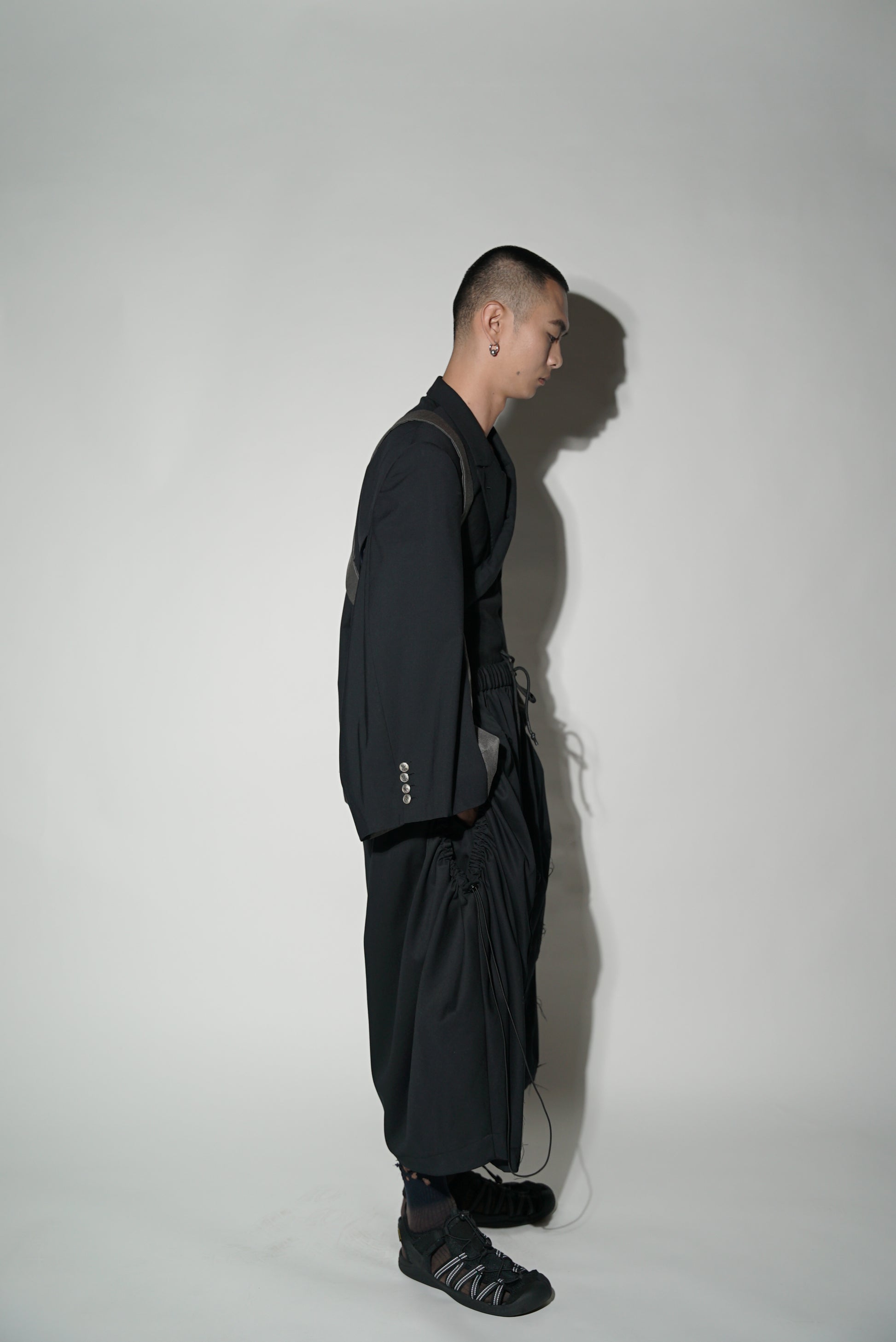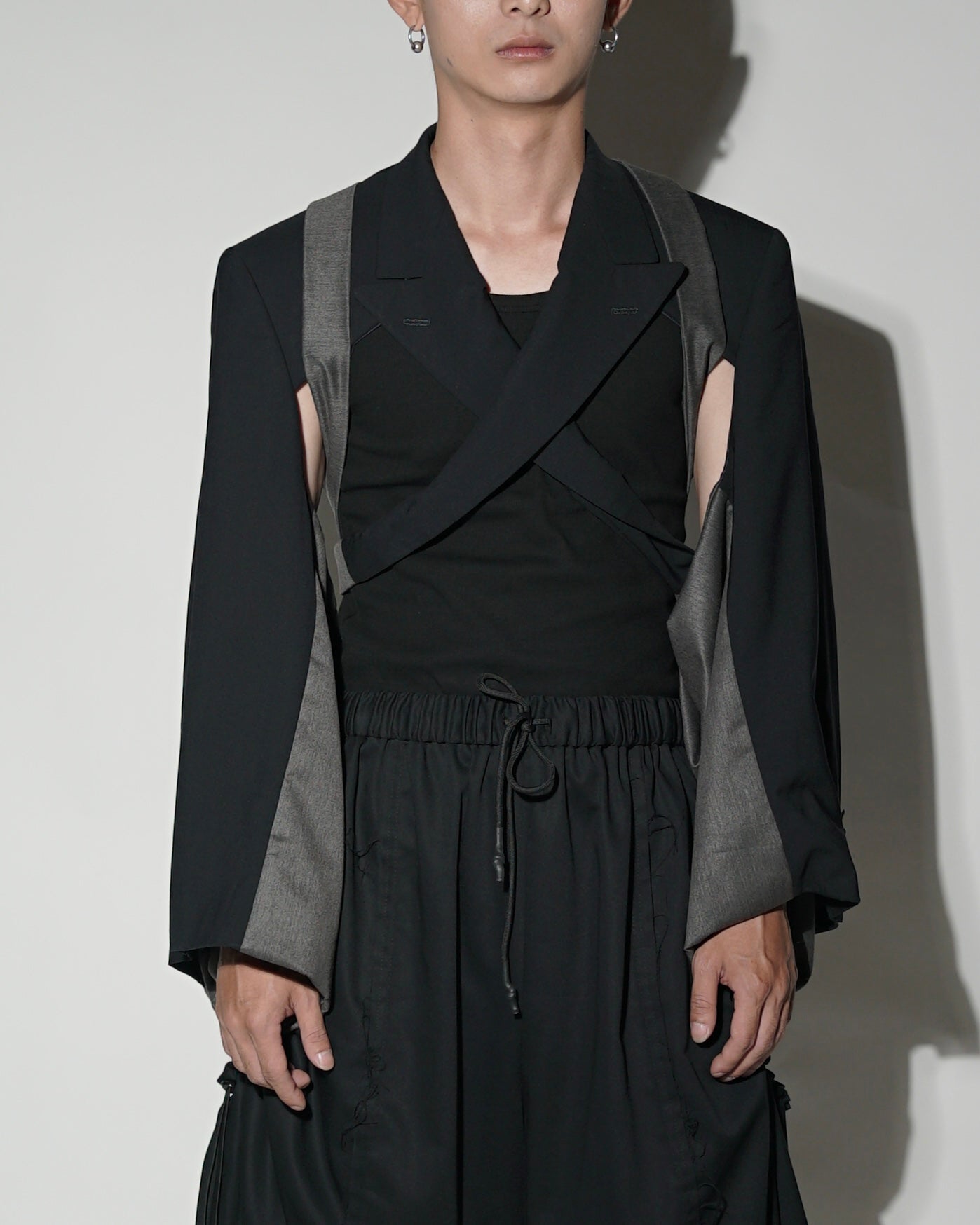 Kimono sleeves vest jacket with long ikat collar.