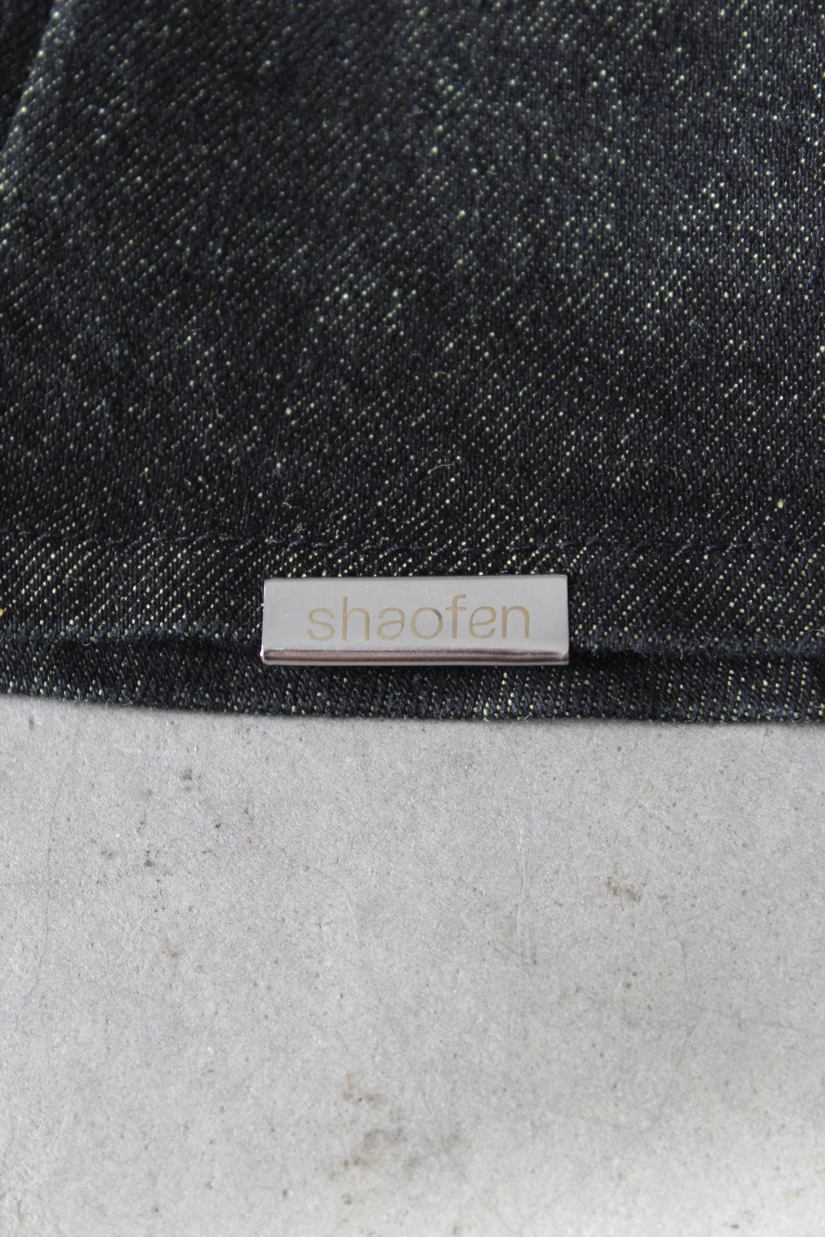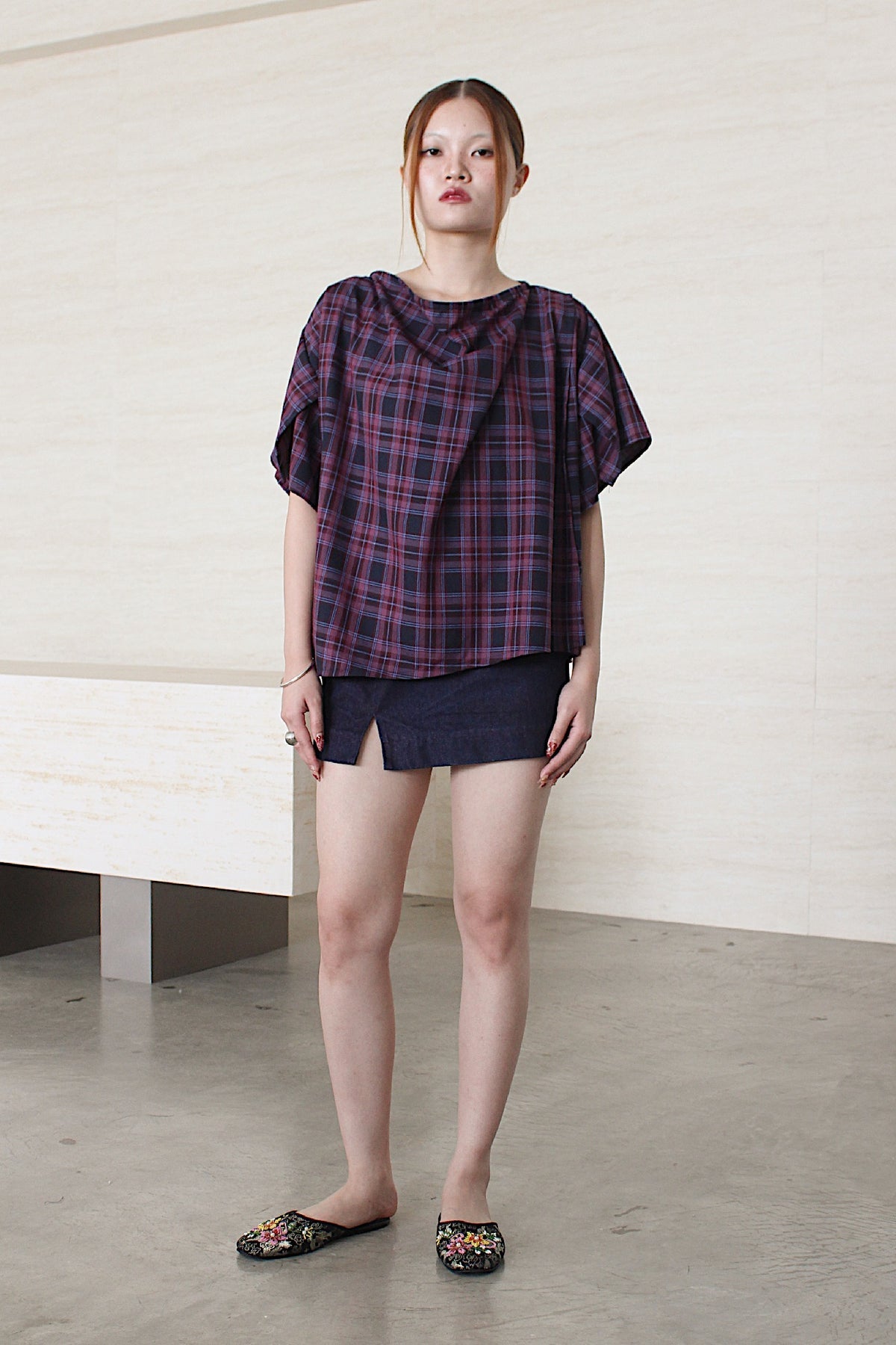 The classic mini skirt embellished with laser engraved metal tag. Made from navy denim fabrication with a hint of voilet undertone.