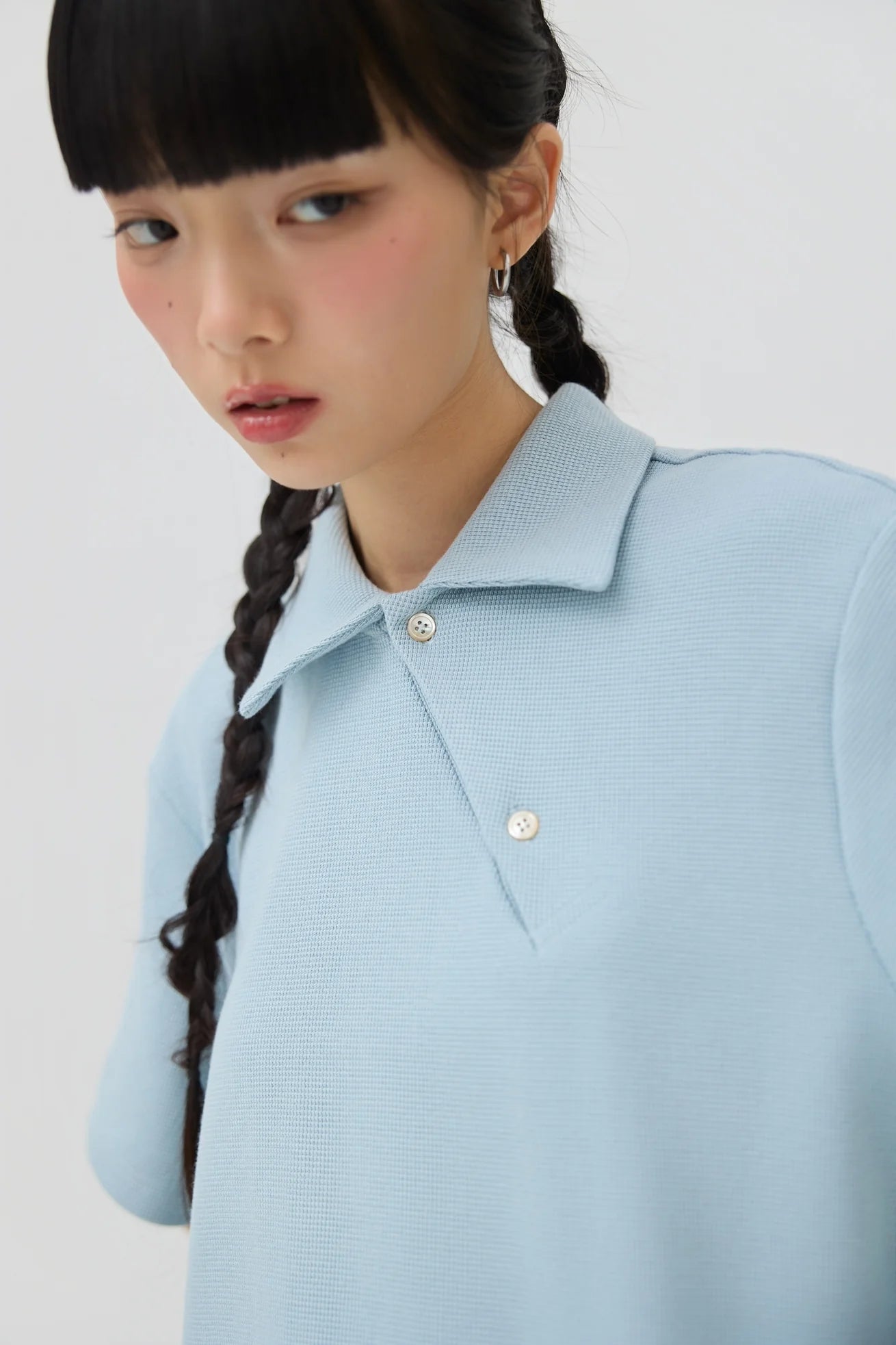 A boyish polo silhouette refined with a cheongsam-inspired collar. Relaxed in fit, structured at the neckline, designed with a waffle knit textured.