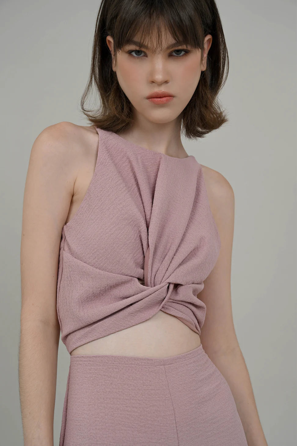 Our Kathlyn Twist in Pink is crafted from a textured fabric, this dress features a round neckline, cropped waist front, and central interlocked twist detail. Elevating this streamlined style. Enjoy the versatile dusty pink hue for any occasion.