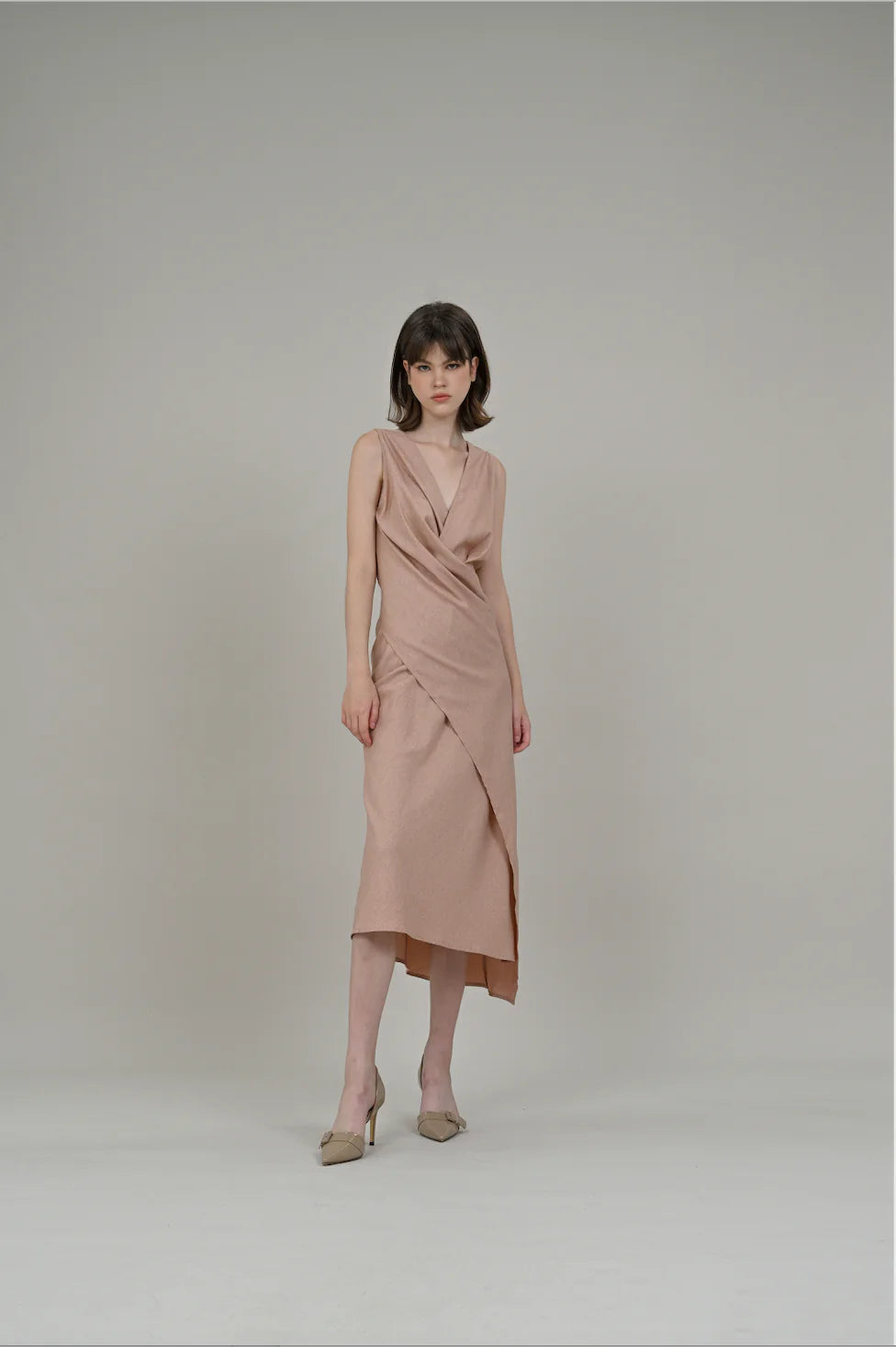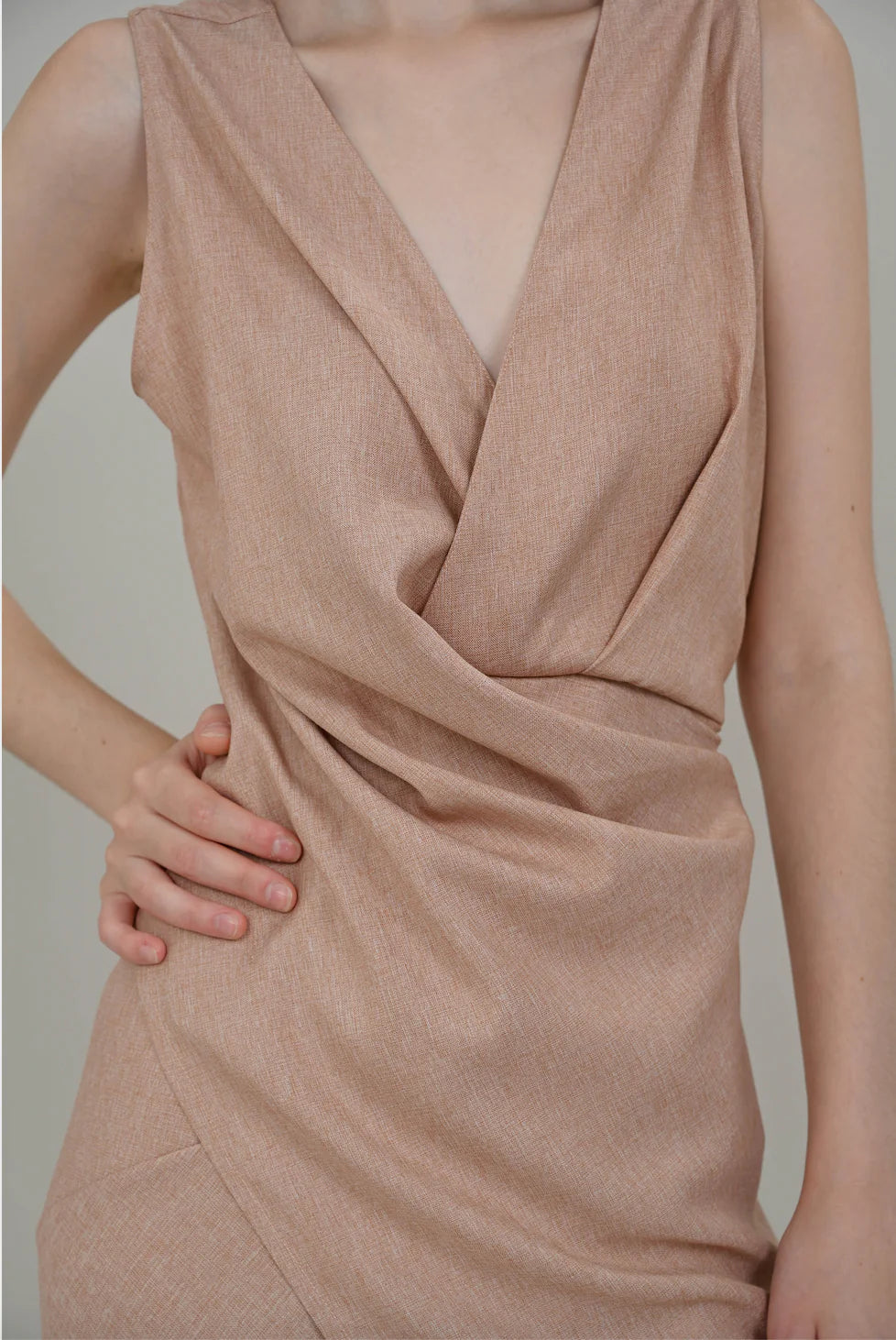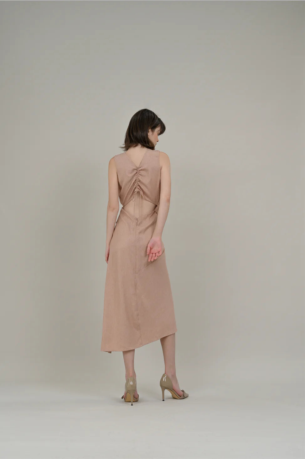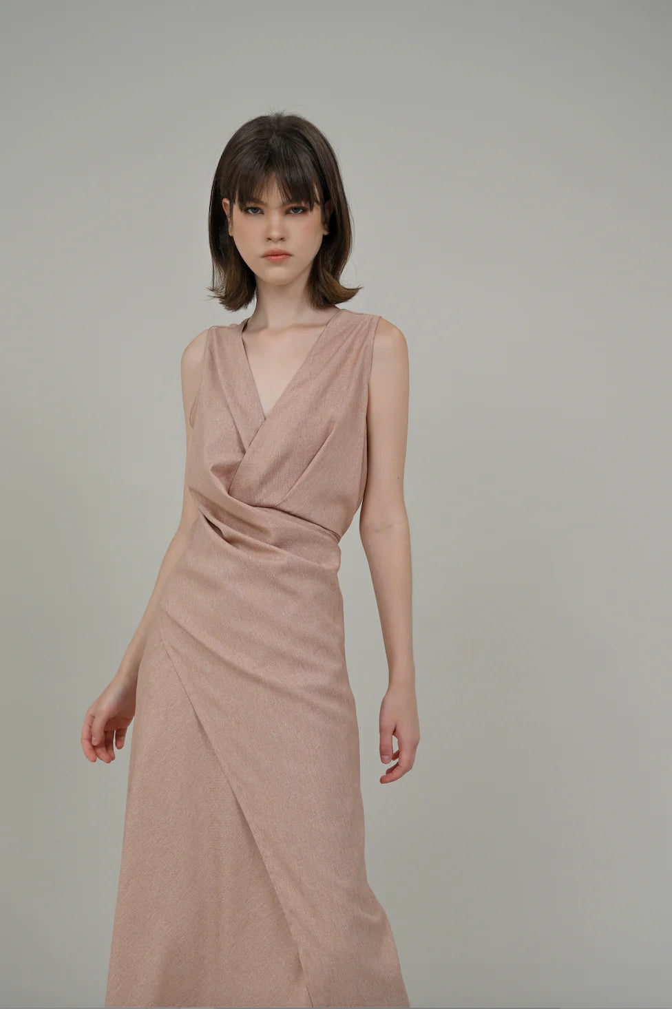 Our Katie Blush Marie is cut with a low V-neckline. Fitted at the bodice, this style features drapes across the center front and complimenting box pleats to enhance the waistline. The back of this piece is detailed with adjustable straps that create gathers. A streamlined skirt is finished with a bias hemline to complete this silhouette.