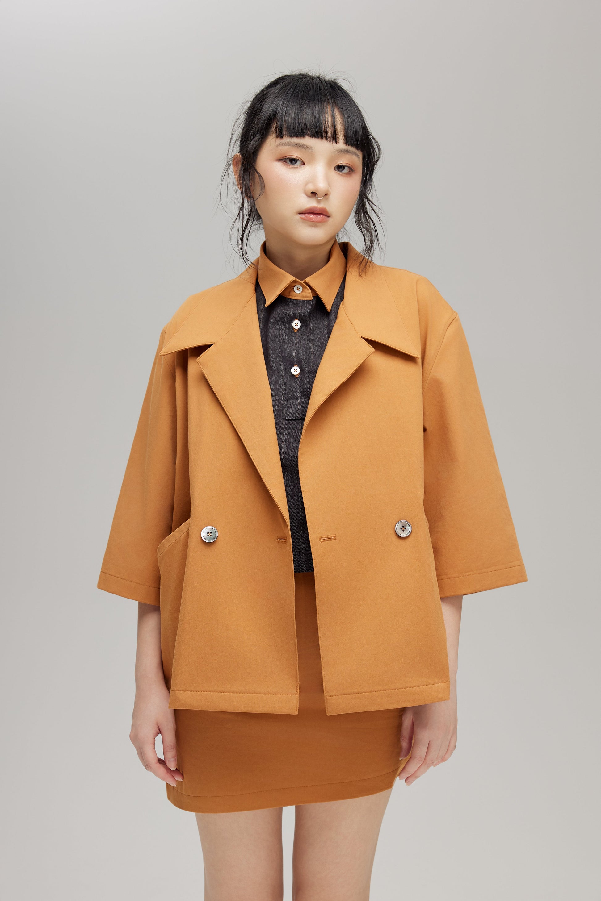 Where east meets west - a kimono-inspired take on the trusty trench coat. Made with ¾ sleeves and a slightly cropped length. Features a double-breasted setting that can be styled open or closed, with either panel as an overlap, and slit pockets for storage.