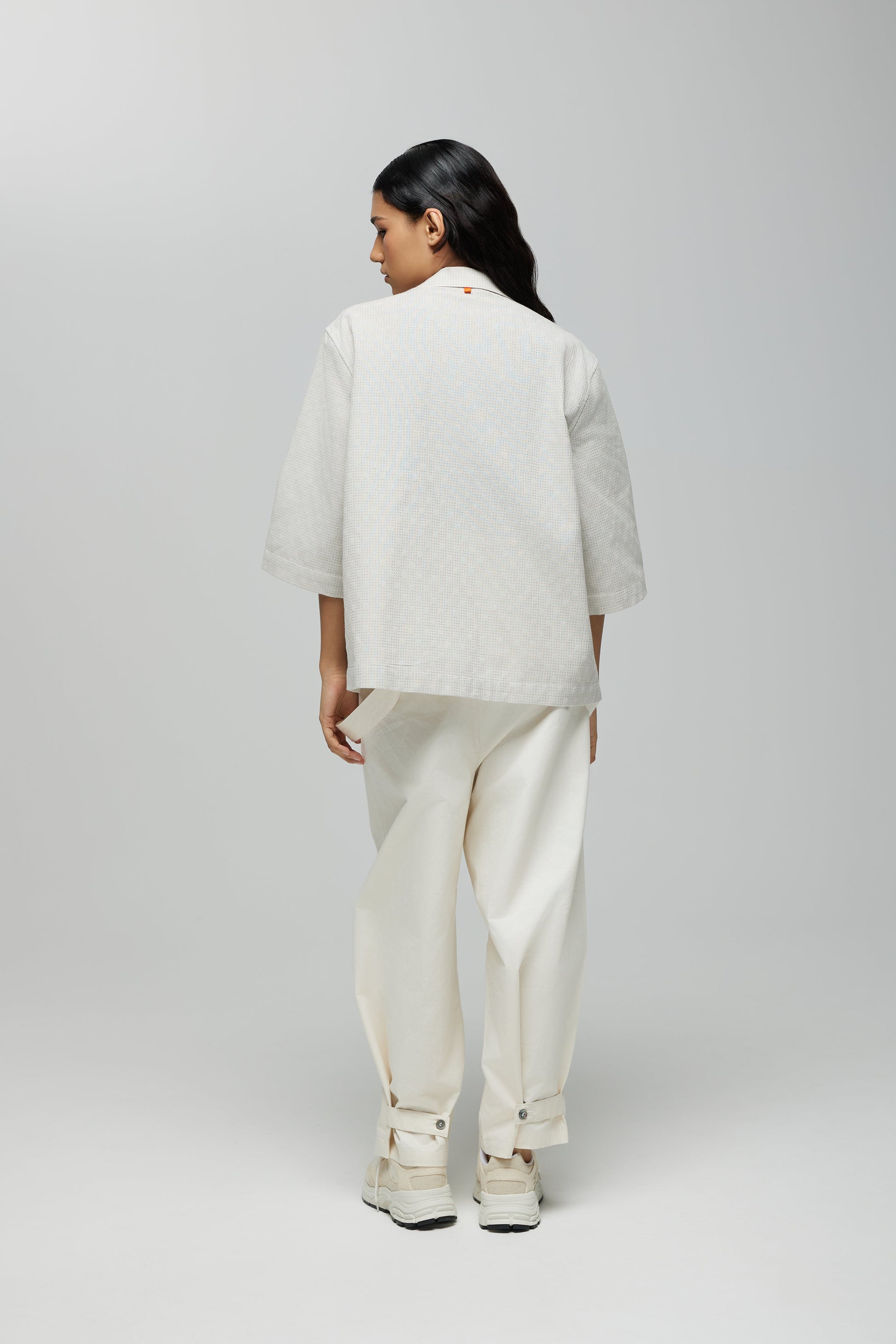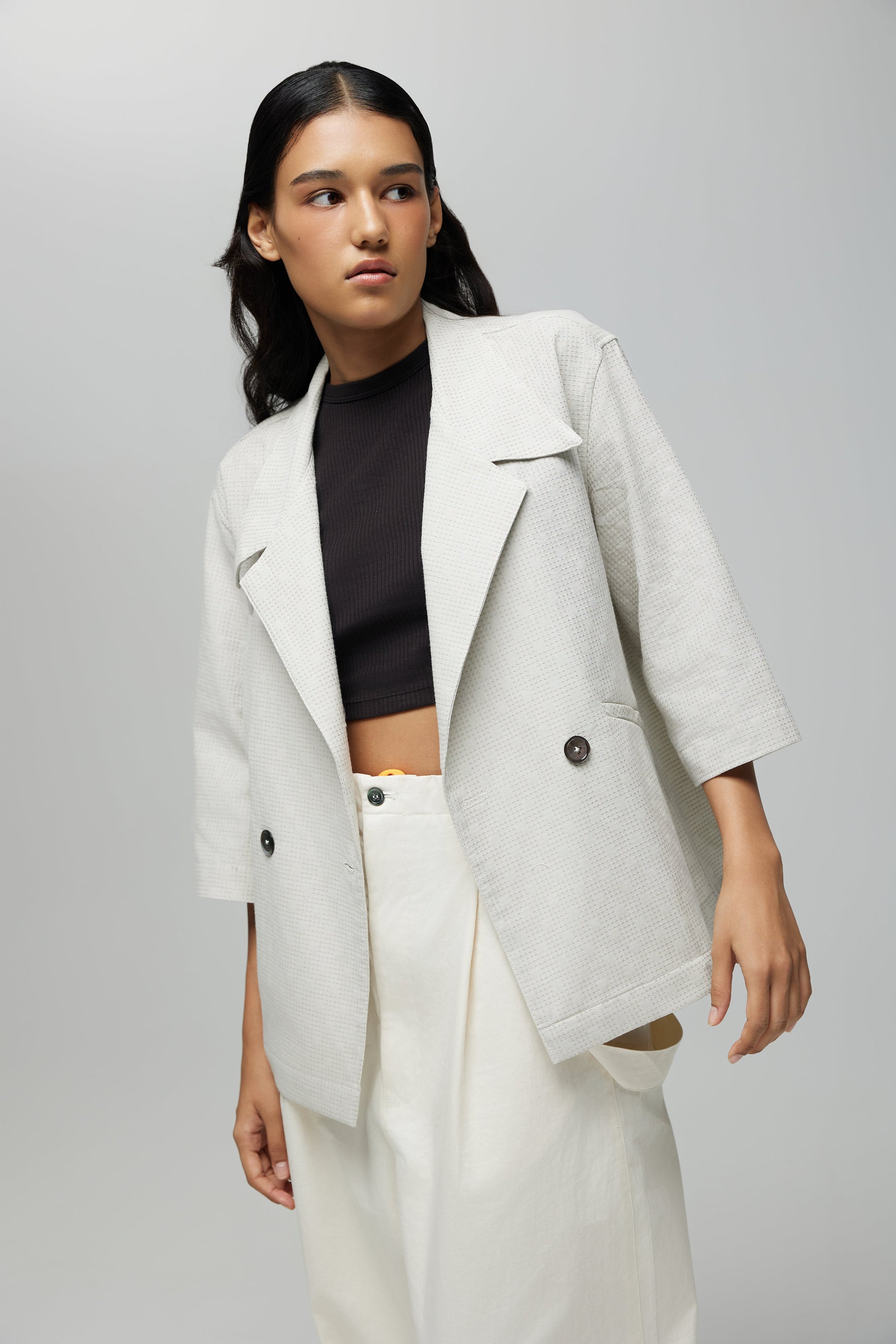 Sashiko fabric with a Grid texture in Oatmeal from Japan, and Mother-of-pearl buttons.