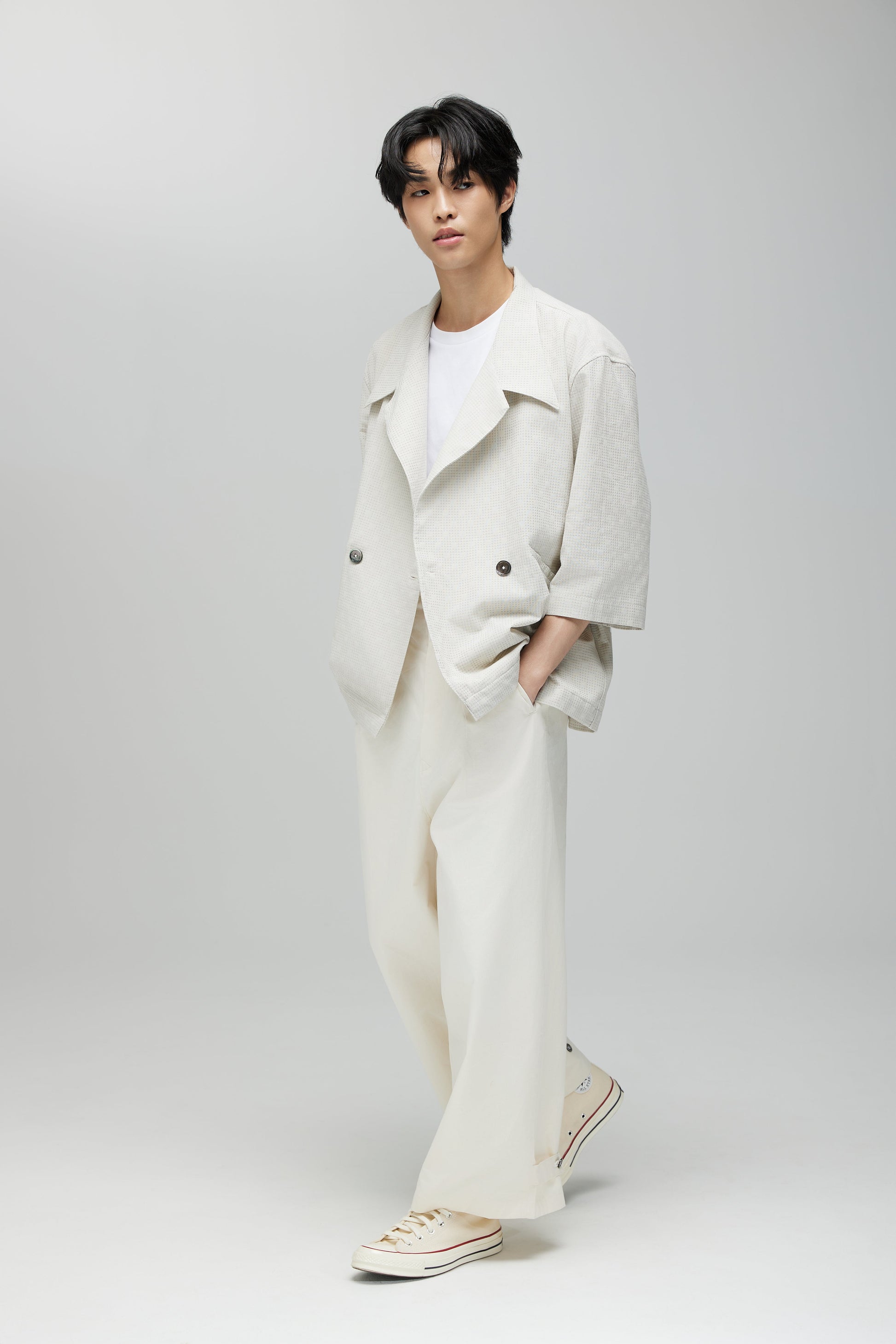 KIMONO TRENCH JACKET IN OATMEAL GRID SASHIKO (JAPAN)