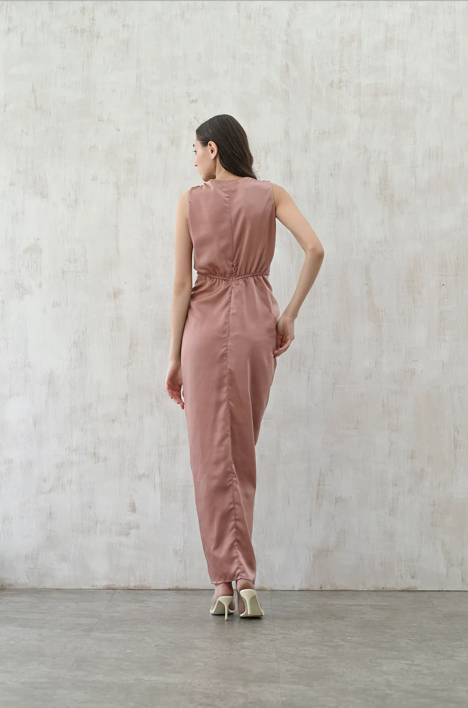 Crafted in Dusty Rose for light weight, satin finish that falls seamlessly down the body. This delicate fabric floats over the skin accentuating graceful movement with a subtle flare.