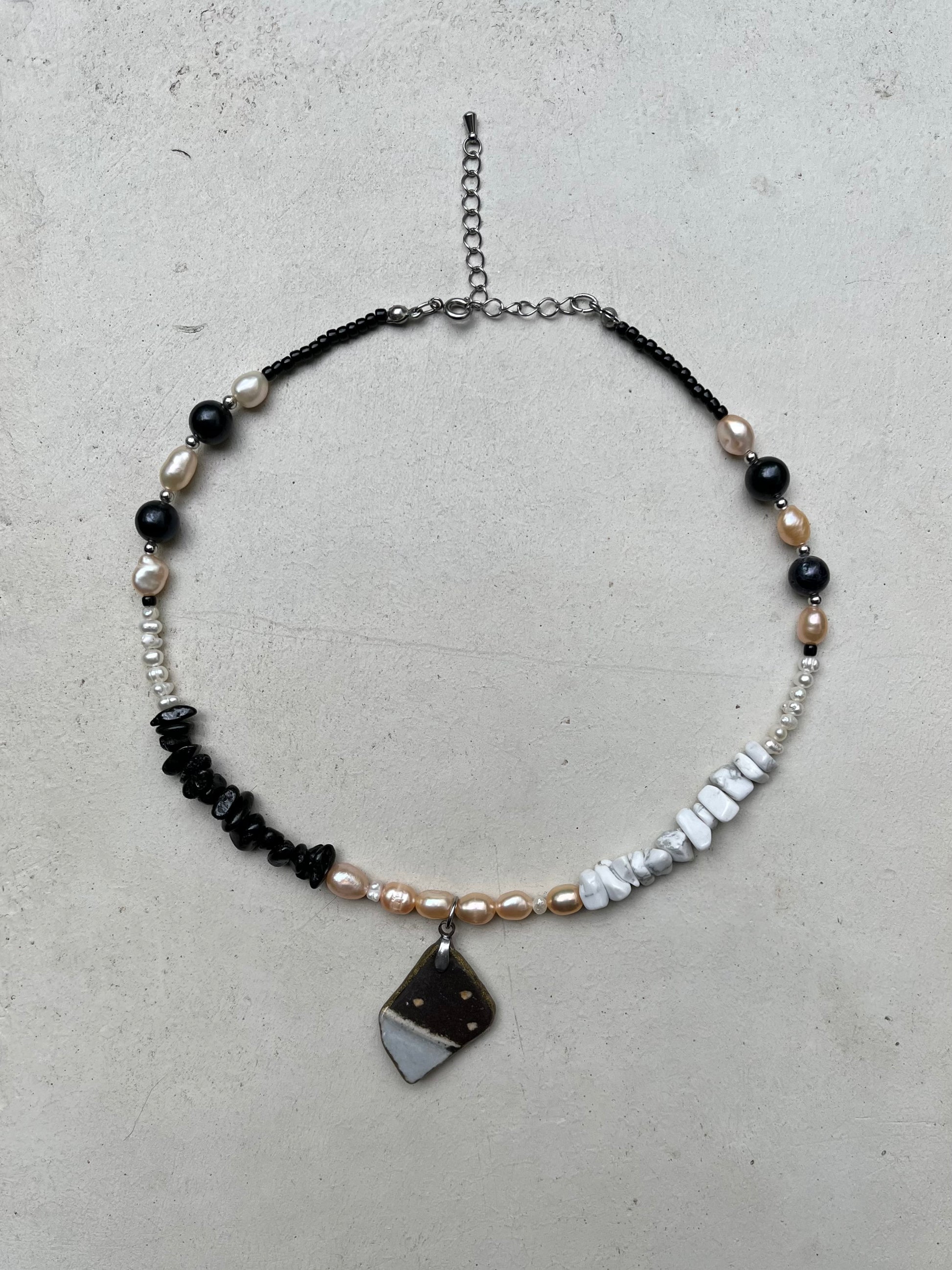 Material: mashiko porttery,surgcal stainless steel,freshwarter pearl,plastic beads