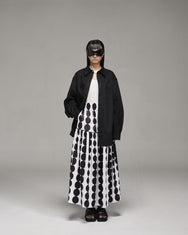 A lounge shirt in a polyester material with a collar and buttons down the front. Loose fit with dropped shoulders, long sleeves and rounded hem as well as hollow at the back.