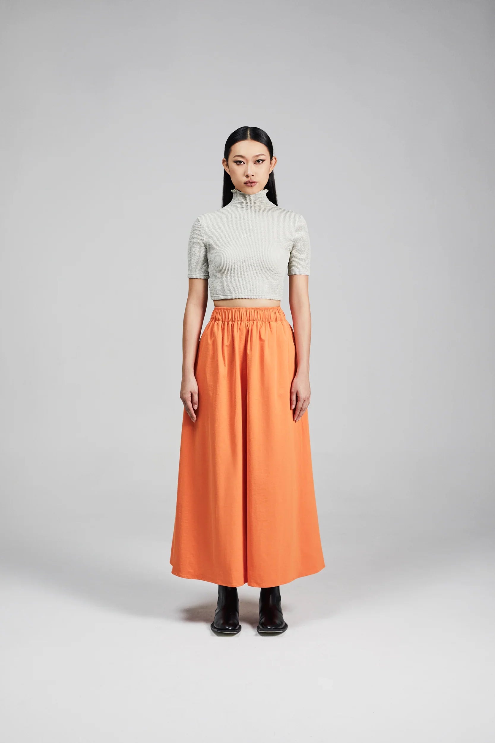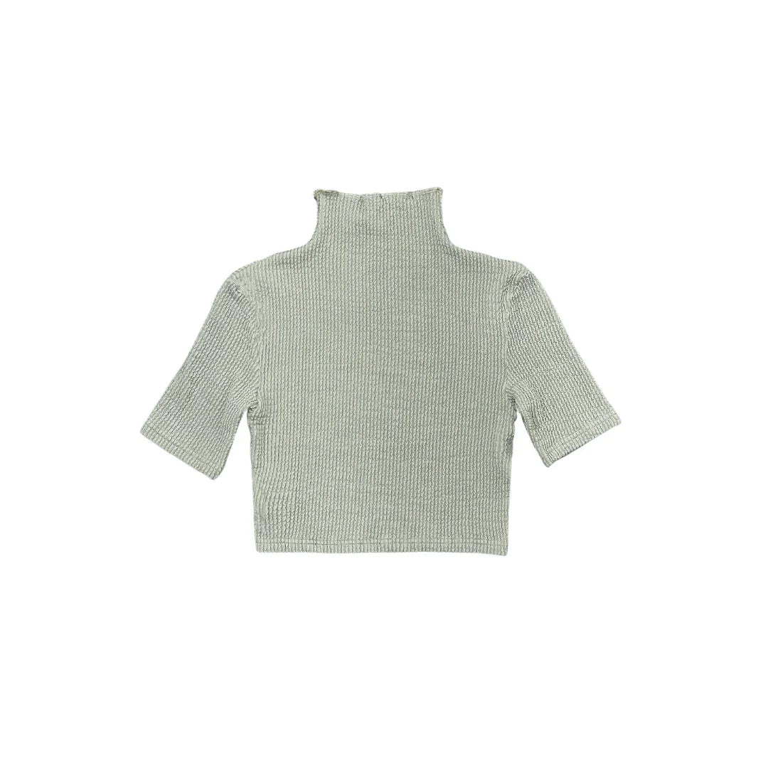 A cropped, short-sleeved top made from soft, stretchable textured material. With a stand collar cut, it adds sophistication to its versatile design. Effortlessly complementing various outfits, it's the ultimate wear-anywhere piece.