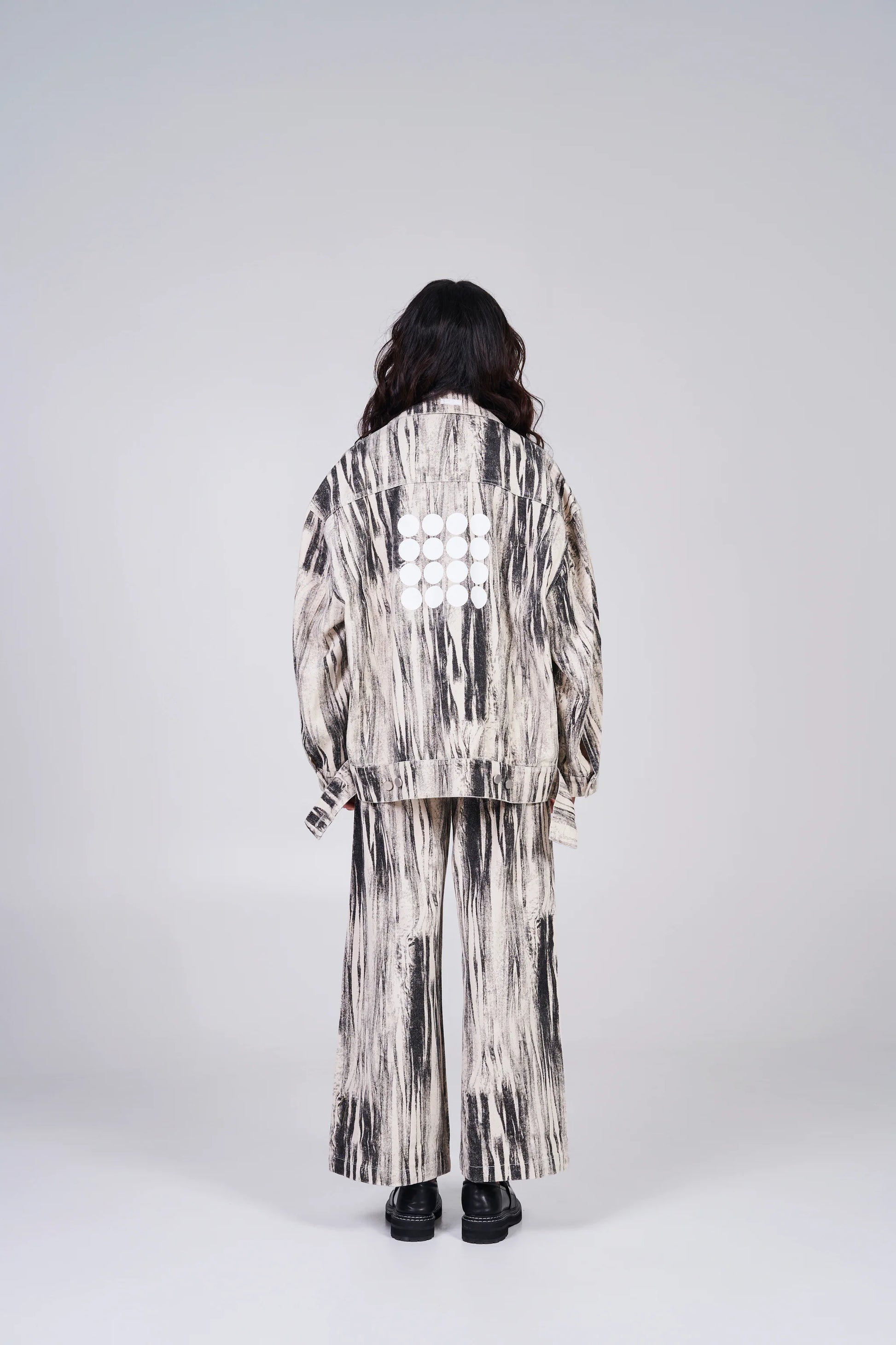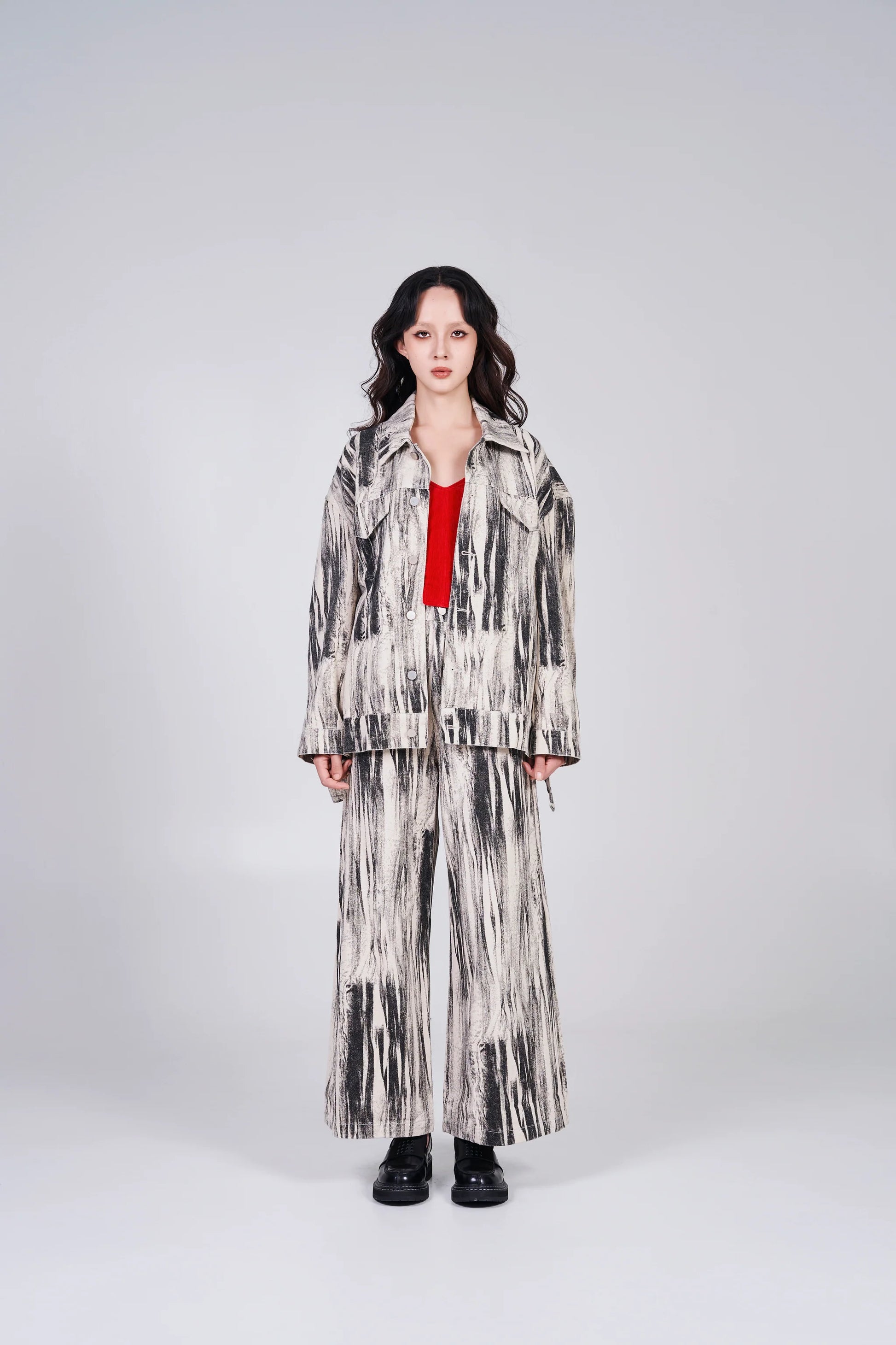 Exclusive for 2024 Lóng Nián. Oversized, distorted print in cotton denim with a collar, buttons down the front and yoke at the front and back. Dropped shoulders, buttoned cuffs, discreet side pockets and flap chest pockets with button. Logo at the back and collar for a pop up of branding.