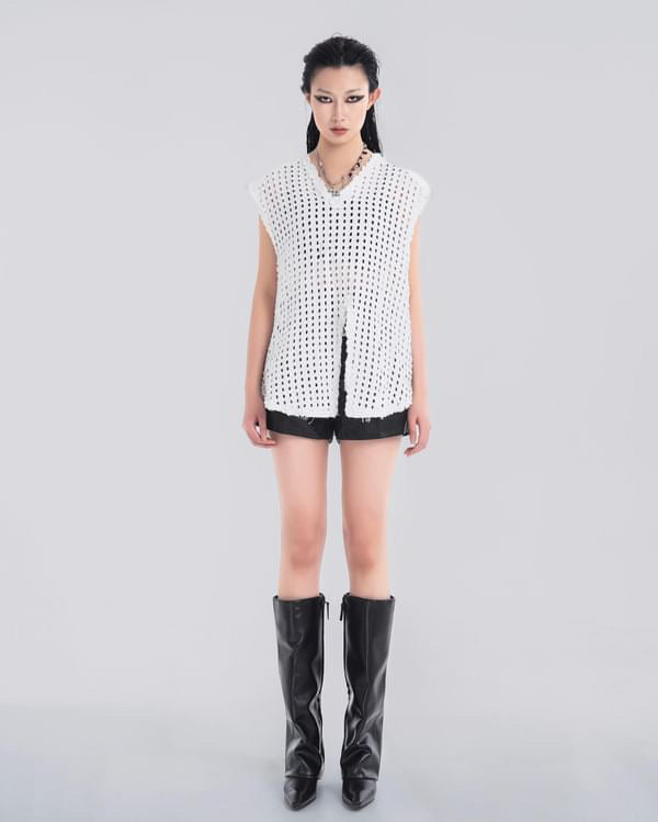 Step up your style game with our Sleeveless Hollow Out Top. Featuring a trendy raw hem and hollow-out design, this top is perfect for a chic, casual look. A logo patch at the back adds a touch of branding. For an even more oversized effect, feel free to size up. Ideal for layering or wearing solo, this top is a versatile addition to any wardrobe.