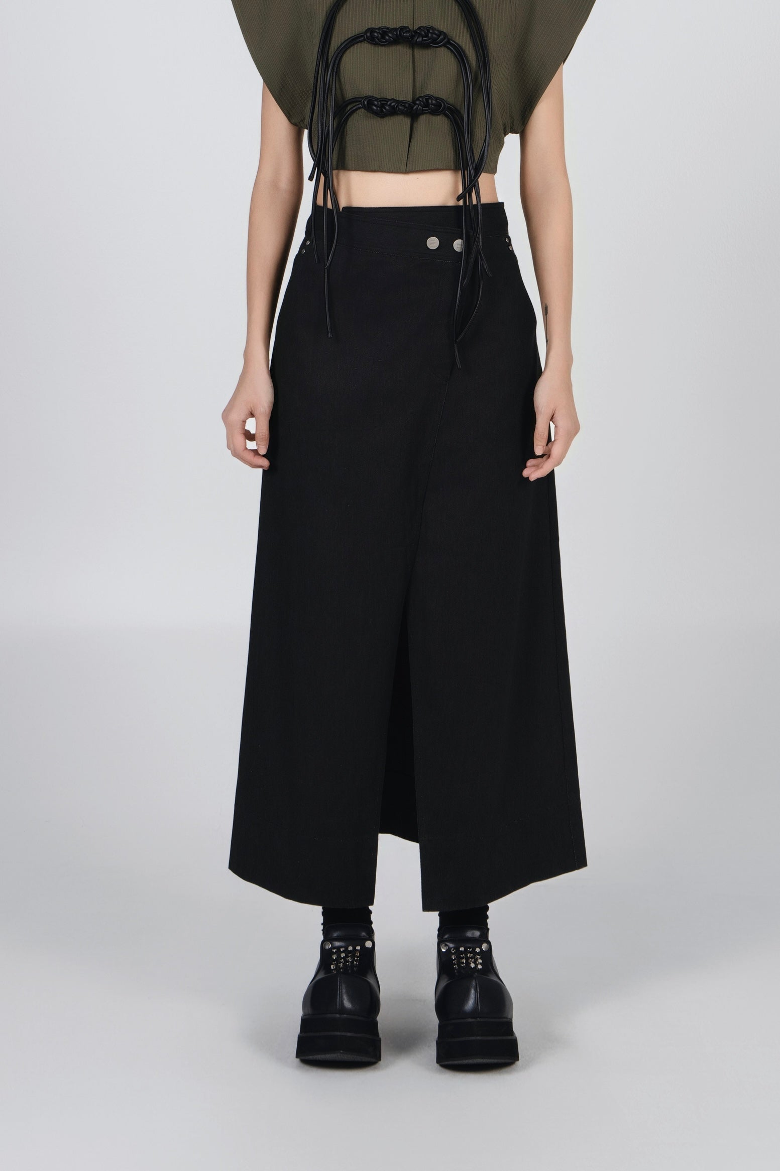 Featuring an asymmetrical waistband and a chic front slit, this denim A-line skirt combines style and versatility. Its flattering silhouette makes it perfect for both casual and dressy occasions, ensuring it becomes a timeless staple in your wardrobe. Pair it with your favorite top and footwear for an effortlessly polished look.