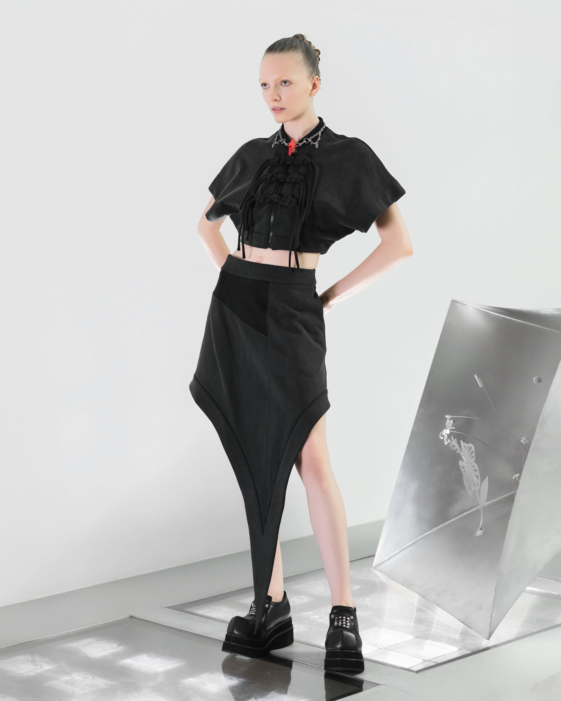 A high-waisted, asymmetrical mini skirt with an extreme, sculptural design - one side stays short, while the other extends into a sharp, elongated, dagger-like point that drapes dramatically down the leg.