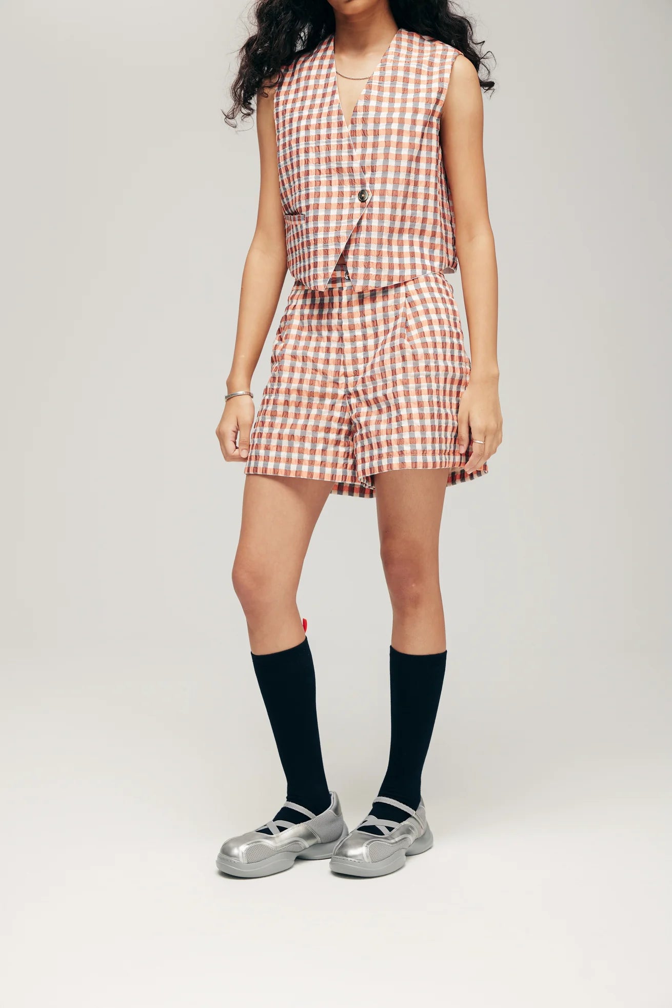 Orange Metallic Seersucker piece from HOKKOH (Japan) - 82% Polyester, 12% Cotton. Inner lining in 100% Cotton. Shell buttons in White.