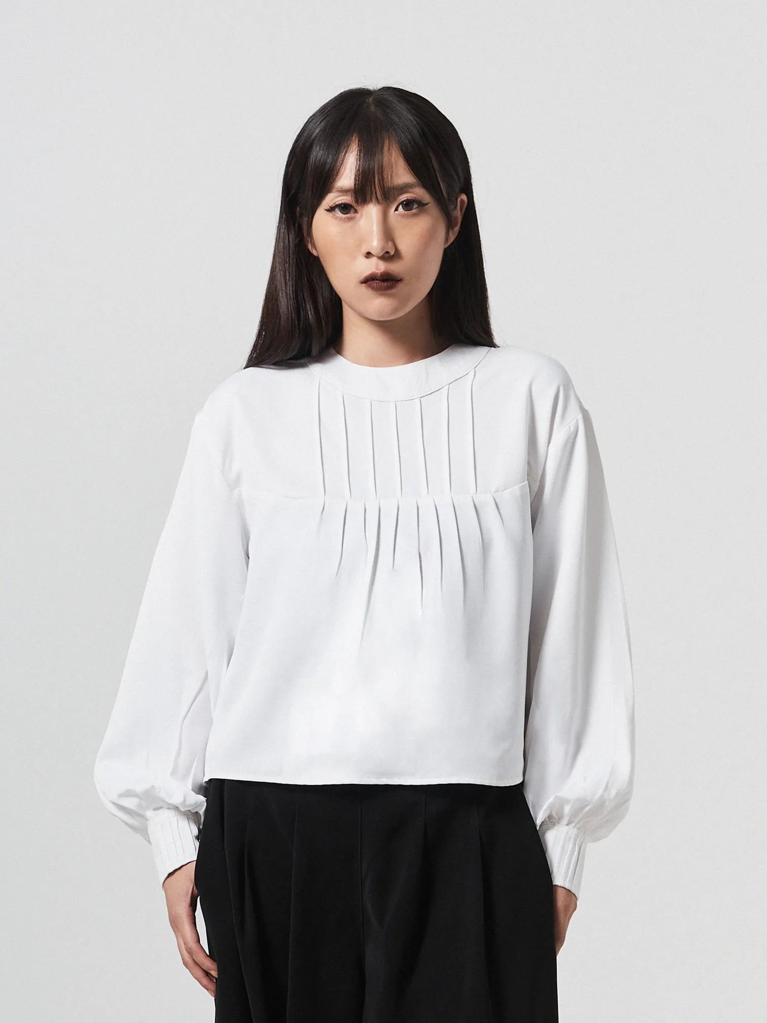 Grace Pleated Long Sleeve Top is the front of this exquisite piece is adorned with several pintuck pleats, the thoughtful design extends to the cuffs, where pleats seamlessly continue. To enhance wearability, a button placket at the back adds ease and charm. WIth the addition of puffy sleeves, it completes the ensemble with a touch of romantic allure.