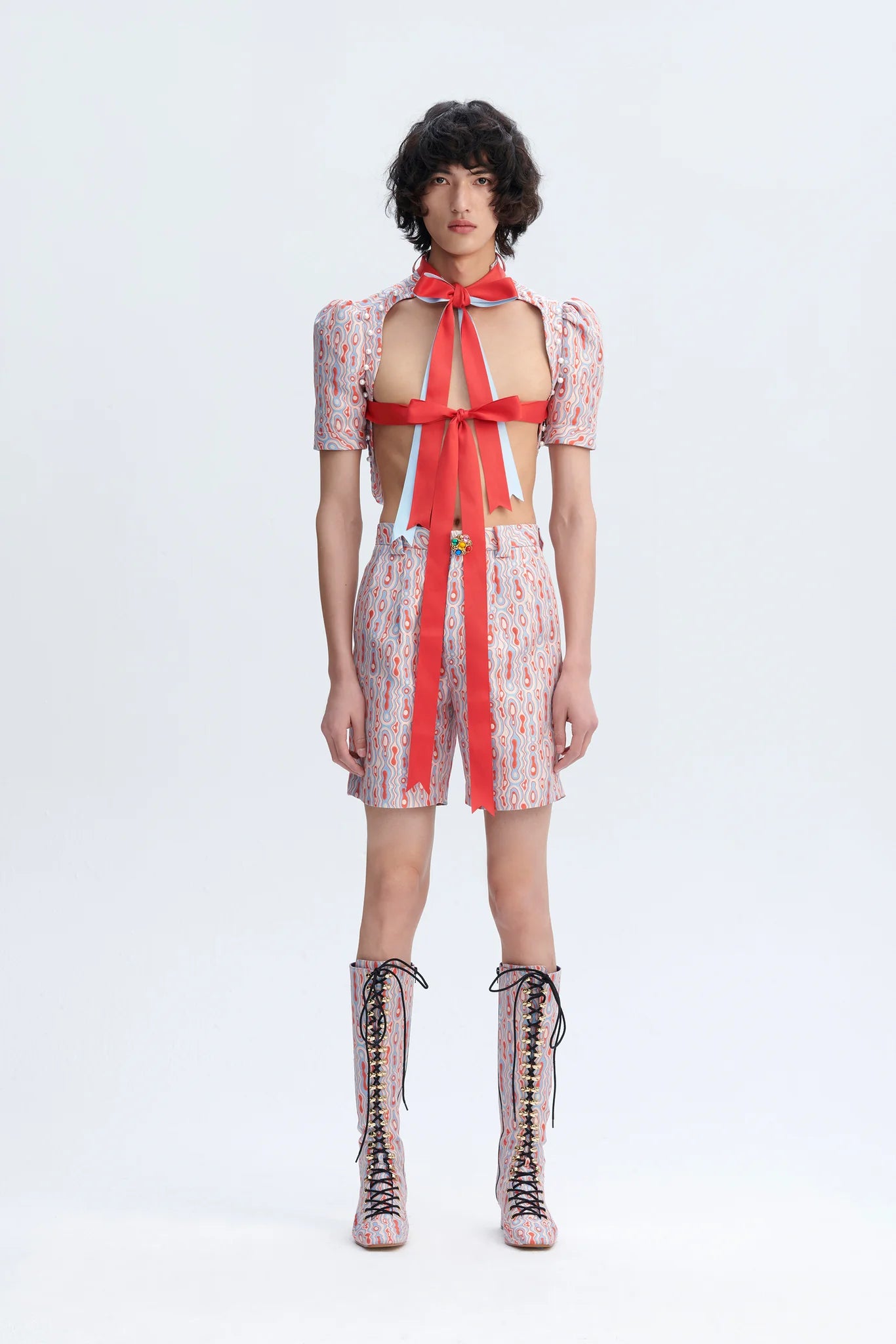 - Loops around neckline band for ribbon/necktie styling