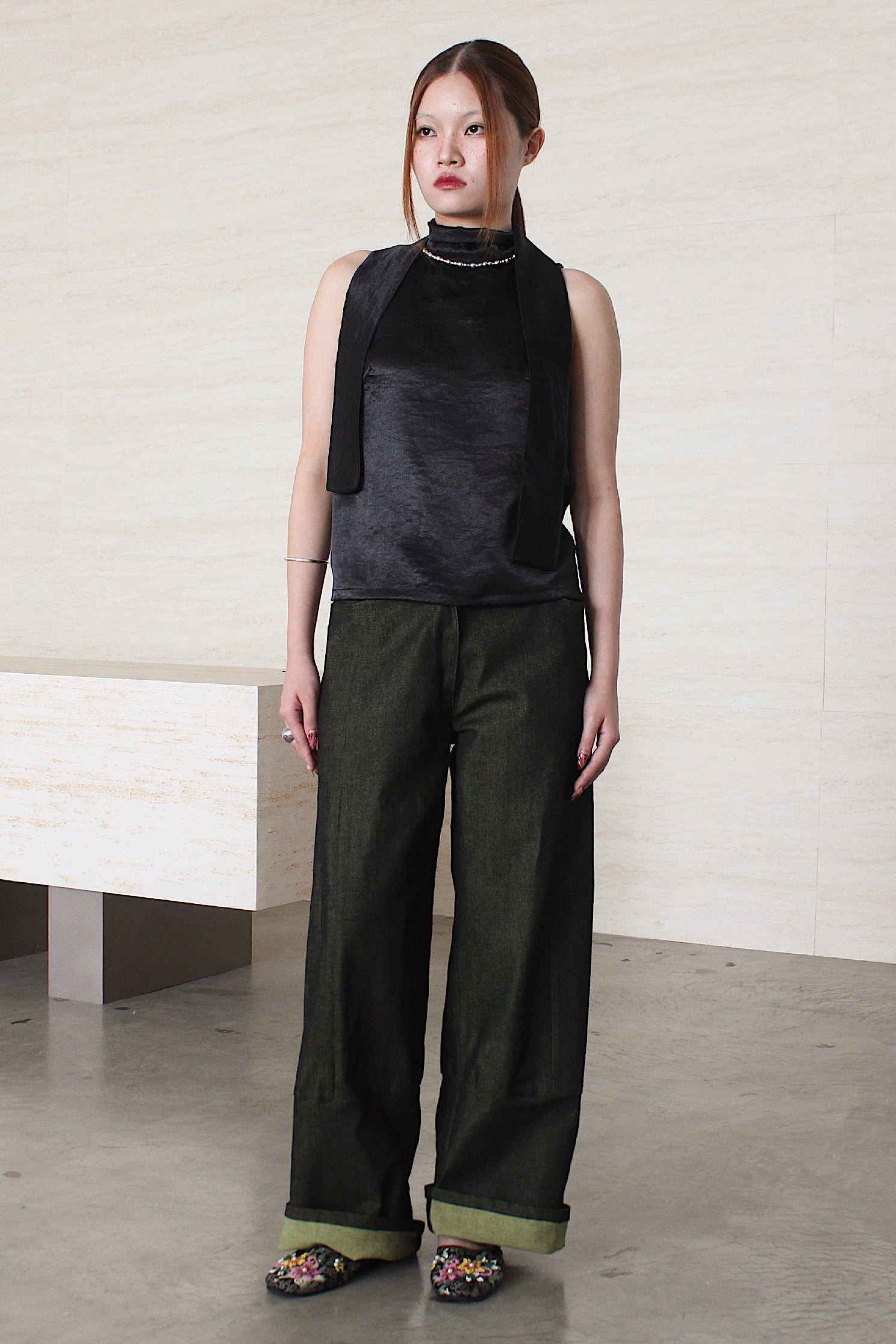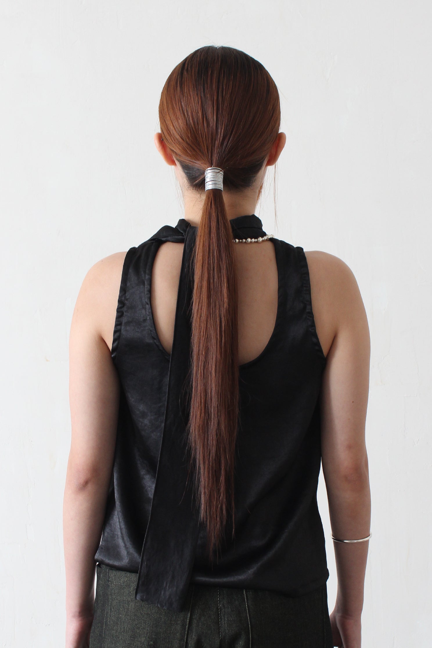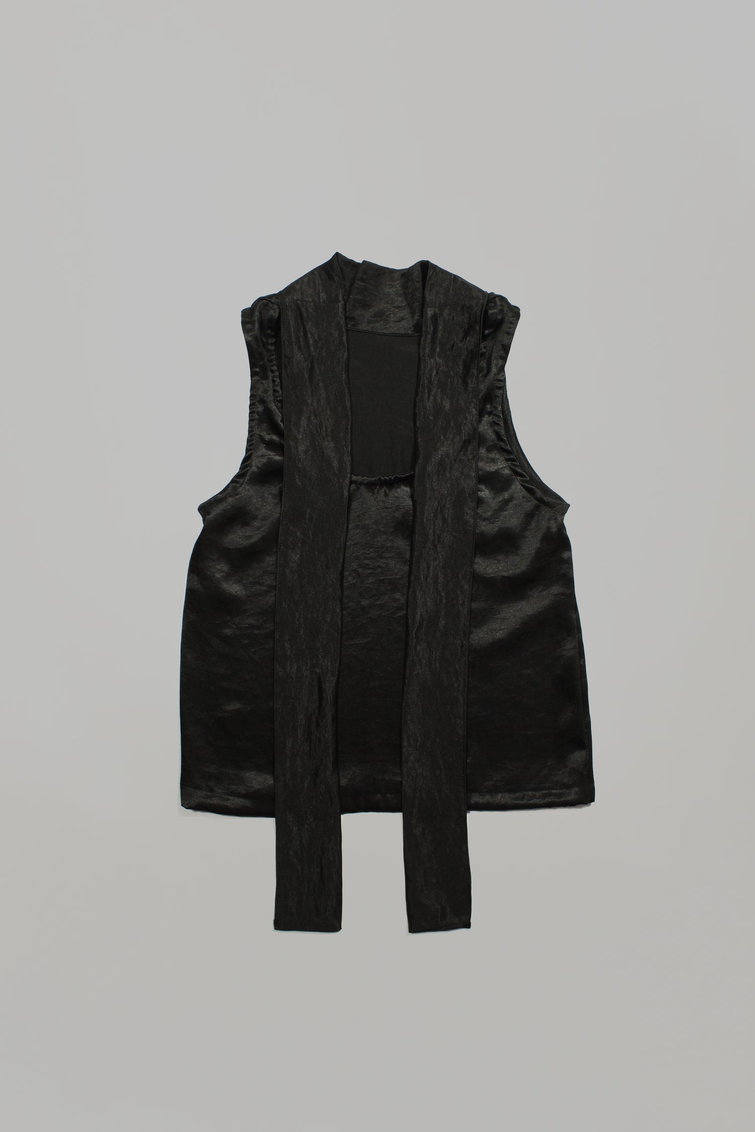 A reversible tank top you can wear either way. Wear as a high-neck or U-neck and finish with a tie (extended from collar). Made from Satin.