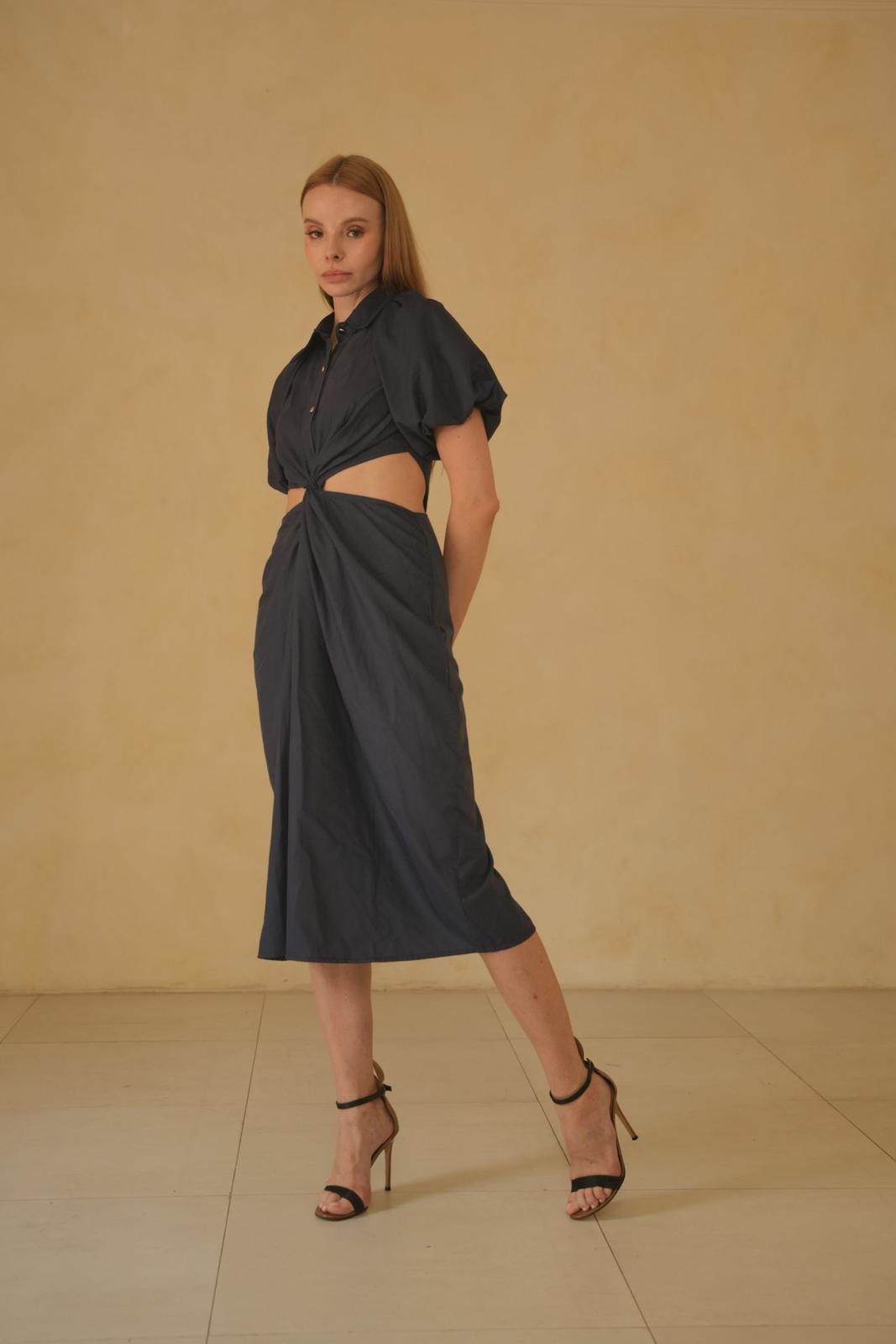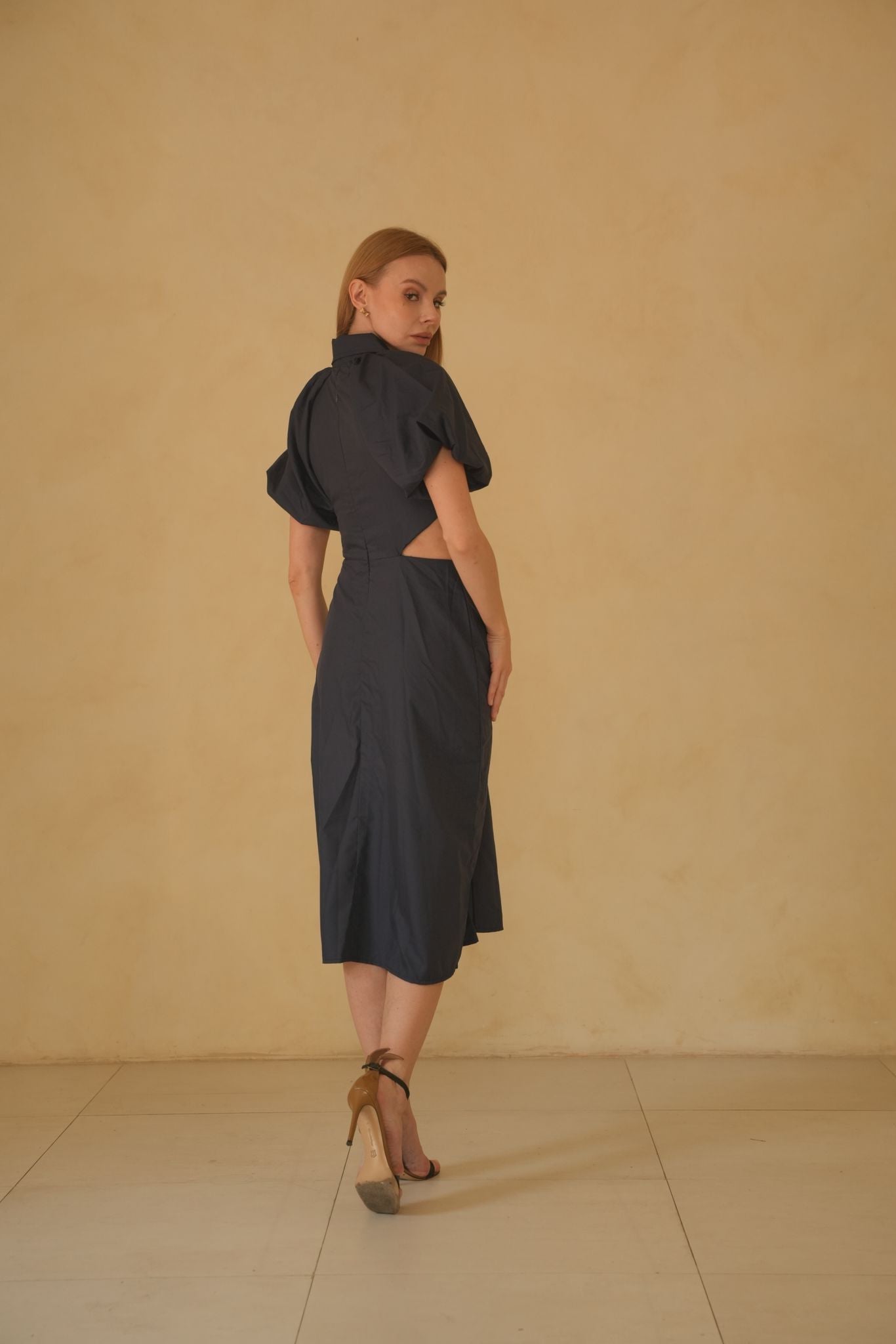 The cut-out sides lend an edgy yet alluring quality to the dress, subtly revealing glimpses of skin and adding a contemporary twist to the classic midi-length silhouette. This daring feature creates a sense of intrigue, drawing attention to Constance's confident sense of style.