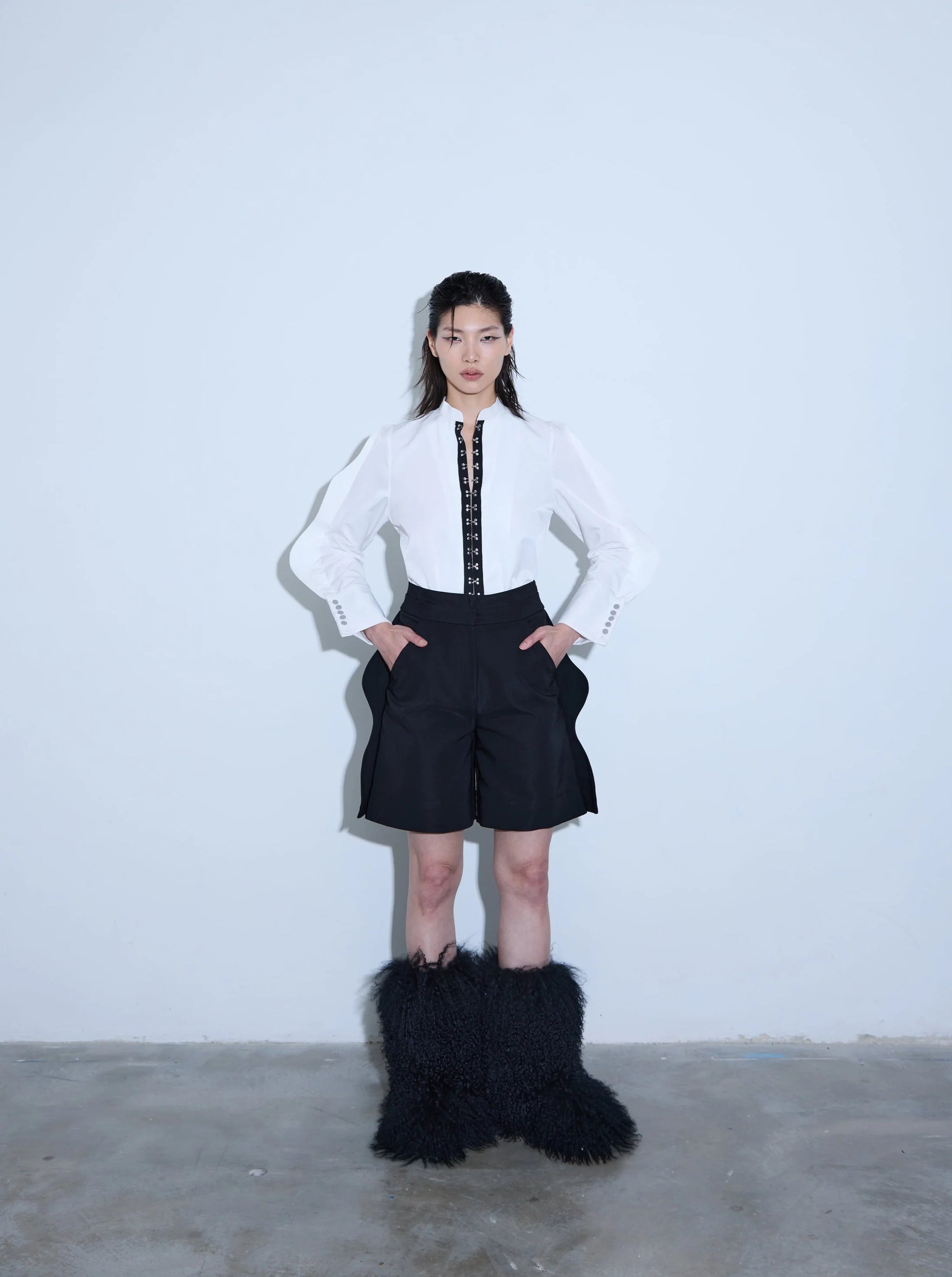 Feel the waves with the Synthe Wavy Bermuda Shorts, featuring wavy panels on the sides. Detailed with ultra-chic wavy panels and a flattering Bermuda fit.