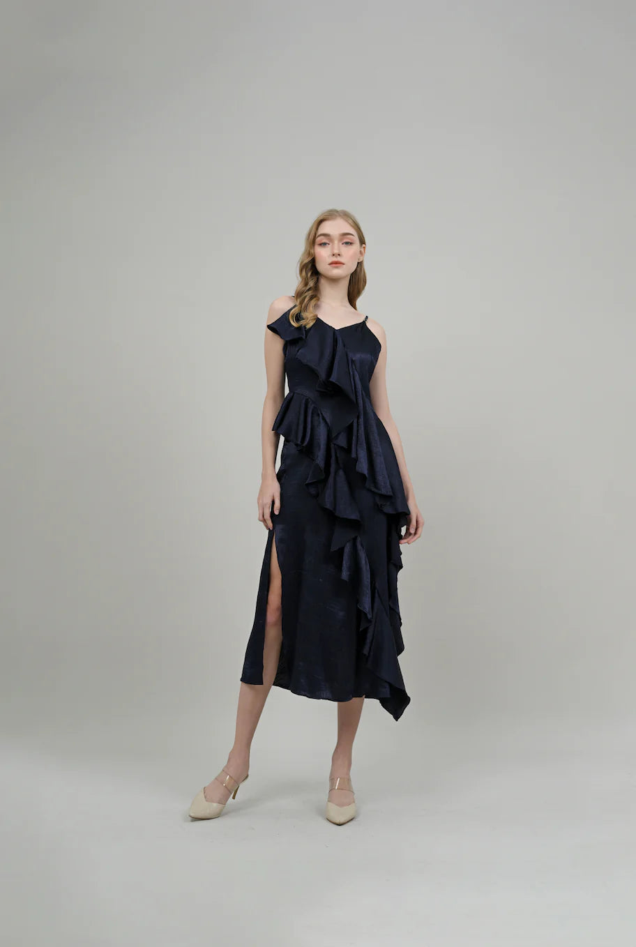 Tabitha in Navy is perfect for events this season. Cut to be fitted at the waist and relaxed throughout. Features full length dress, adjustable straps and attractive soft frill towards the hem. The fabric is designed to asymmetrically sculpt around the body to form a complete silhouette, crafted with a complimenting v- low cut front and finished with thigh high split that is cut away from the bias cut skirt.