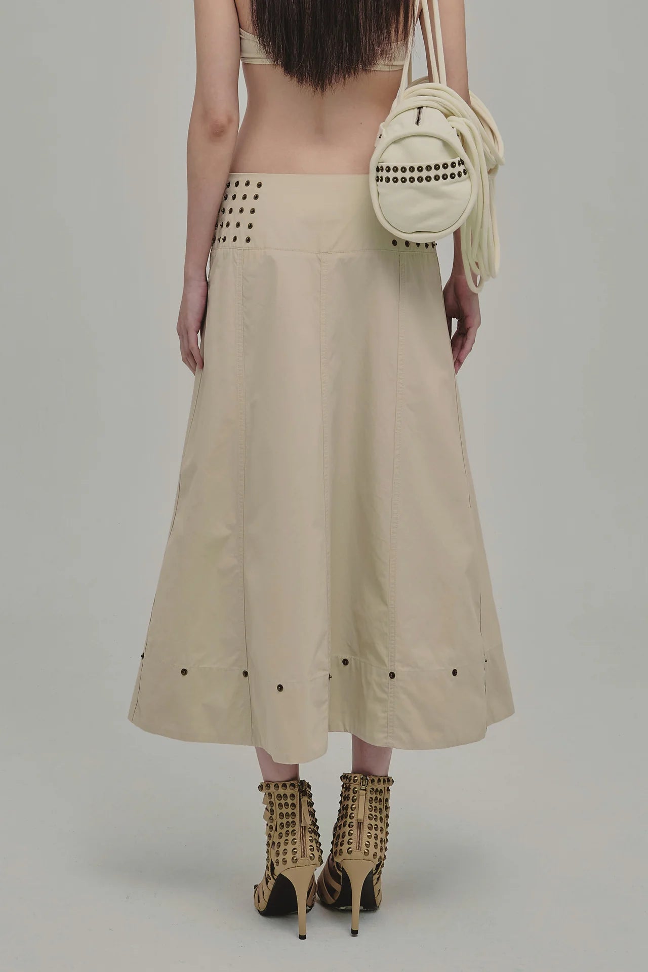 Low-rise, A-line, midi skirt in a lightweight beige cotton