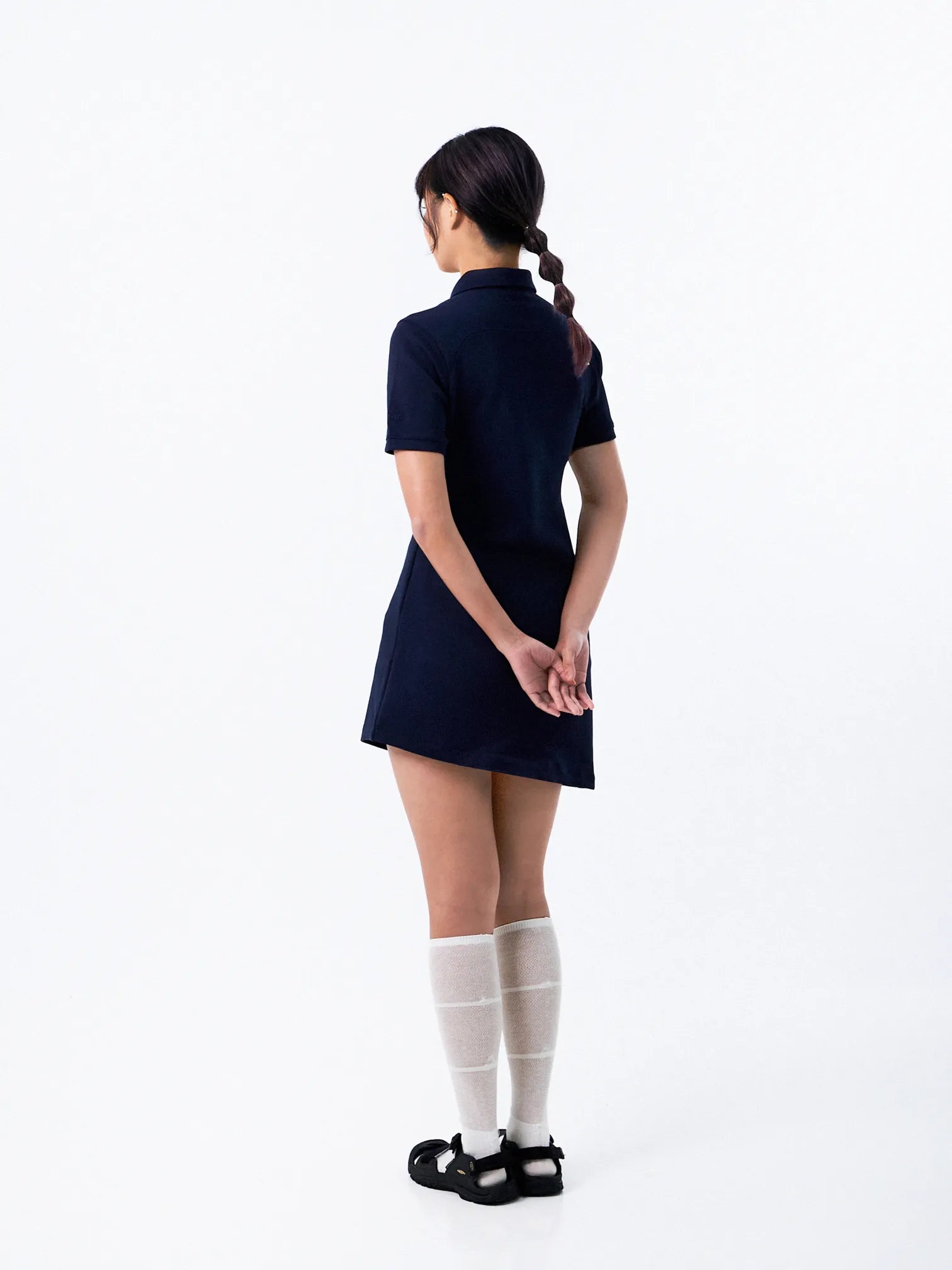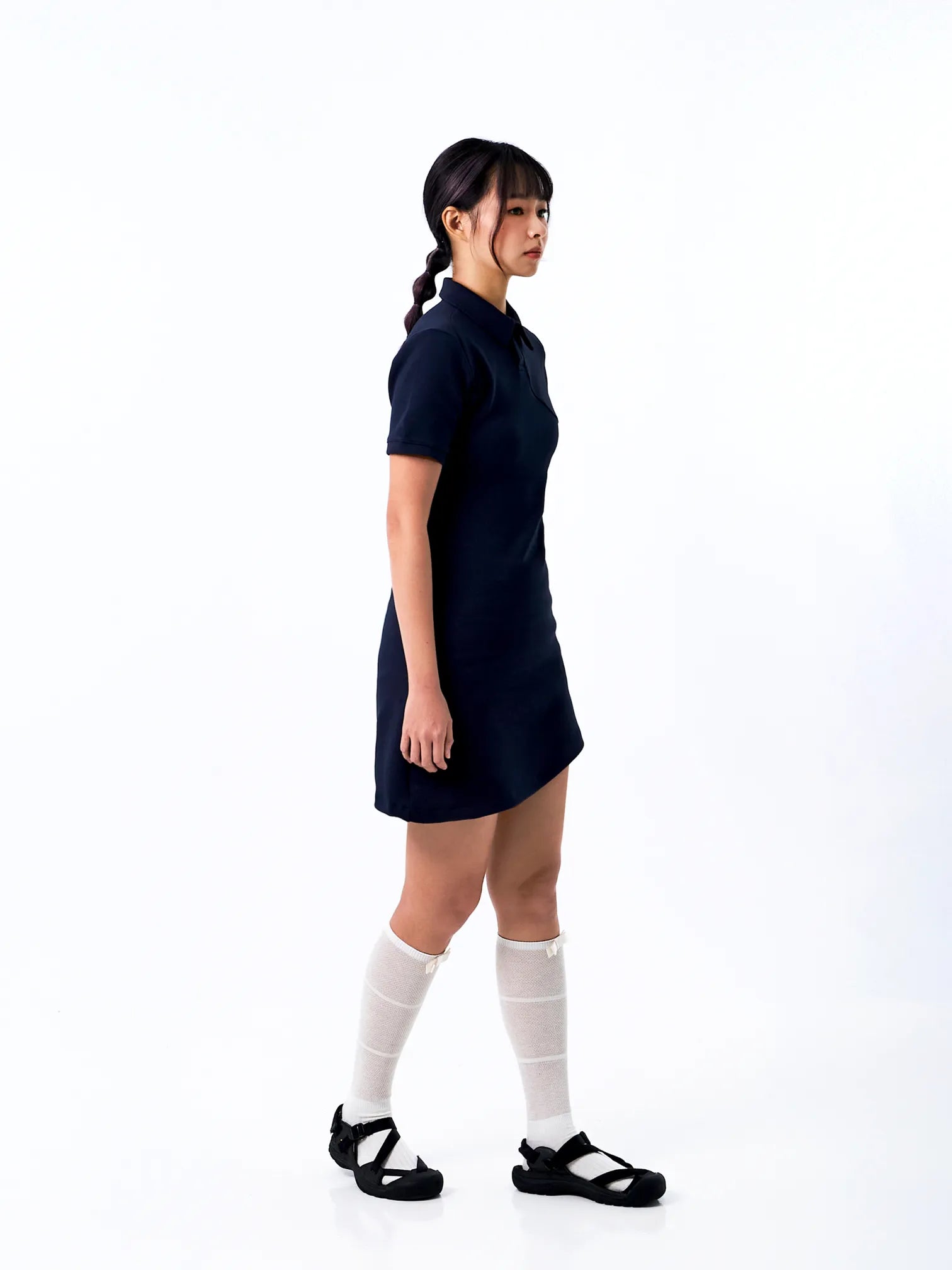 This polo dress features a sleek, figure-hugging cut with a snatched waist and unique cutlines for a modern look. Embroidered sleeves add a refined touch, making it perfect for both formal and casual wear. Versatile and stylish, it effortlessly transitions from day to night.
