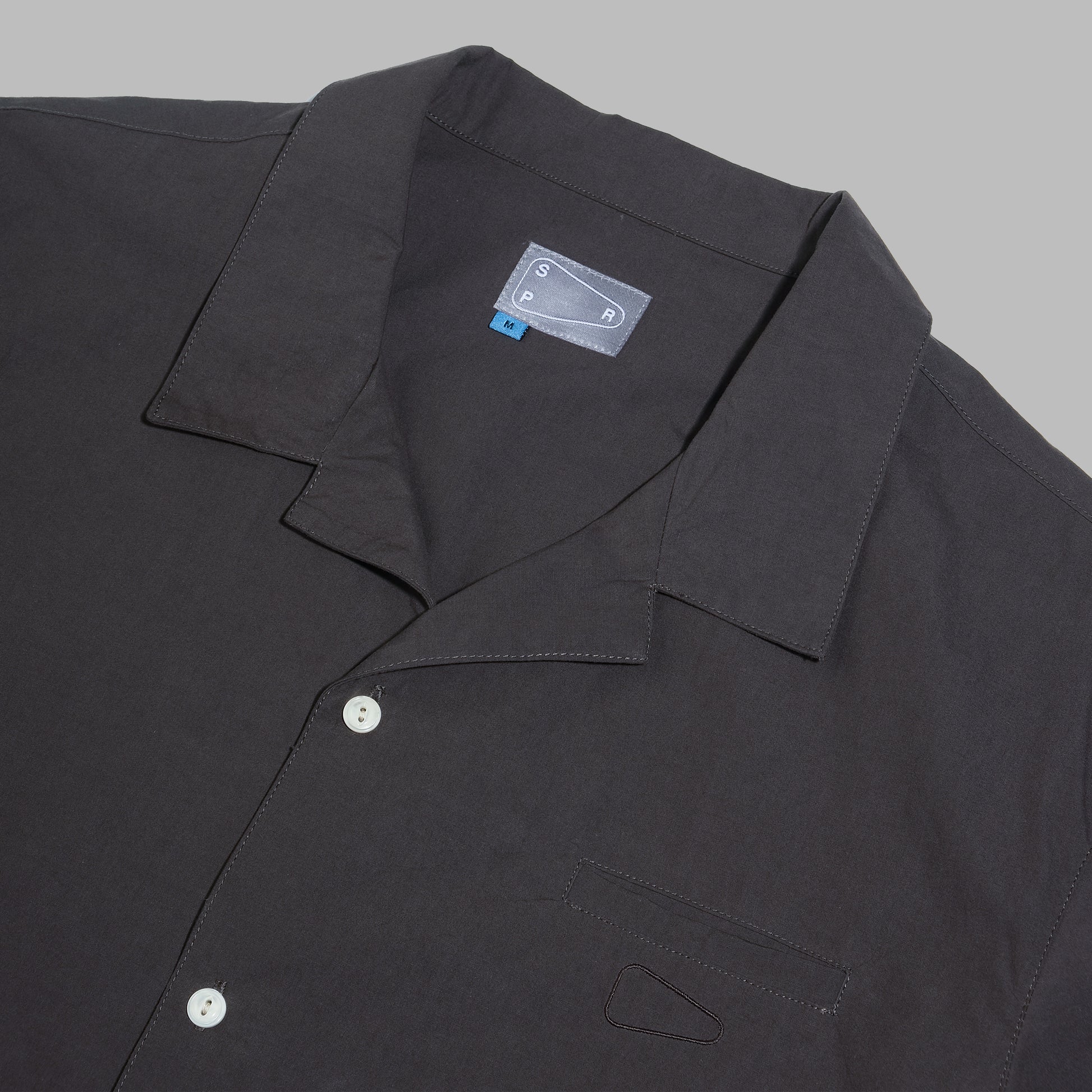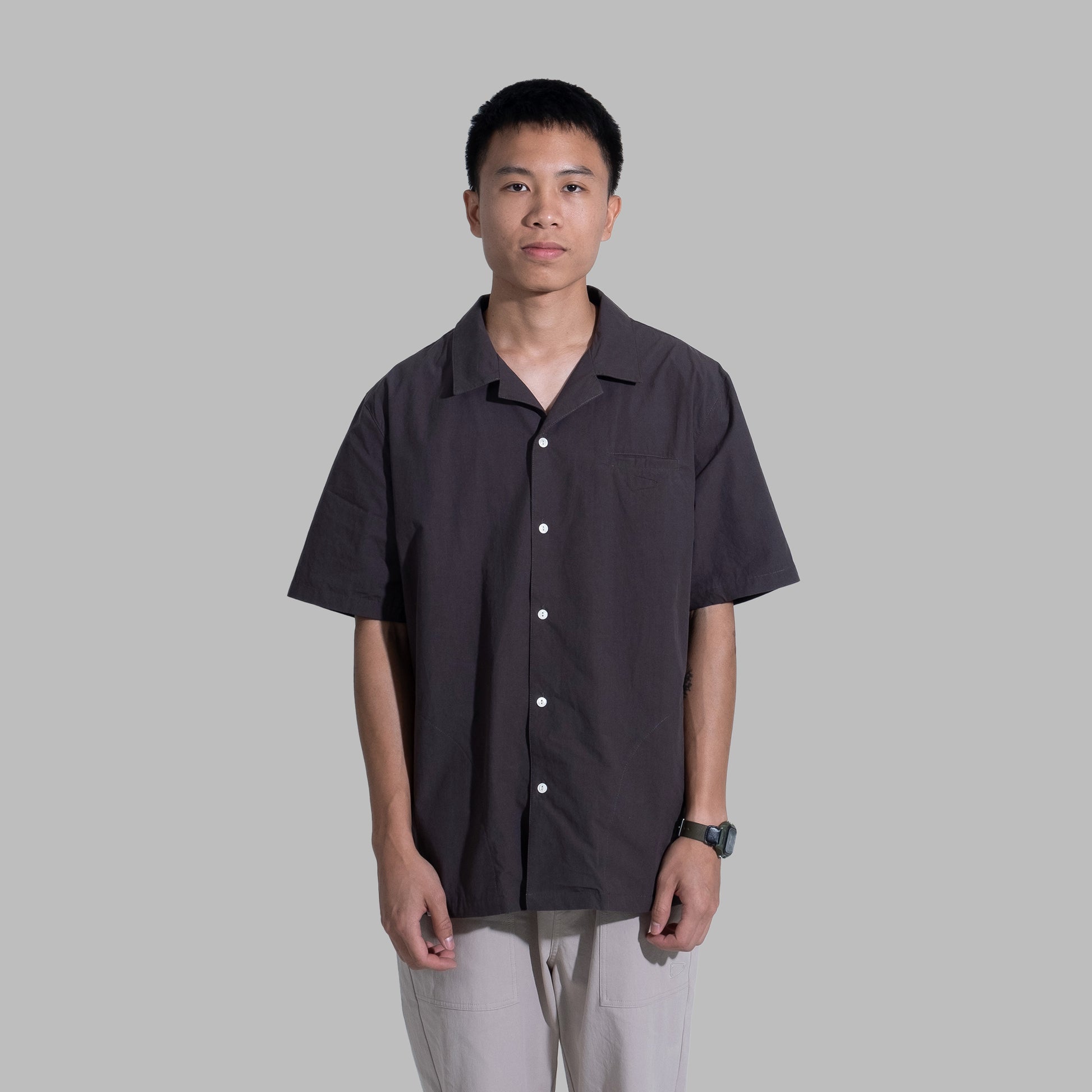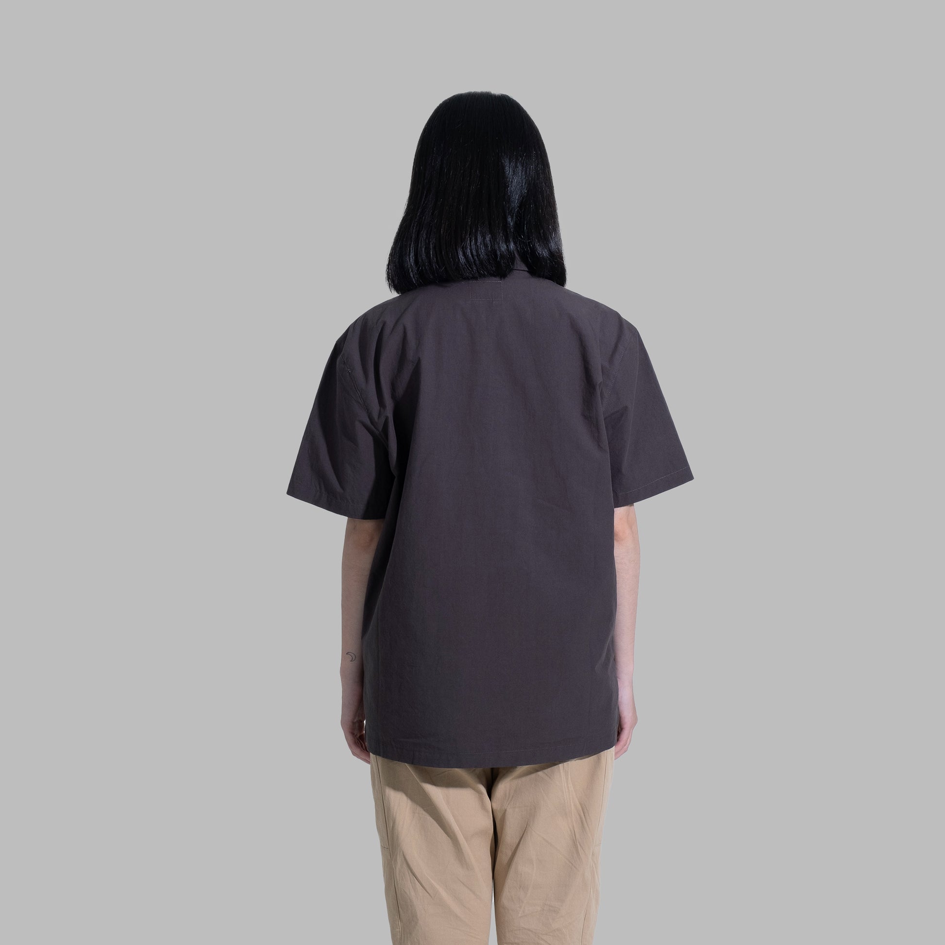 This charcoal cotton work shirt features an open collar, relaxed fit, and two side pockets for convenience. The chest pocket is embroidered for an added touch of style. The breathable fabric and relaxed fit make it ideal for all-day wear.