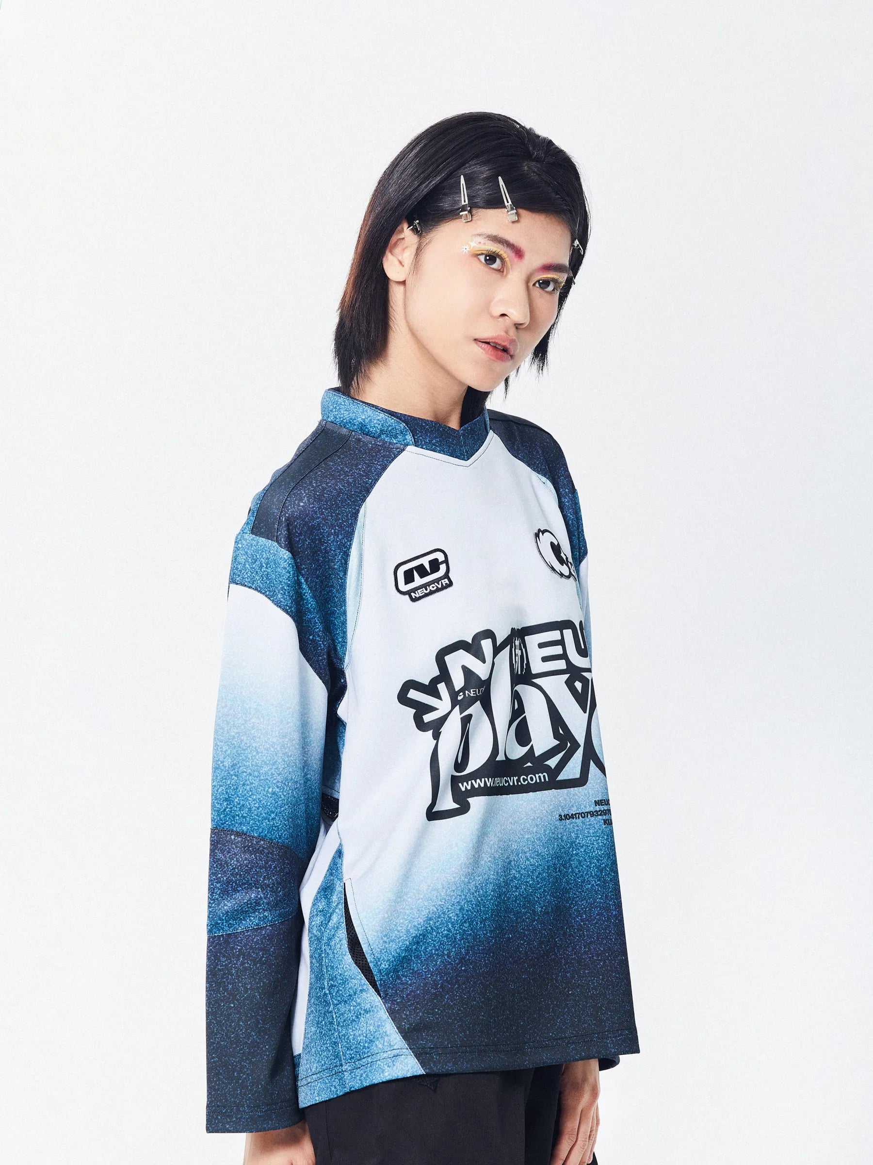 The Zip trick Playmaker Jersey is a unique and functional football jersey that features two back invisible zips that reveal netting for extra movement and ventilation. The jersey has a distinctive blue pattern texture and embroidery patches that showcase the NEUPLAYER club statement. The jersey also has many cutlines and an oriental collar addon that add to its style and comfort.